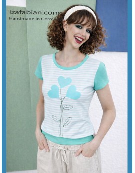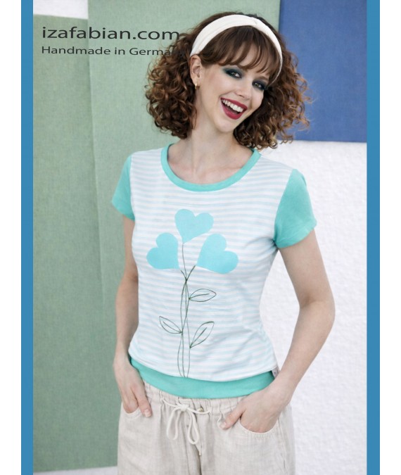 Dieses Shirt ist aus weichem Baumwolljersey in zarten Mint- und Pastellgrüntönen genäht. Die Vorder- und Rückseite sind mint-weiß gestreift,...