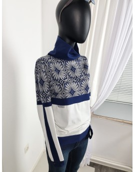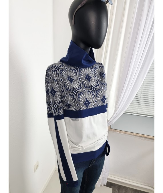 Ein feminines Longsleeve mit romantischen Details: Der eckige, leicht tiefere Halsausschnitt ist rundum mit einer violettblauen Blende...