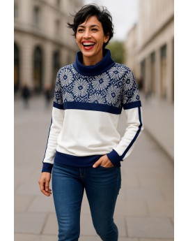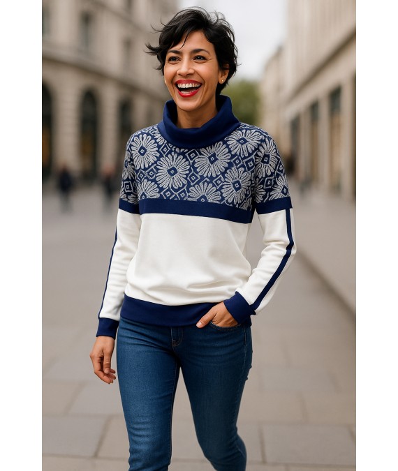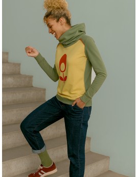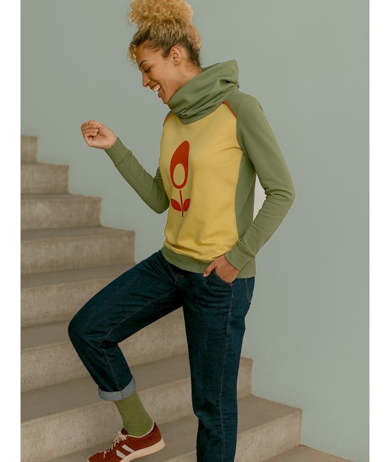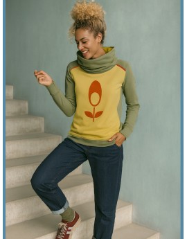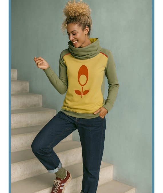 Ein legerer Jersey-Pullover mit 70s-Vibes: Ockergelb trifft Moosgrün, kombiniert mit einer cognacfarbenen Retro-Blume als Applikation – ein...