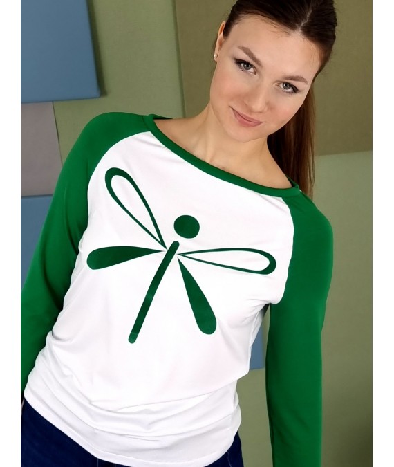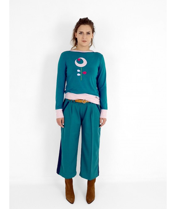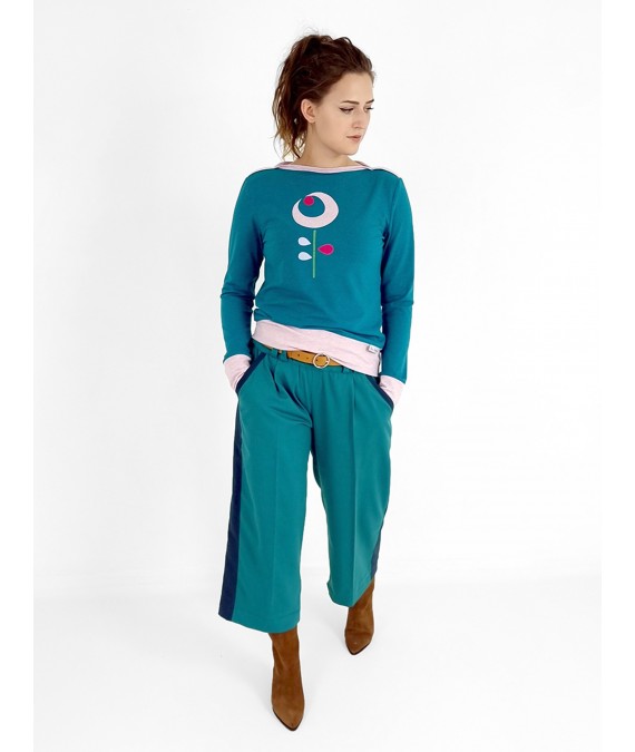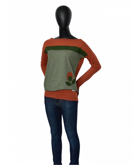Grün, Schwarz und bunt trifft aufeinander. Damen Longsleeve mit Doppelte Streifen und Retro Applikationen am Brust.