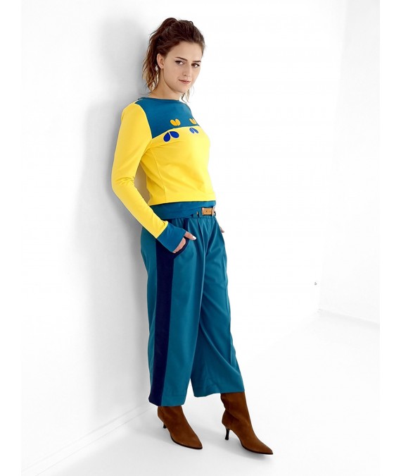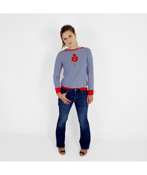 Sporty Longsleeve mit Royal blauen Streifen, Retro-Samt Blume und roten Einsätzen.