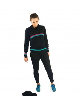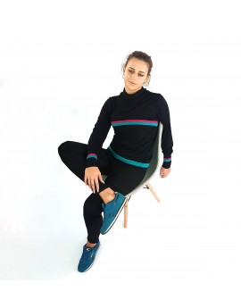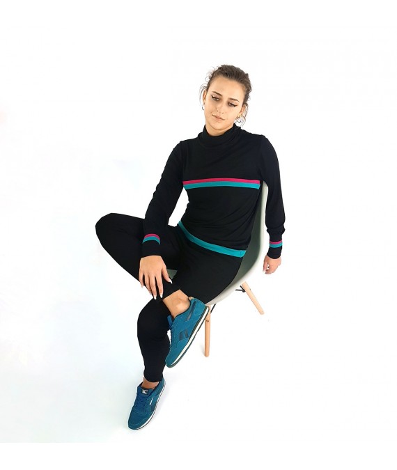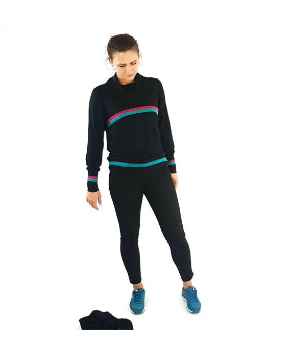 Schwarze Rollkragen Pullover mit Petrol/ Pink Streifen.