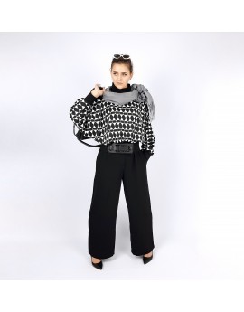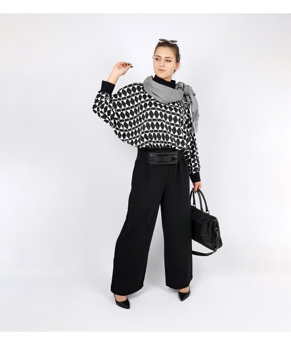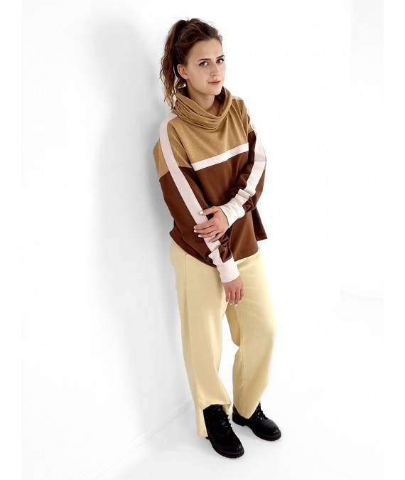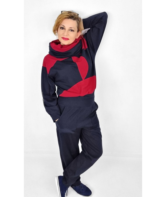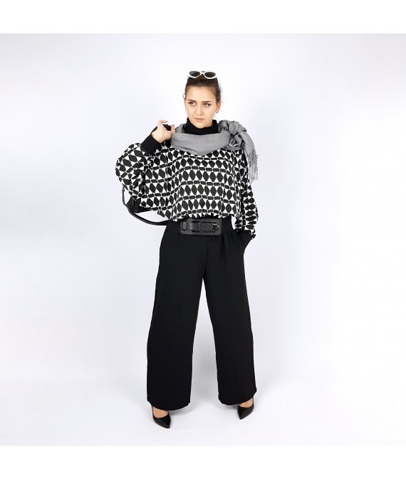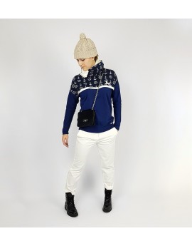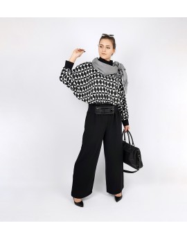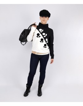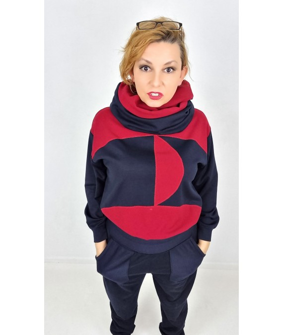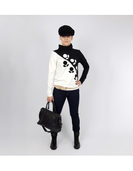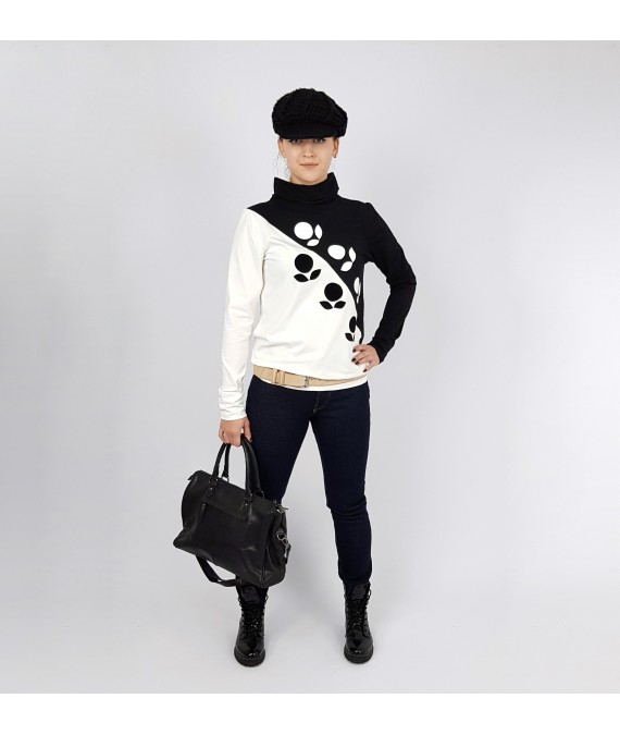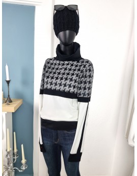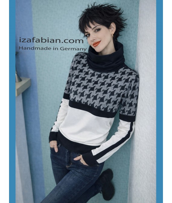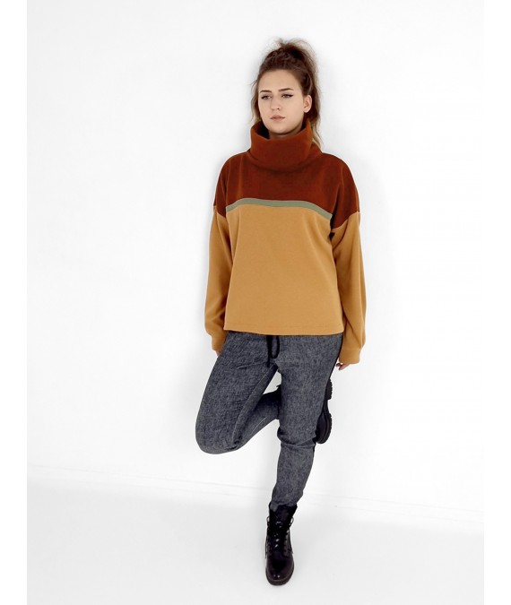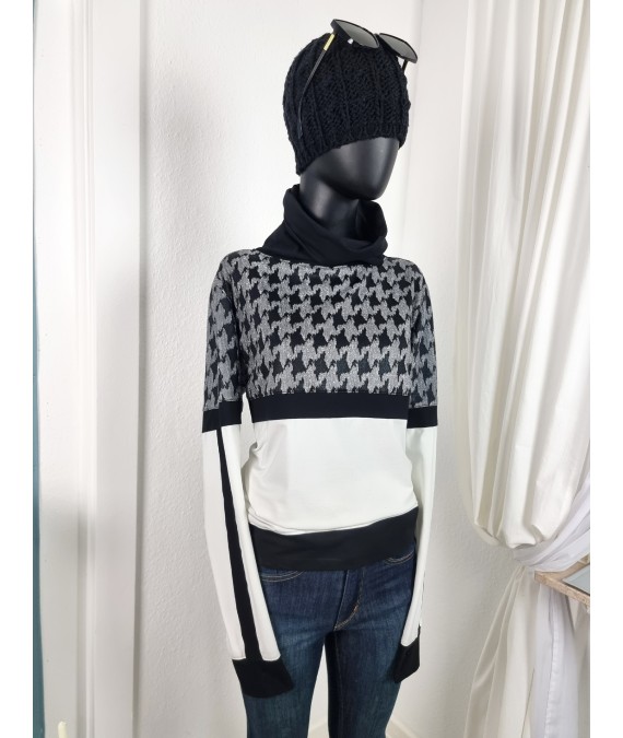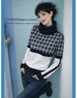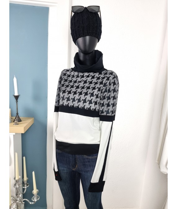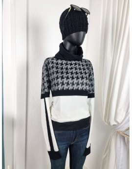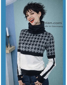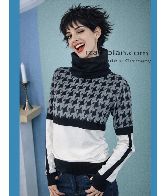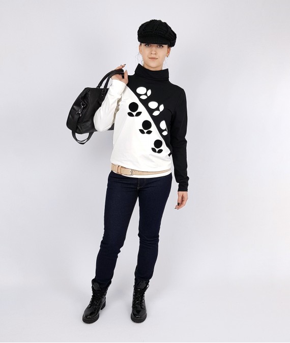 Zweifarbige Pullover mit Rollkragen. Retro Muster - Samt Applikationen.