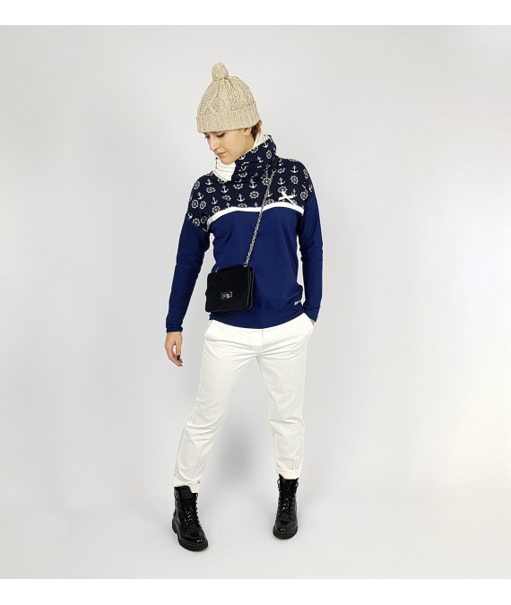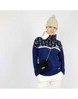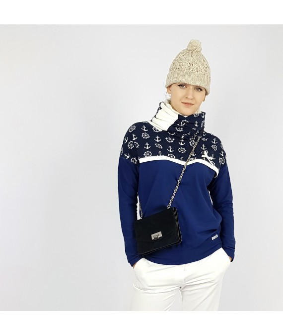 Locker sitzend, Ankermuster , Marineblau mit hochen Schlauchkragen.