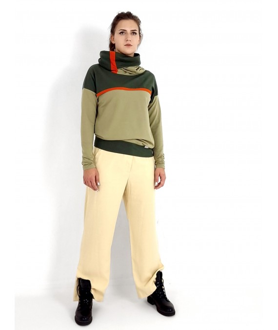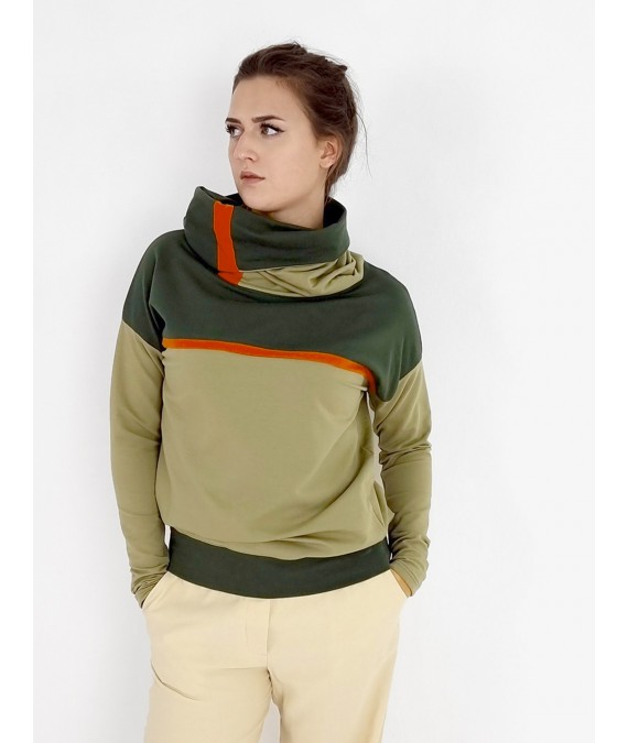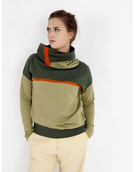 Locker sitzende Damen Hoodie in Armeegrün und Olive. Hohe Schlauch Kragen.