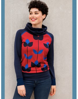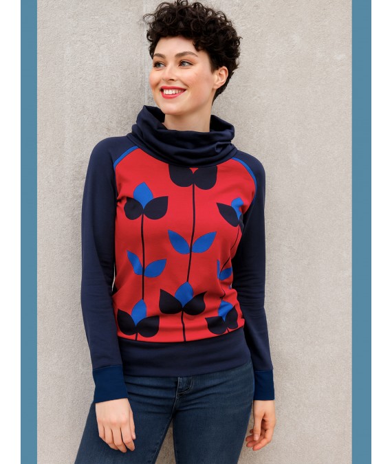 Ein Pullover im 70s-Retro-Look, der urbanen Style mit Gemütlichkeit verbindet. Die rote Front wird durch royal- und marineblaue Applikationen...