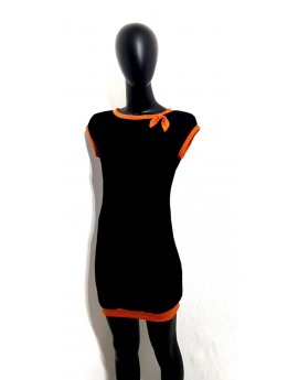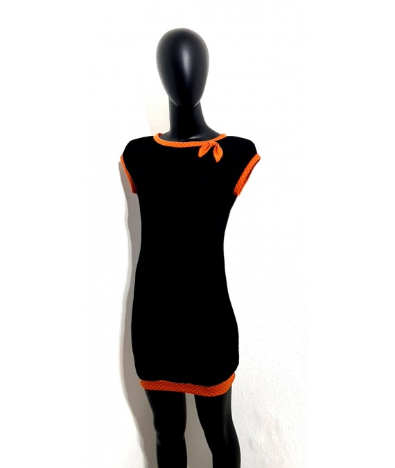 ...Lockeres Damen Kleid in Schwarz aus Viskosejersey in Top Qualität. Einsätze in Rost , fein gepunktet, Schleife abnehmbar.