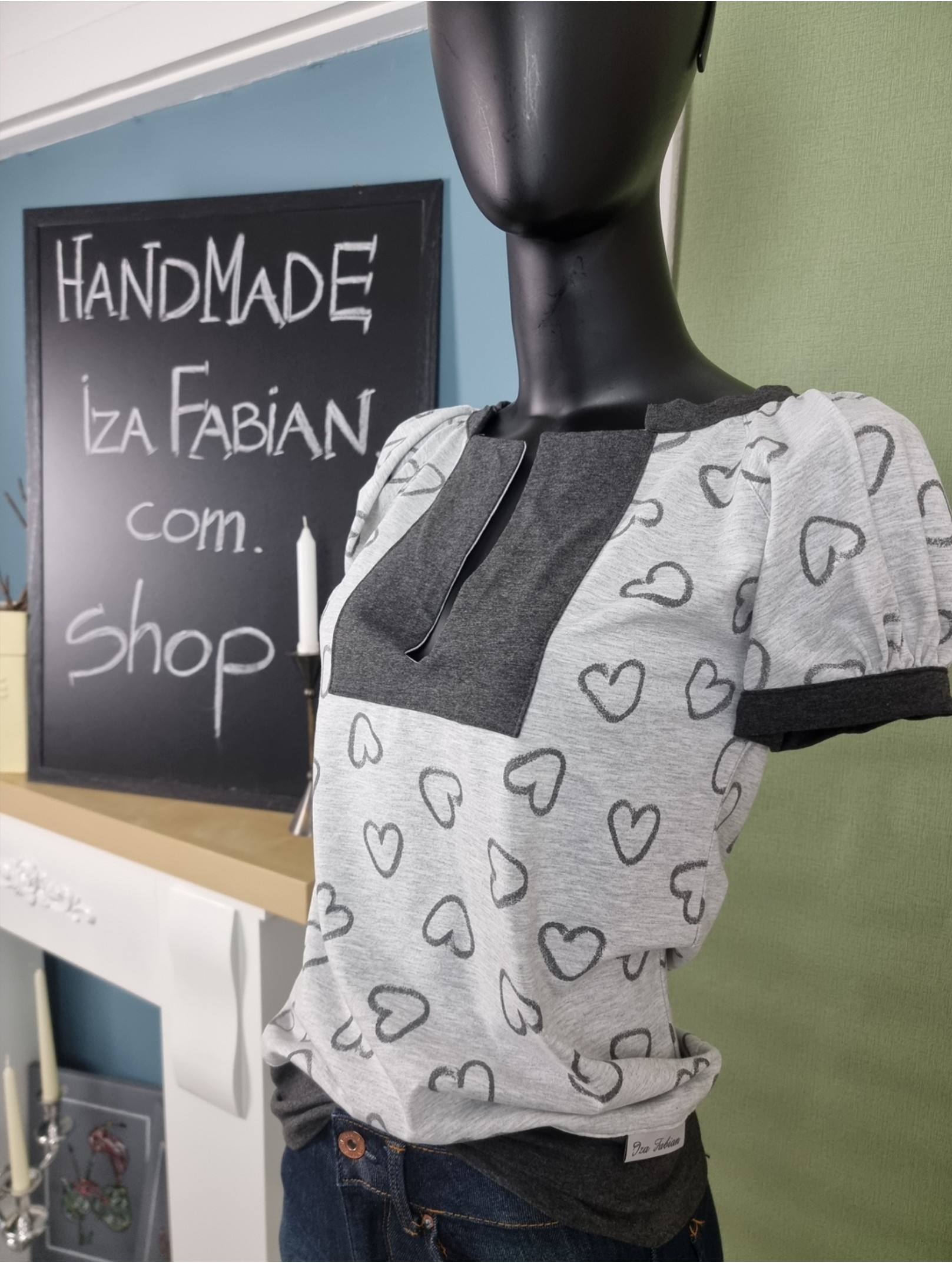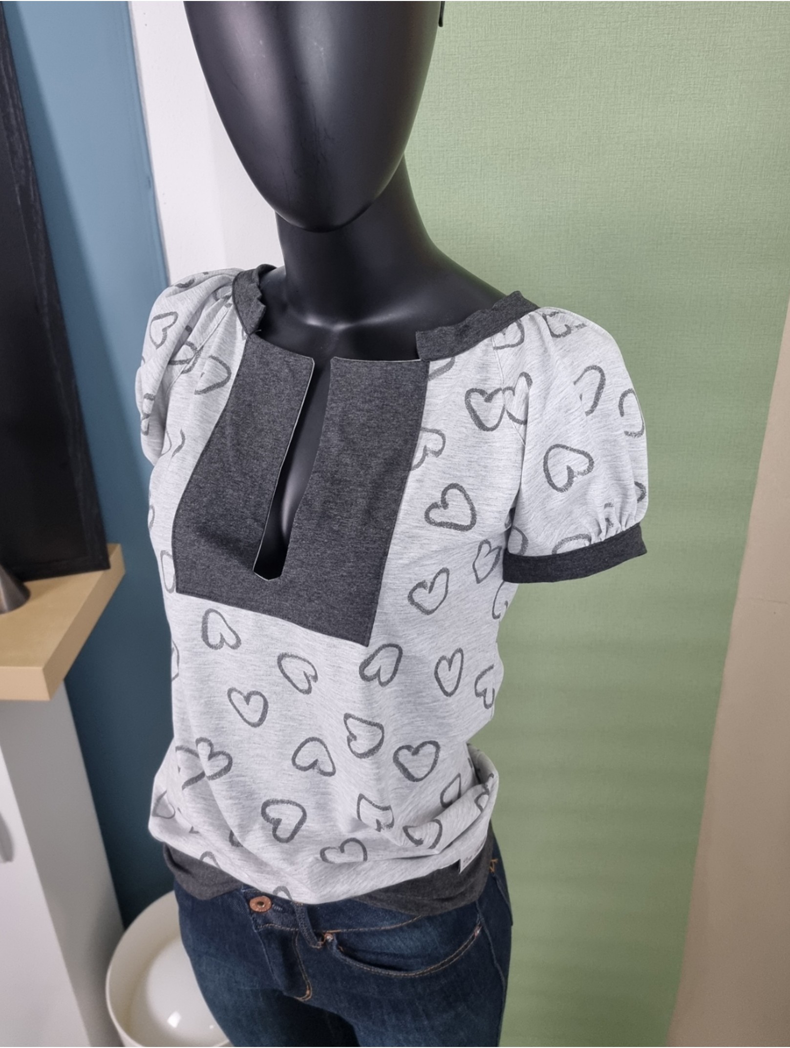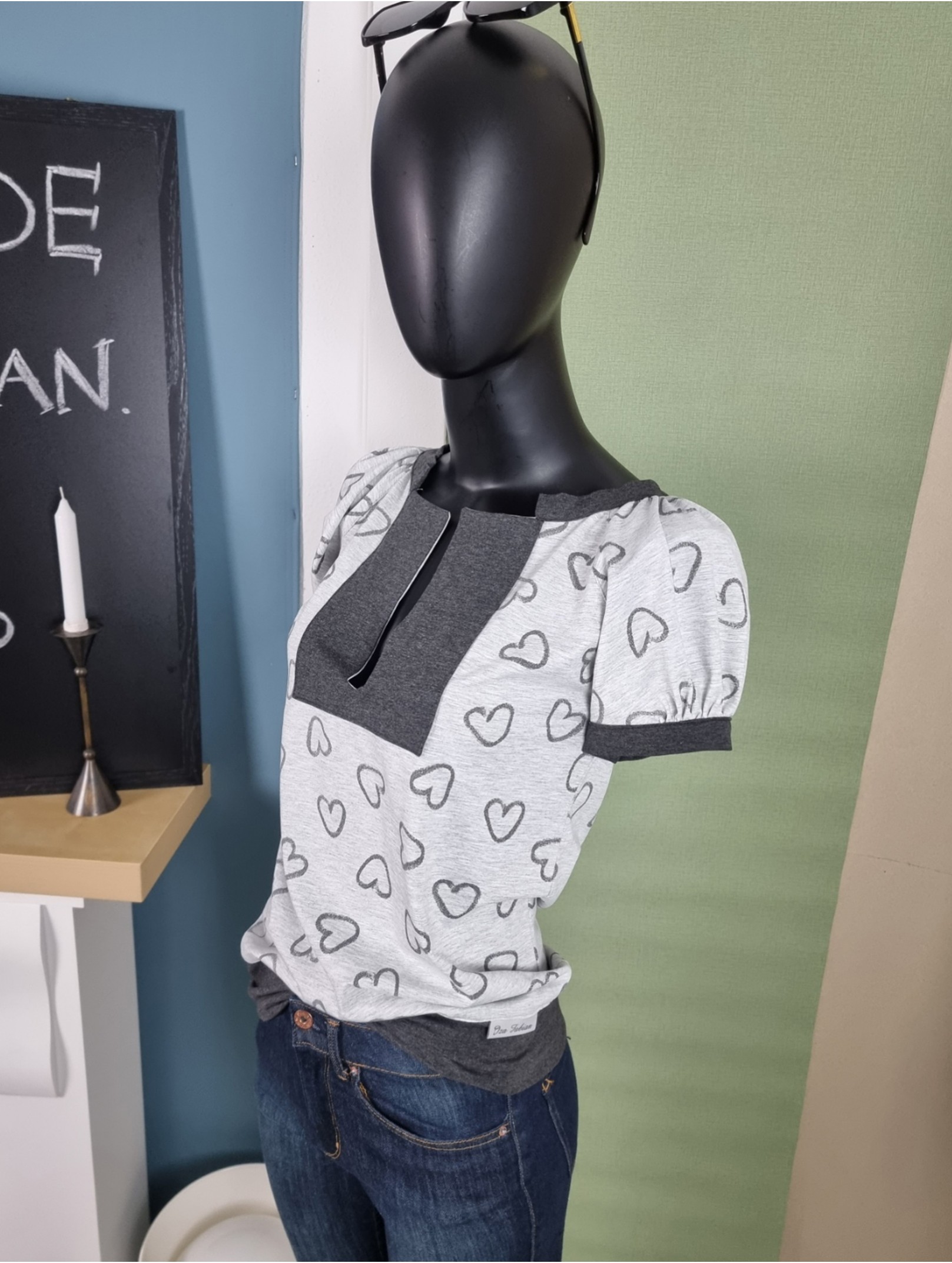 Dieses Shirt habe ich aus grau-meliertem Jersey mit feinem Herzmuster genäht. Der markante Schlitz-Ausschnitt wird von einer breiten, nach außen gearbeiteten Blende in Anthrazit betont – ein moderner Blickfang. Raglan-Schnitt mit gerafften Puffärmeln und schmalen Bündchen in Anthrazit sorgen für feminine Details. Der breite Bund unten lässt das Shirt locker in der Taille fallen.