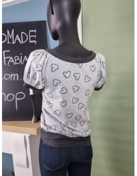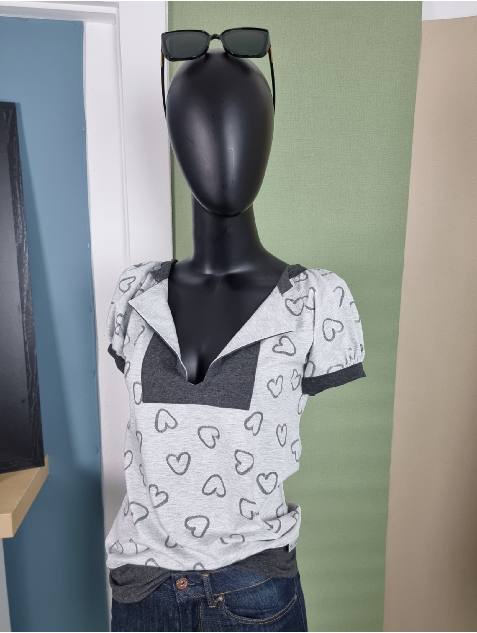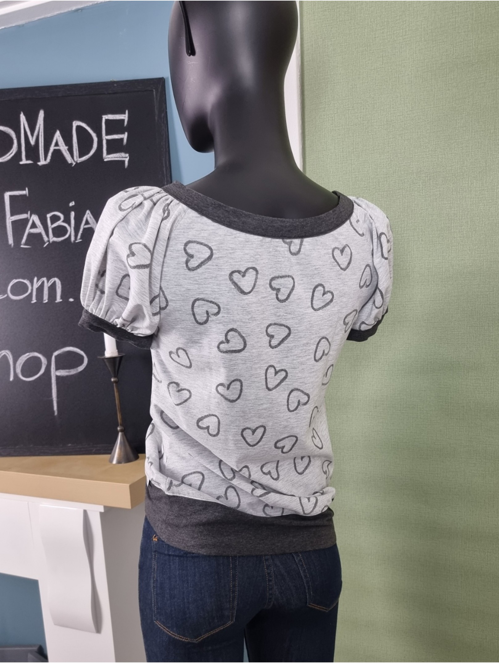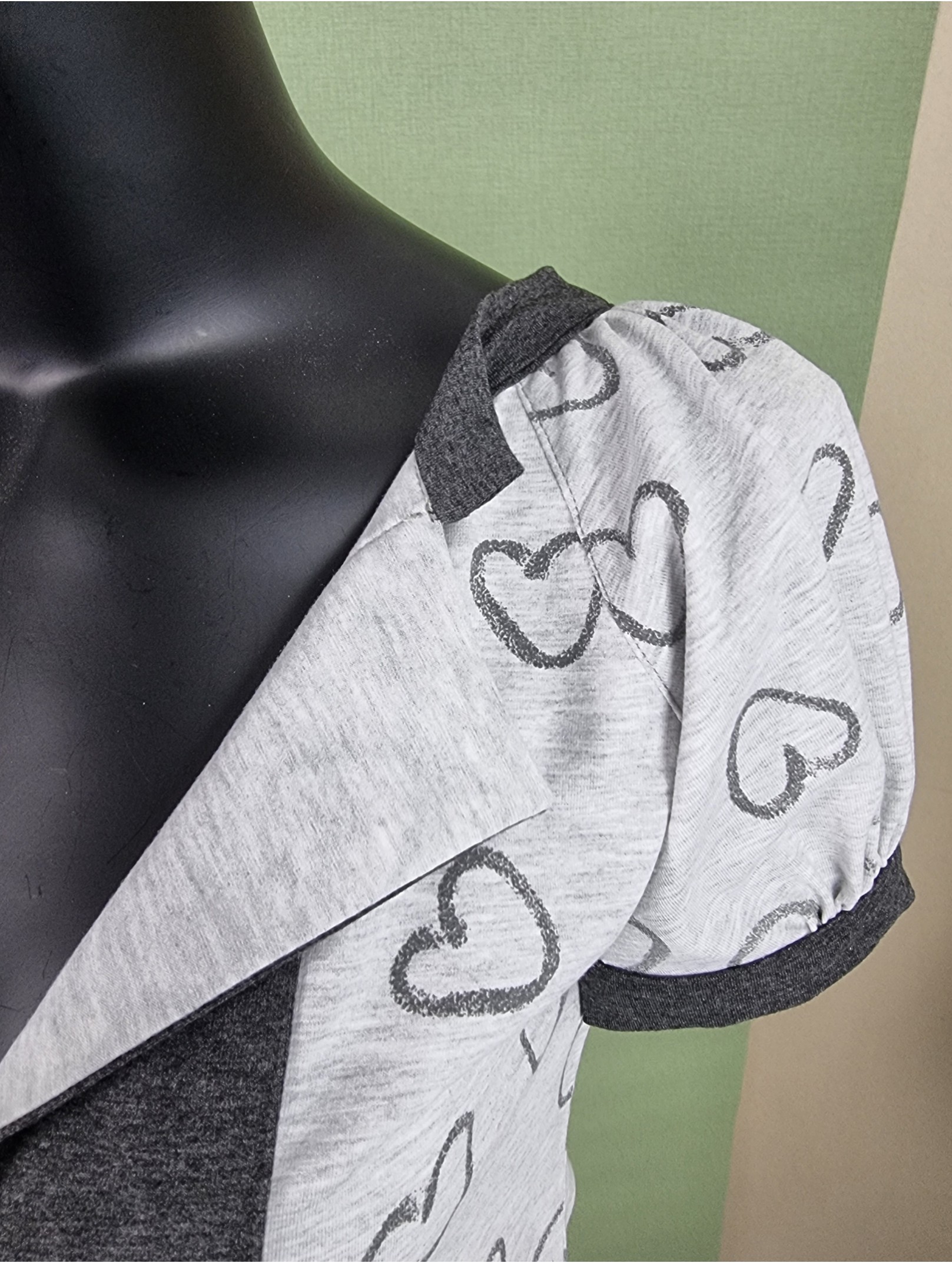 Dieses Shirt habe ich aus grau-meliertem Jersey mit feinem Herzmuster genäht. Der markante Schlitz-Ausschnitt wird von einer breiten, nach außen gearbeiteten Blende in Anthrazit betont – ein moderner Blickfang. Raglan-Schnitt mit gerafften Puffärmeln und schmalen Bündchen in Anthrazit sorgen für feminine Details. Der breite Bund unten lässt das Shirt locker in der Taille fallen.