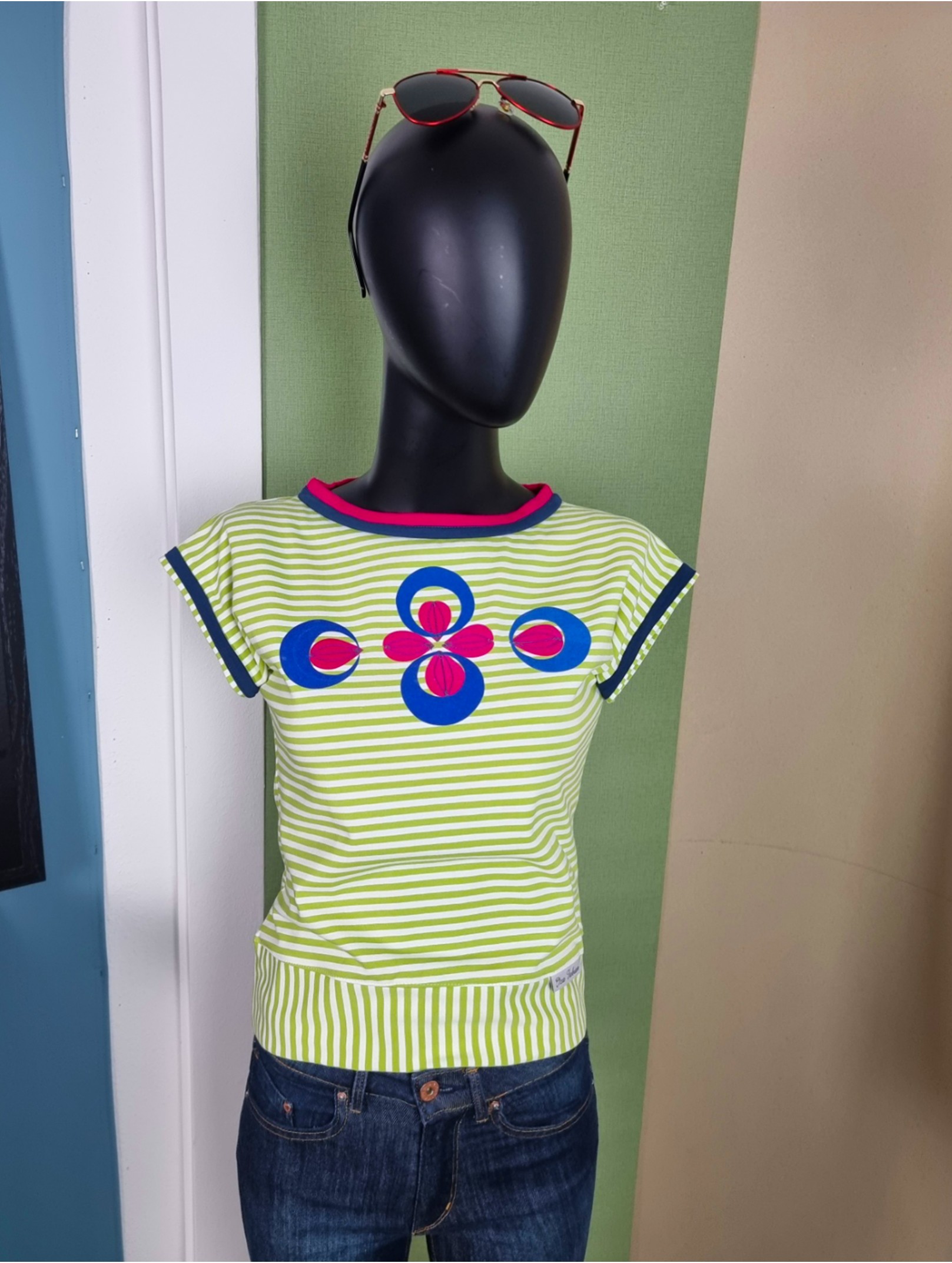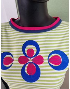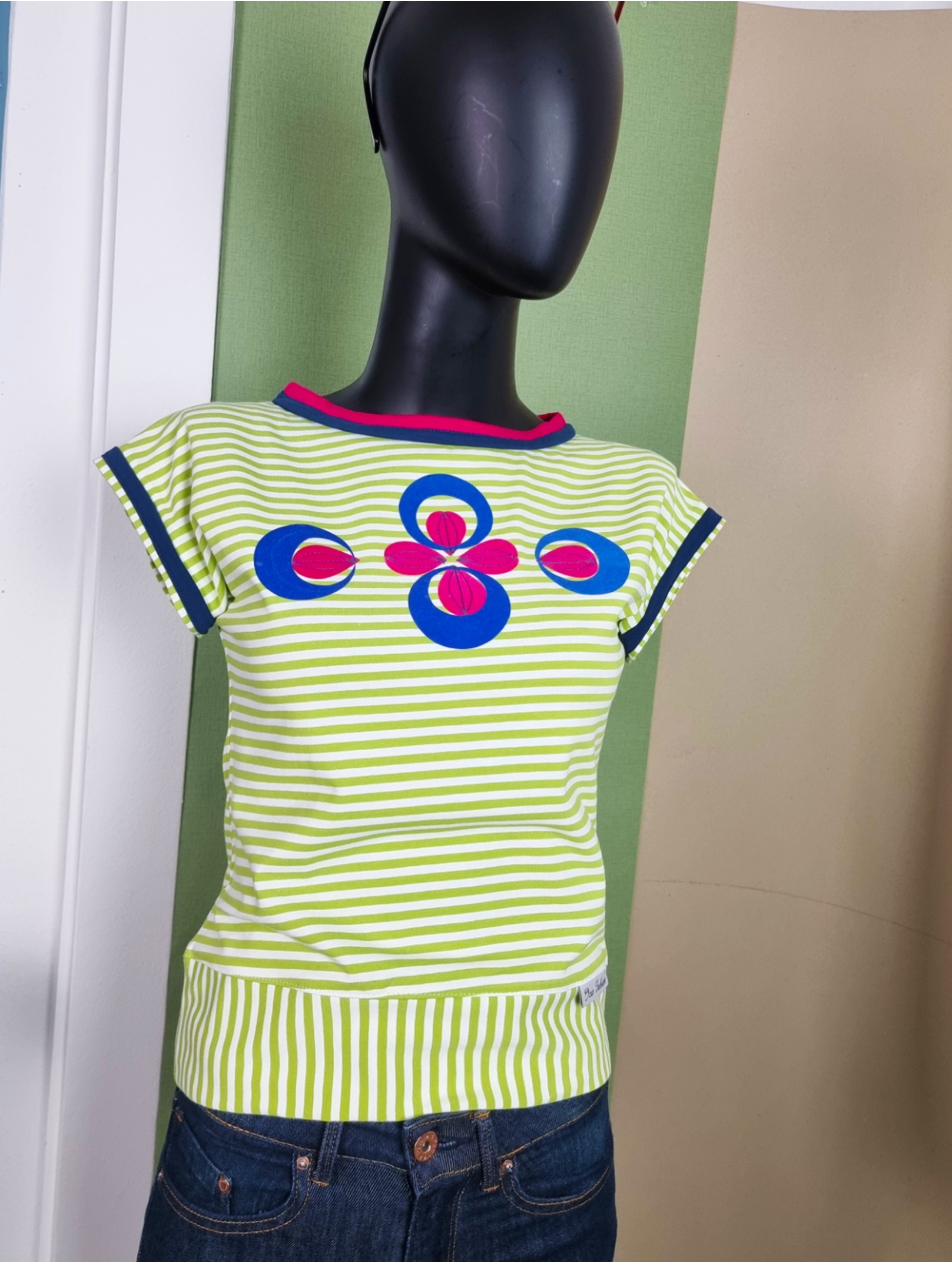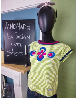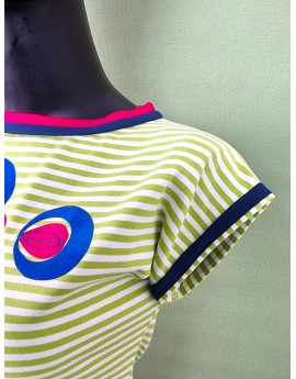 Dieses Shirt ist handgefertigt und streng limitiert – inspiriert vom Retro-Style der 80er! Ich habe es aus weichem Baumwolljersey mit frischen Limone-Weiß-Streifen genäht. Der gerade, lockere Schnitt mit markanter V-Linie macht es perfekt für High-Waist-Styles. Die Schulterpartie ist leicht überschnitten und geht in kleine Ärmelansätze über, die mit petrolblauen Streifen verziert sind. Für extra Akzente sorgt der zweifarbige Ausschnitt in kräftigem Fuchsia und Petrol. Auf der Brust: ein Flock-Muster in Royalblau und Fuchsia, fein bestickt.