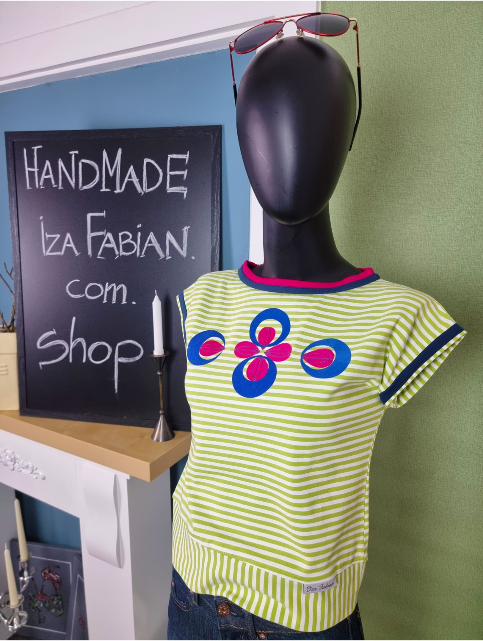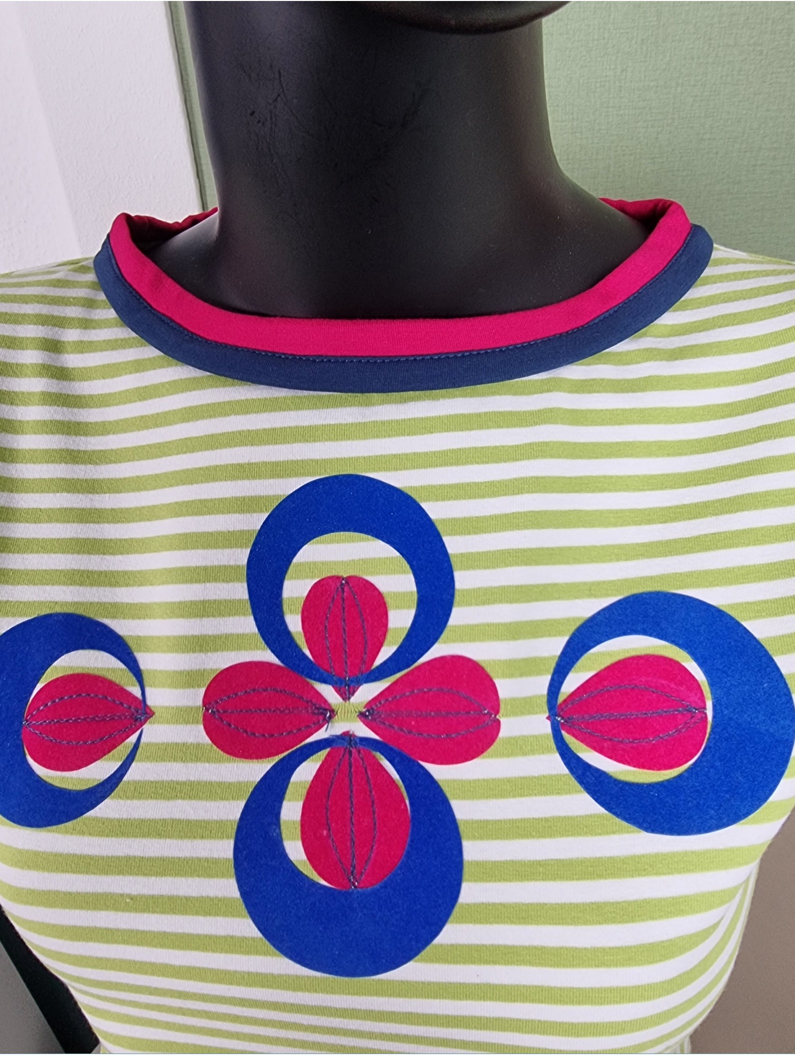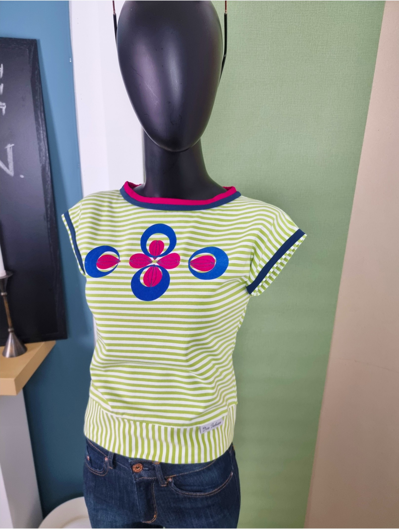 Dieses Shirt ist handgefertigt und streng limitiert – inspiriert vom Retro-Style der 80er! Ich habe es aus weichem Baumwolljersey mit frischen Limone-Weiß-Streifen genäht. Der gerade, lockere Schnitt mit markanter V-Linie macht es perfekt für High-Waist-Styles. Die Schulterpartie ist leicht überschnitten und geht in kleine Ärmelansätze über, die mit petrolblauen Streifen verziert sind. Für extra Akzente sorgt der zweifarbige Ausschnitt in kräftigem Fuchsia und Petrol. Auf der Brust: ein Flock-Muster in Royalblau und Fuchsia, fein bestickt.