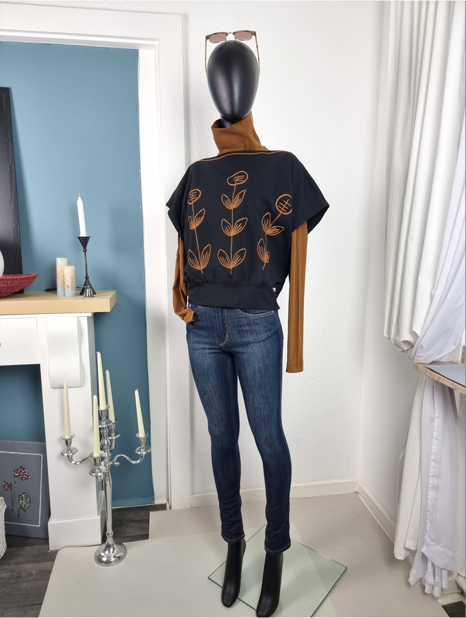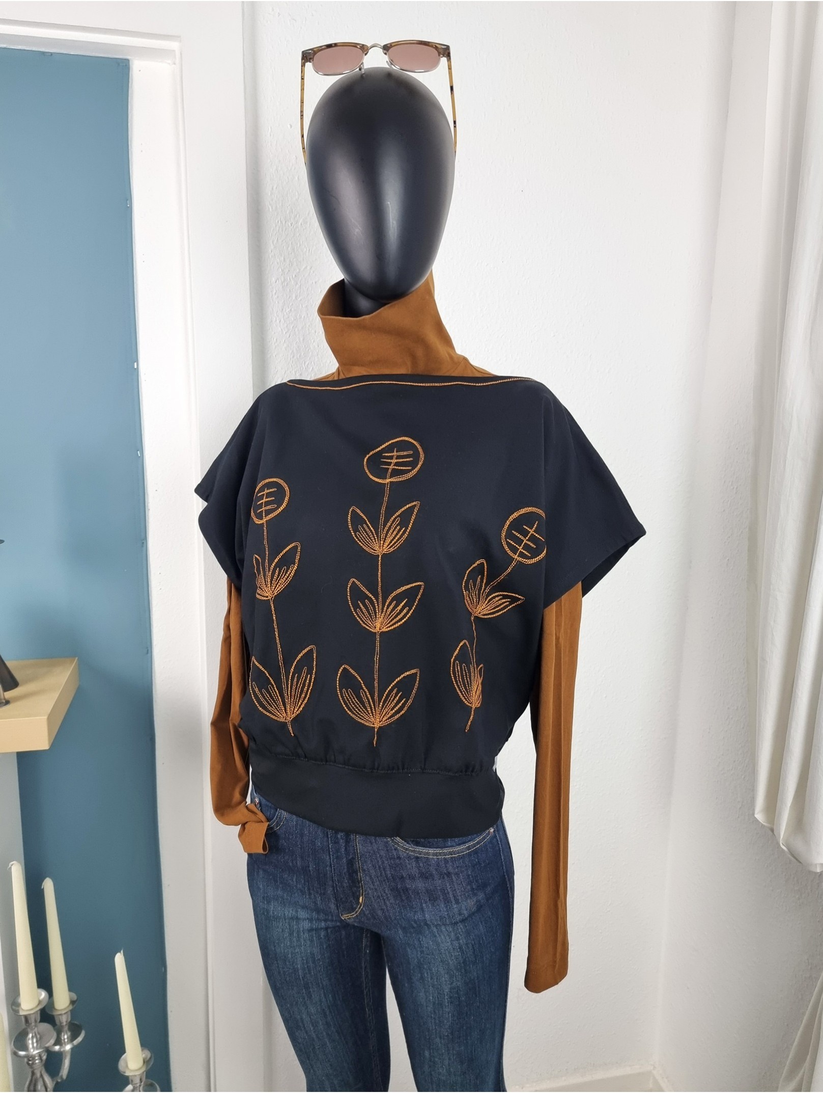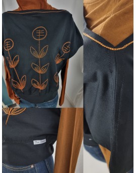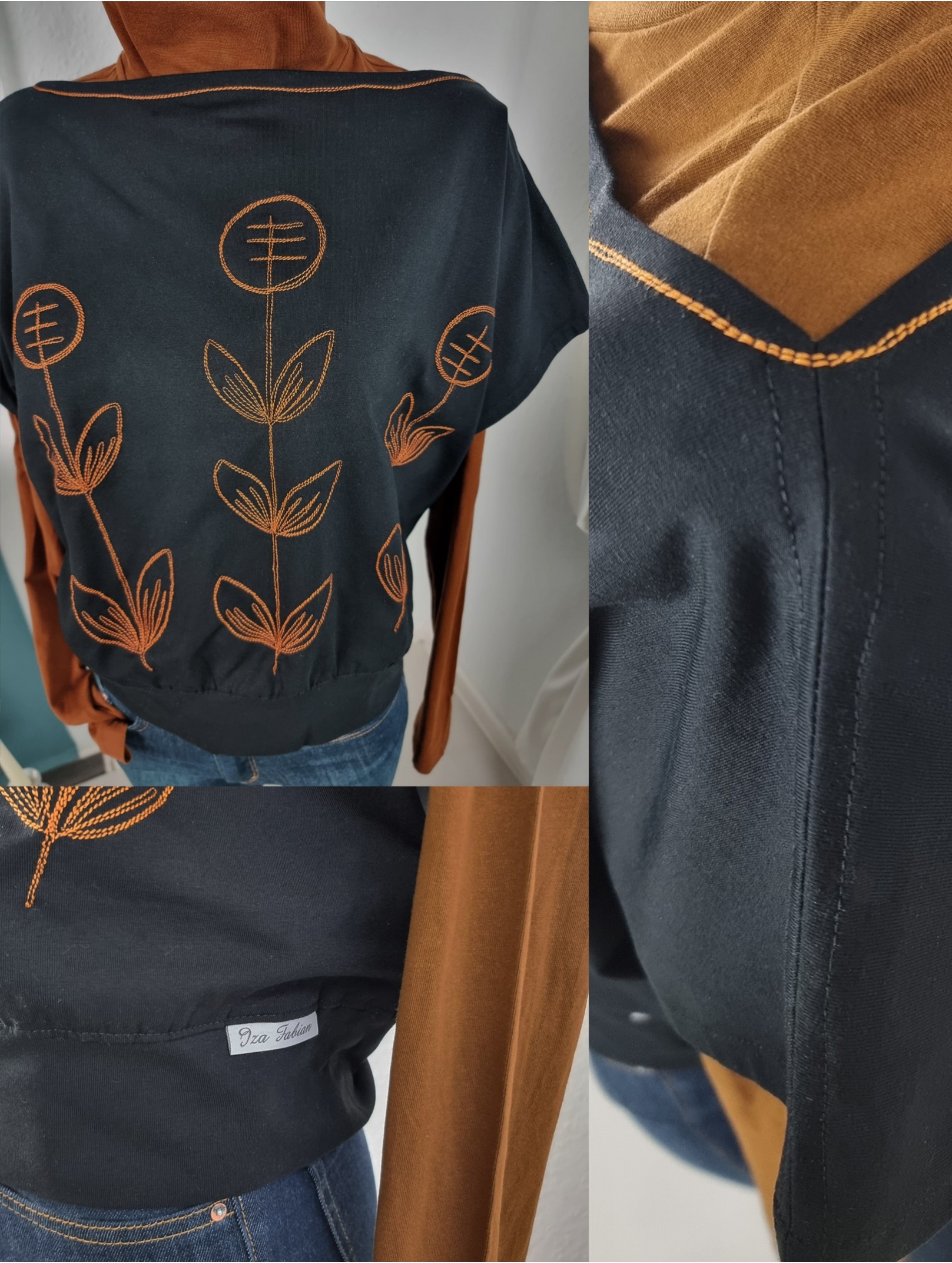 U-Boot-Ausschnitt mit folkloristischer Stickerei in Cognac – doppelte Zierstiche rund um Hals & Front