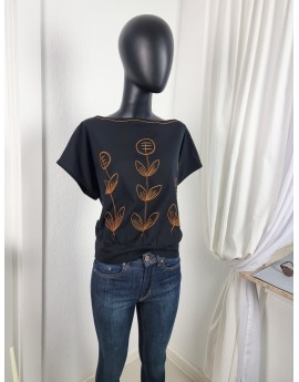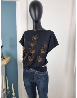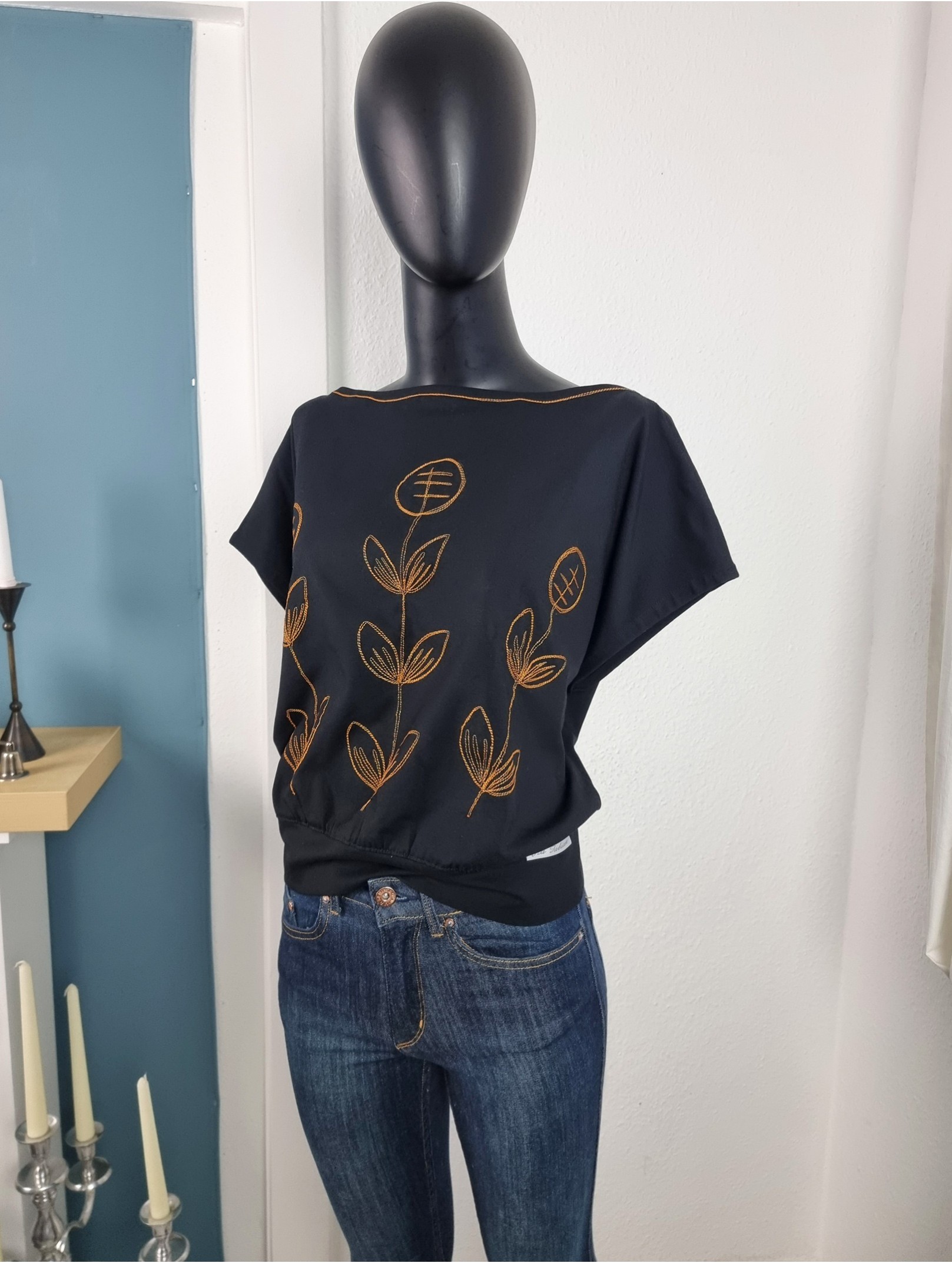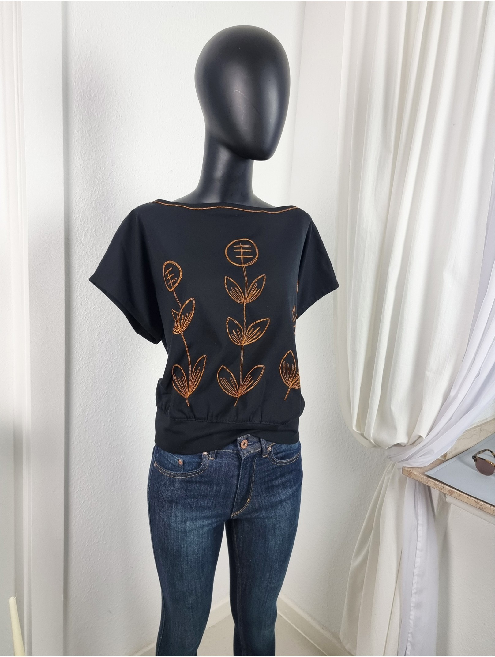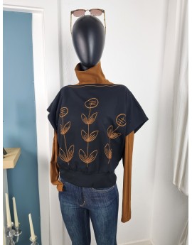 U-Boot-Ausschnitt mit folkloristischer Stickerei in Cognac – doppelte Zierstiche rund um Hals & Front