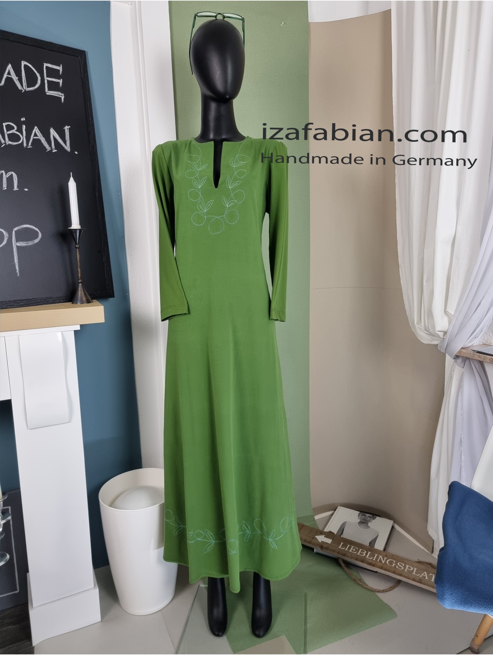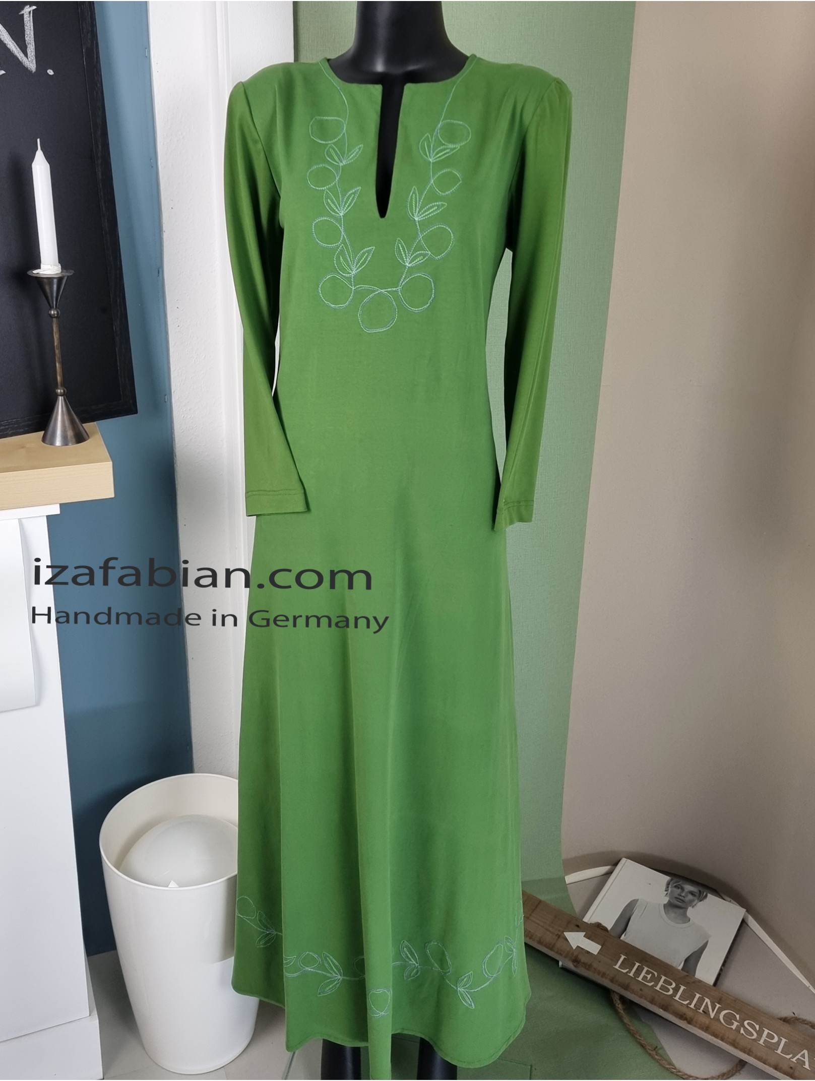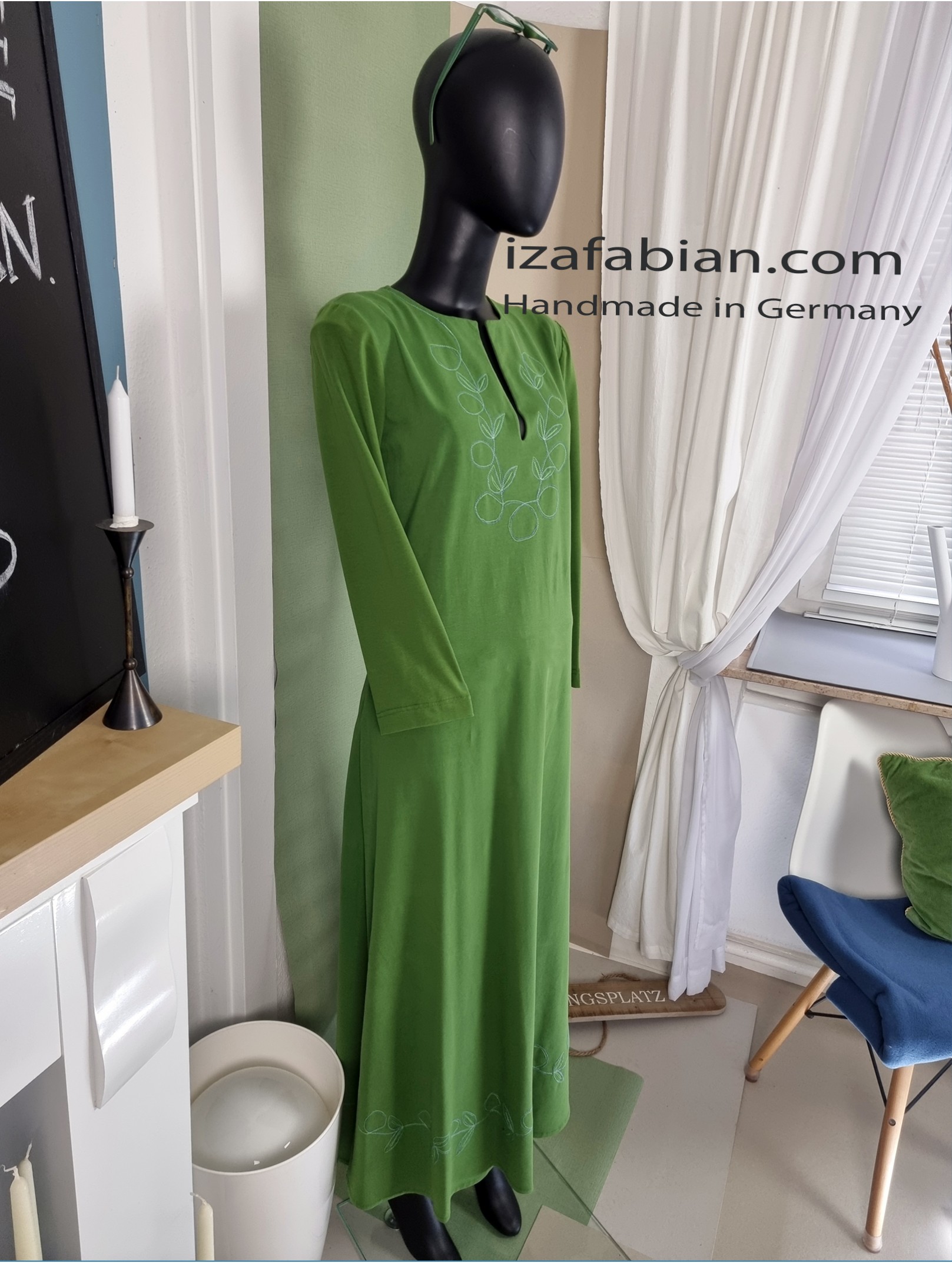 Ein elegantes, unkompliziertes Kleid für Alltag und besondere Momente: Dieses lange Jersey-Kleid verbindet klare Linien mit feinen Stickereidetails und wirkt dadurch feminin, ruhig und modern zugleich.