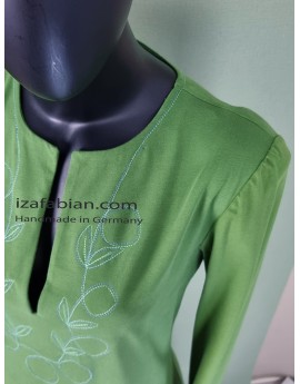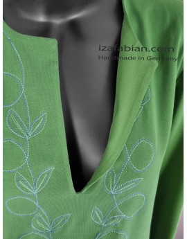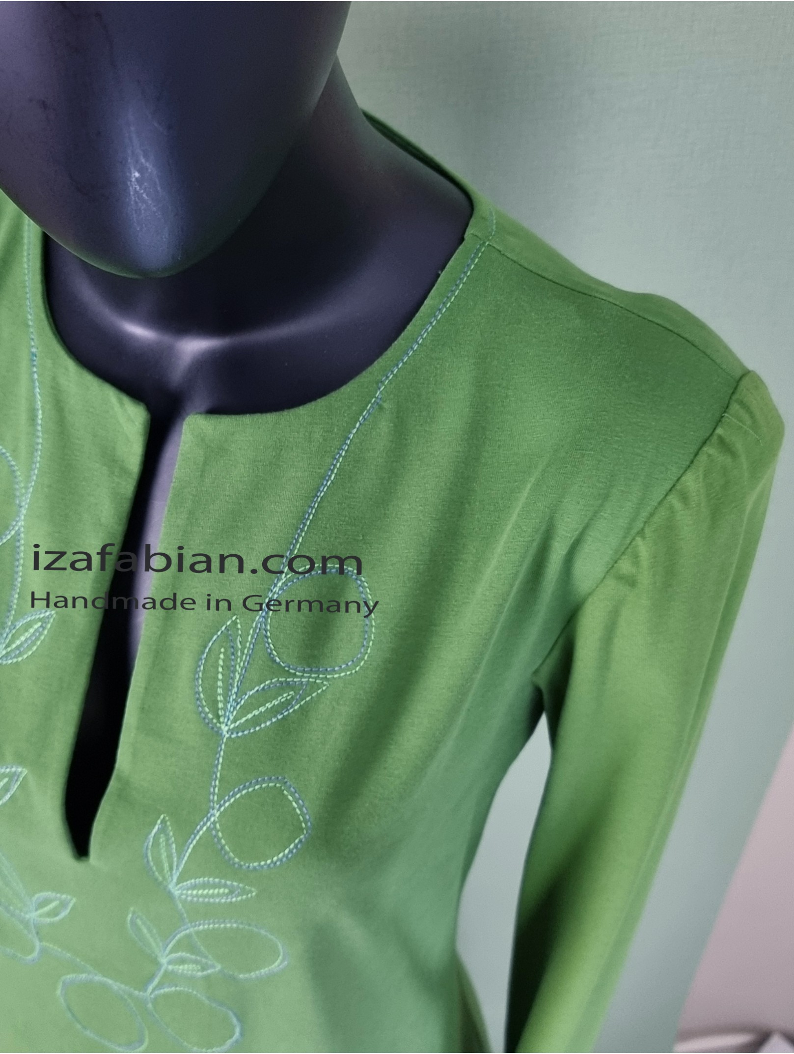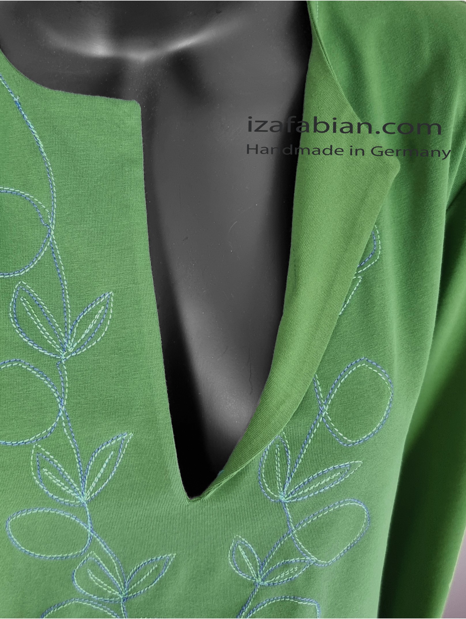 • Tiefer Schlitz vorne, eingerahmt von floralen Stickereien