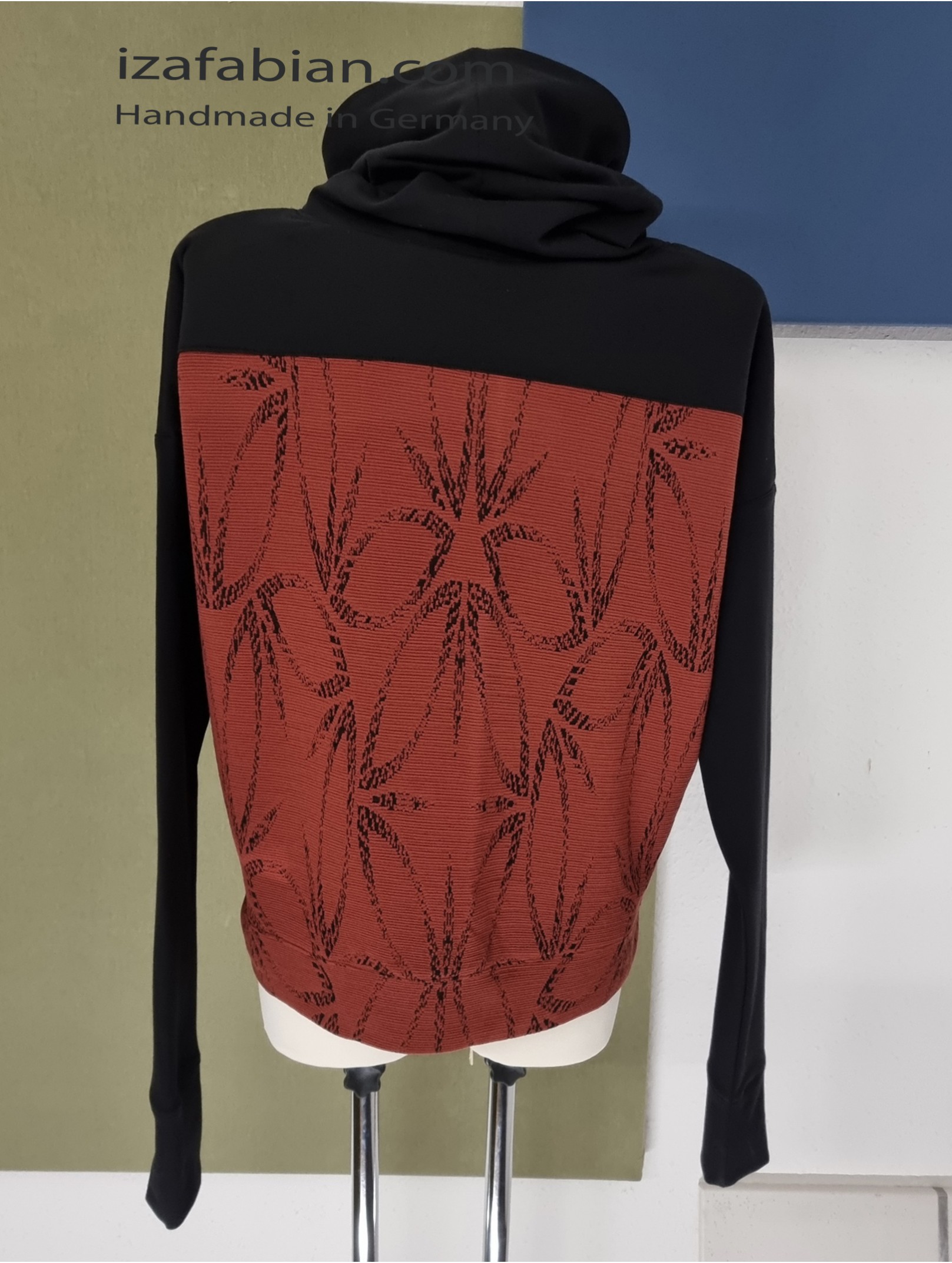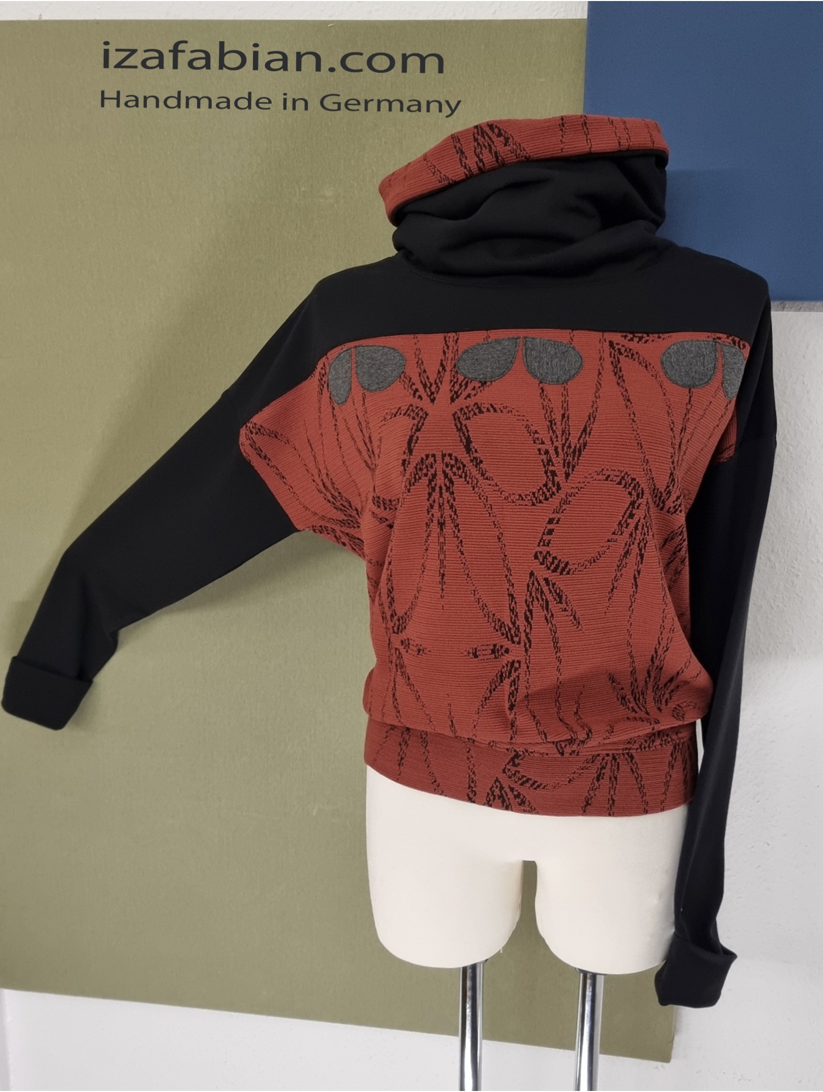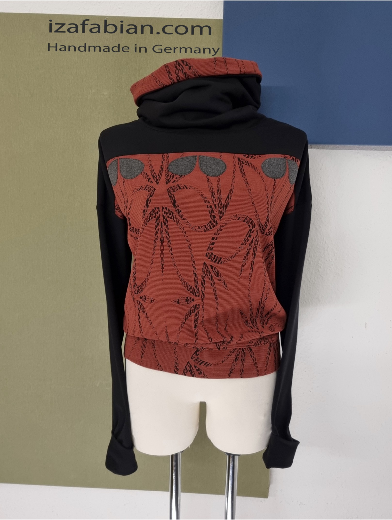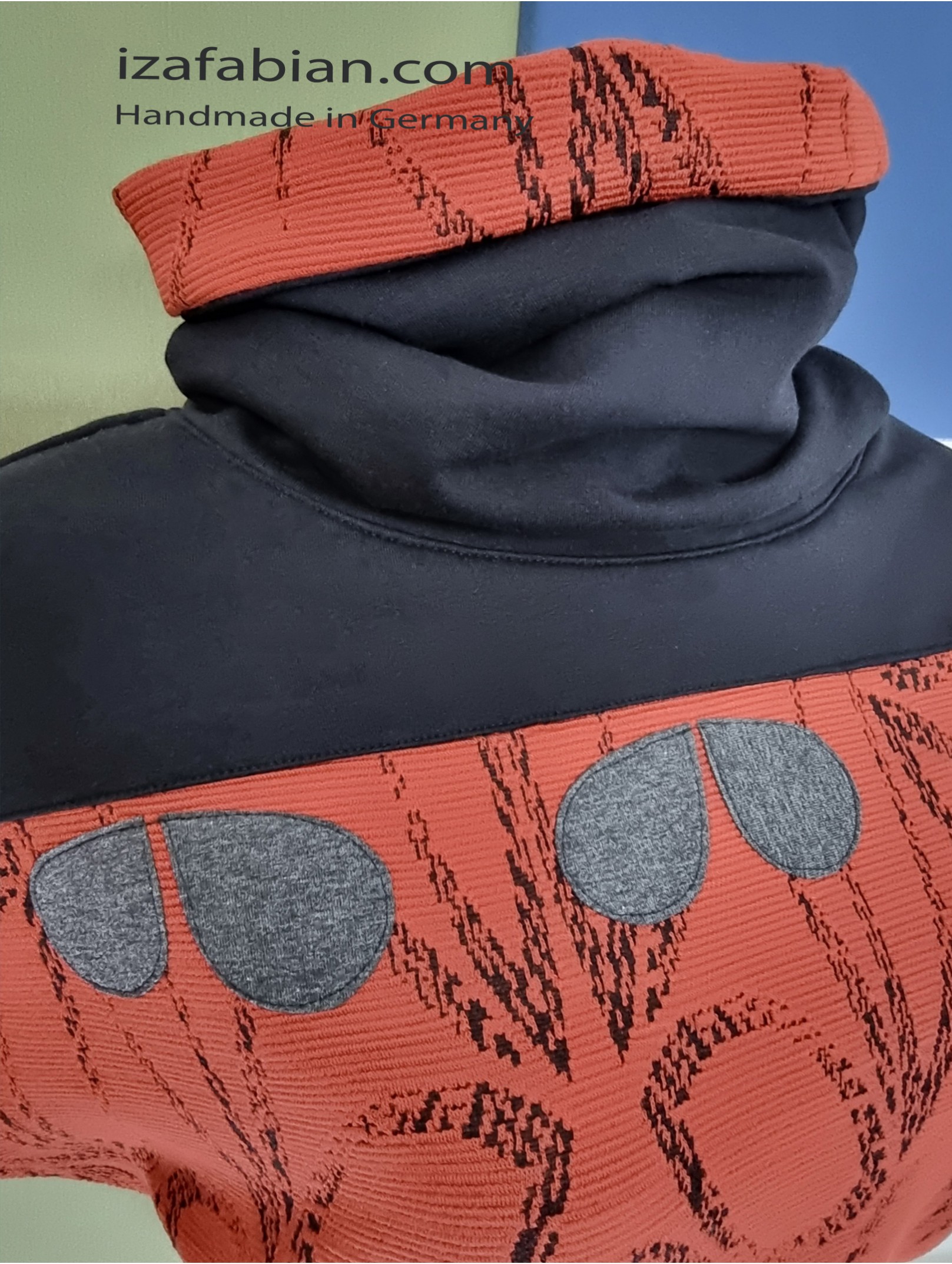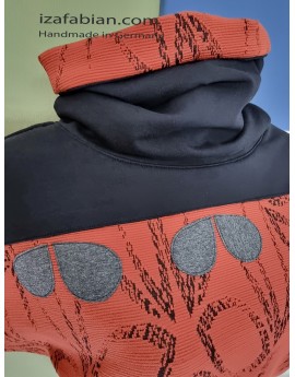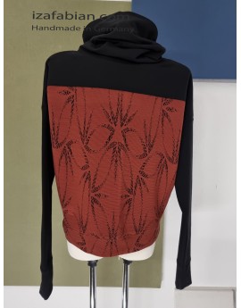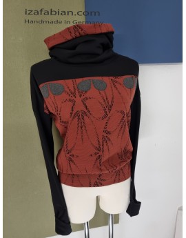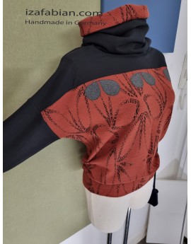 Front mit Passe in Schwarz und dunkelgraue Applikationen, Rücken nur mit Passe. Anliegende Bund unten. Stoffe: Kombi aus Polyester Jacquard in Ziegelrot & schwarze Baumwolljersey mit Elasthan.