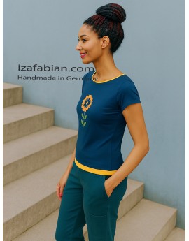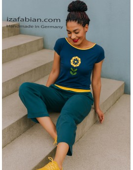 Ein lässiges, weiches Jersey-Shirt im modernen Retro-Look. Die applizierten Blumen aus Stoff und kleinen Einsätzen in Kiwigrün machen es zu einem charmanten Eyecatcher – sportlich, bequem und ideal für den Alltag.