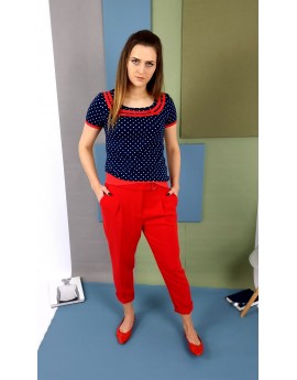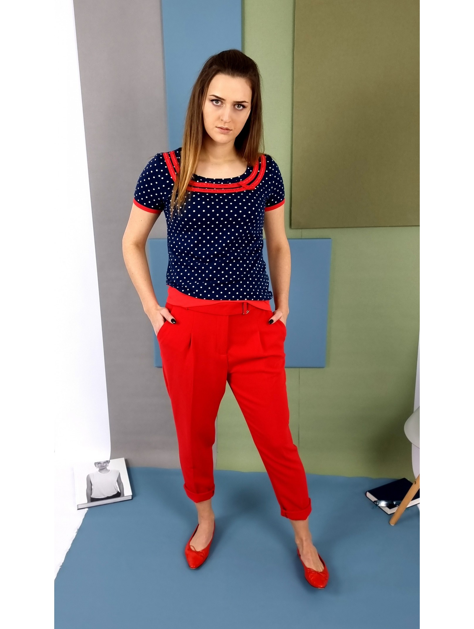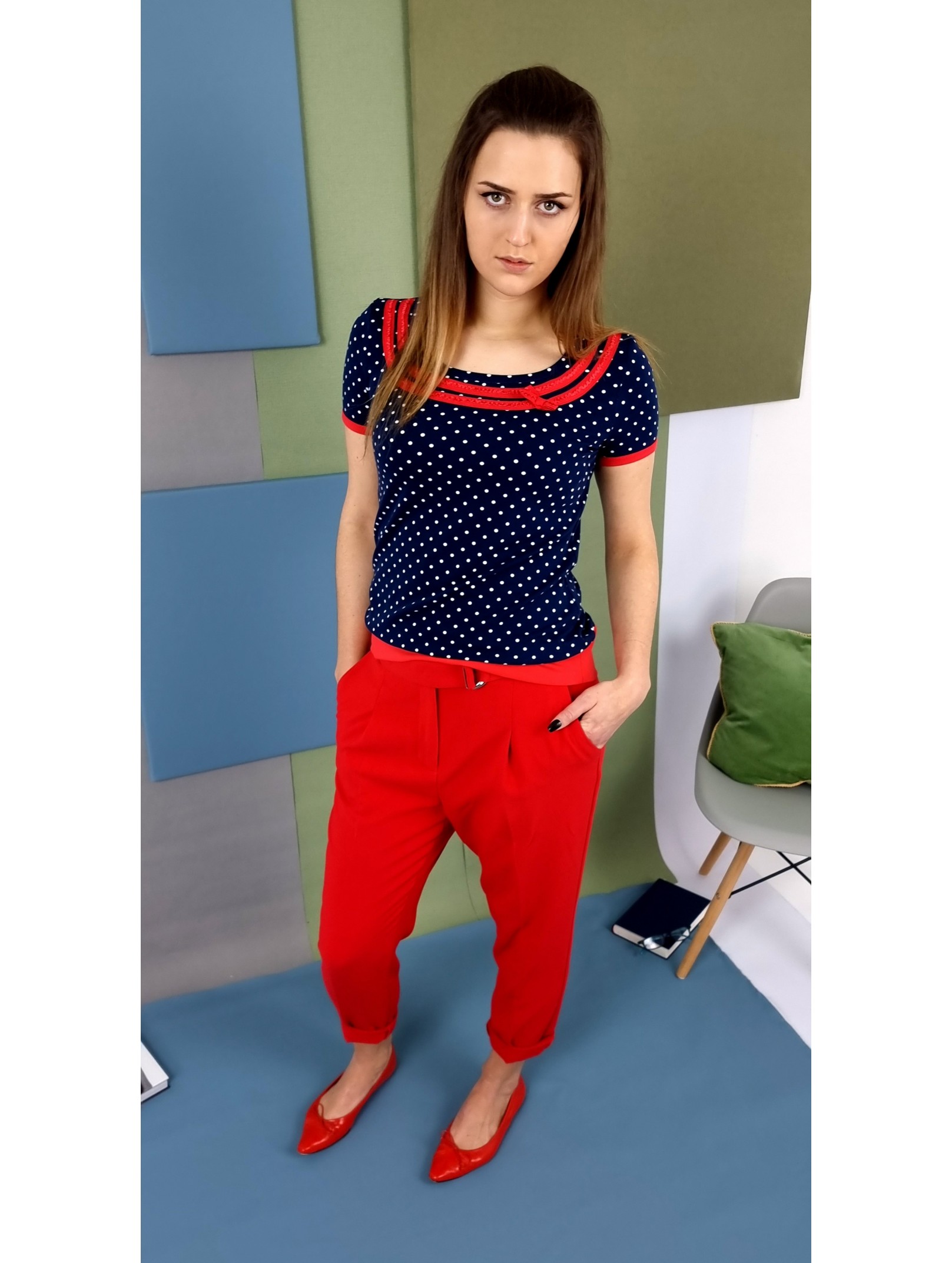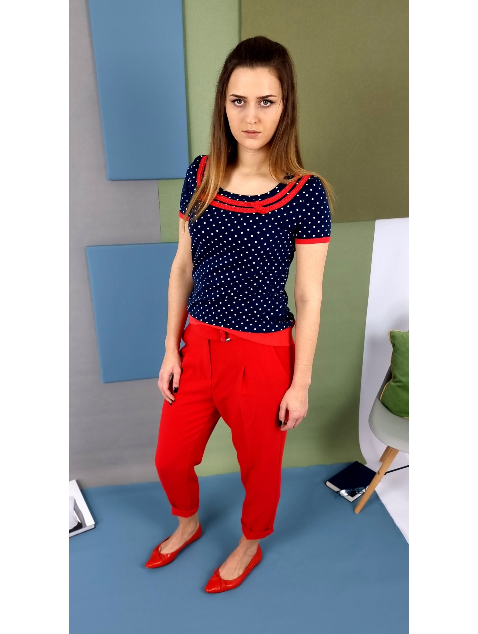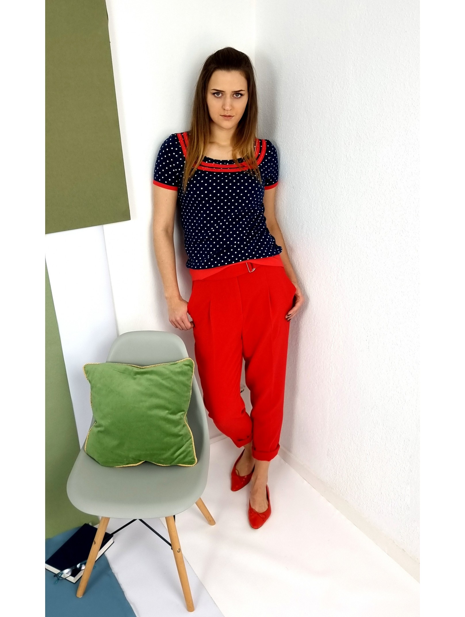 Blaue Shirt mit Punkten und roten Einsätzen.