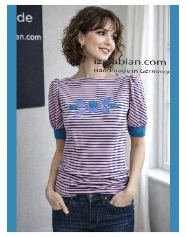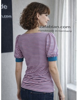 Ein Shirt, das Retro-Eleganz mit urbaner Lässigkeit verbindet. Aus altrosa Baumwolljersey mit petrolgrünen Streifen gefertigt, wirkt es lebendig und vielseitig.