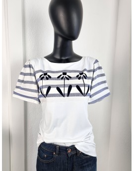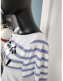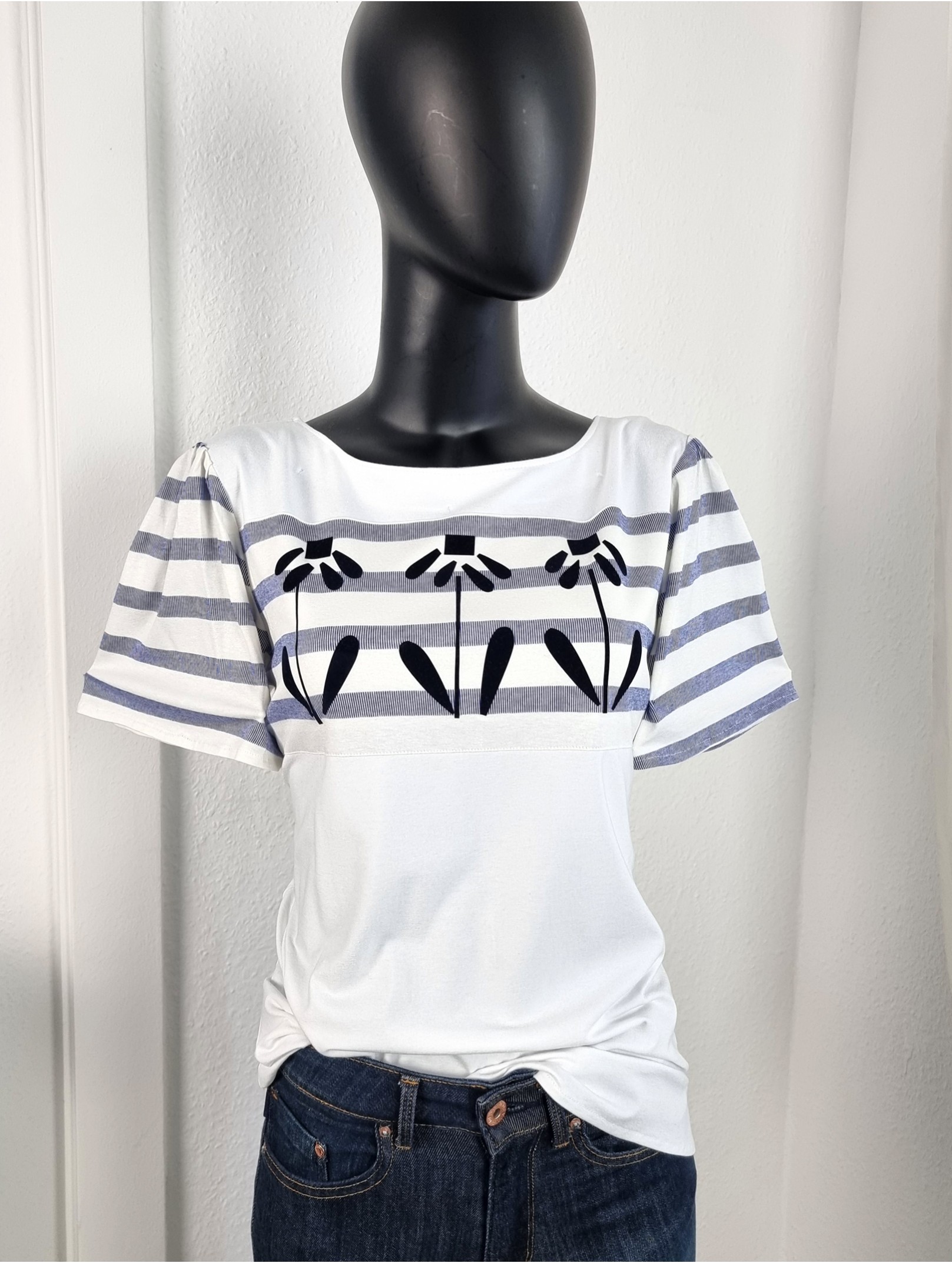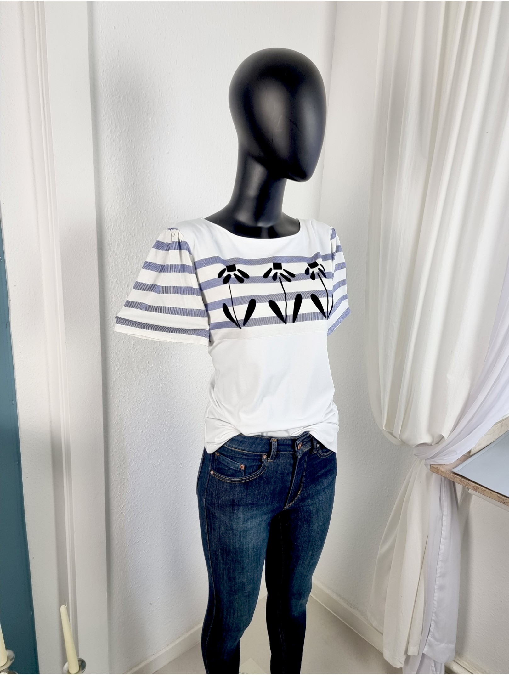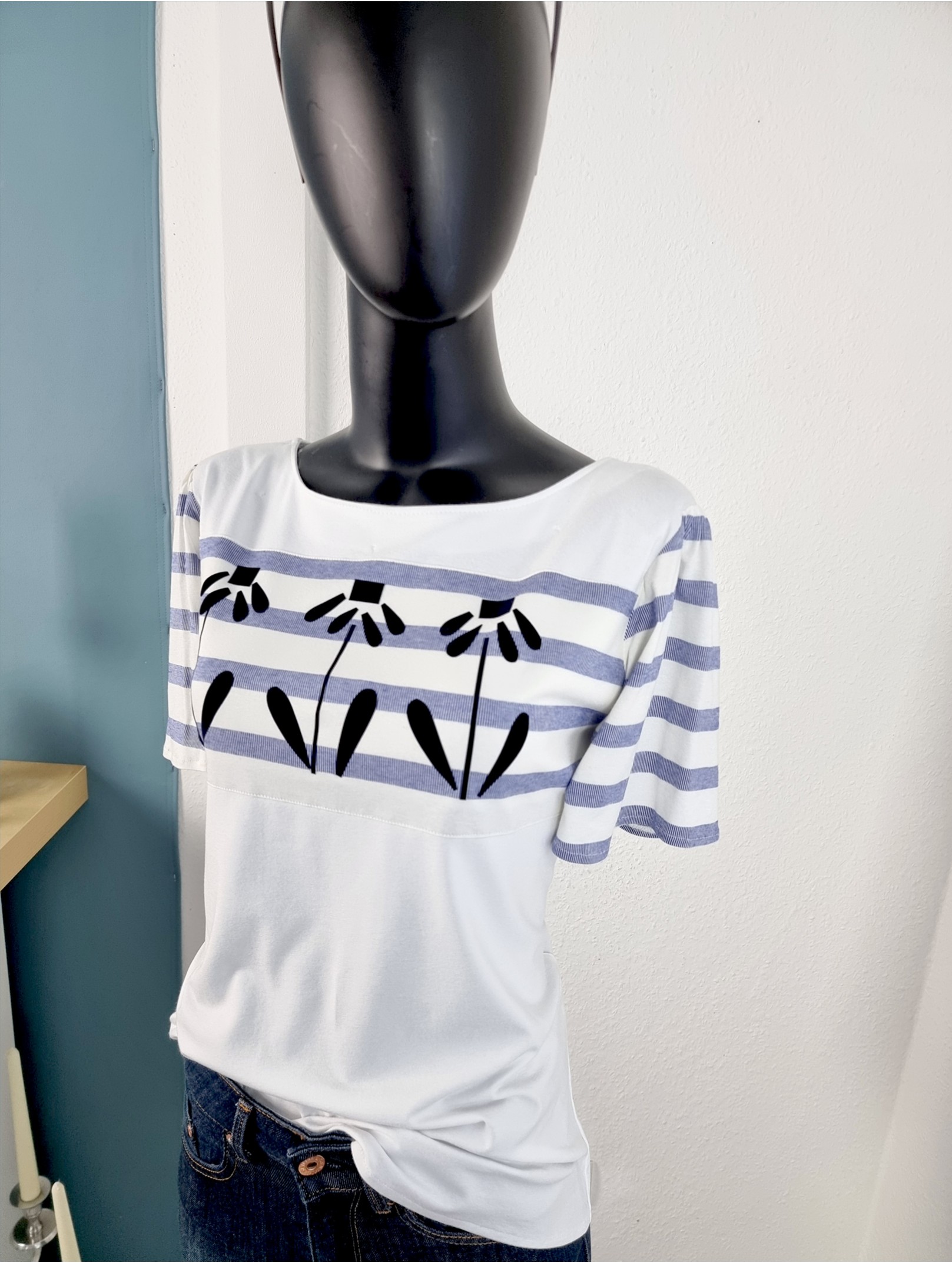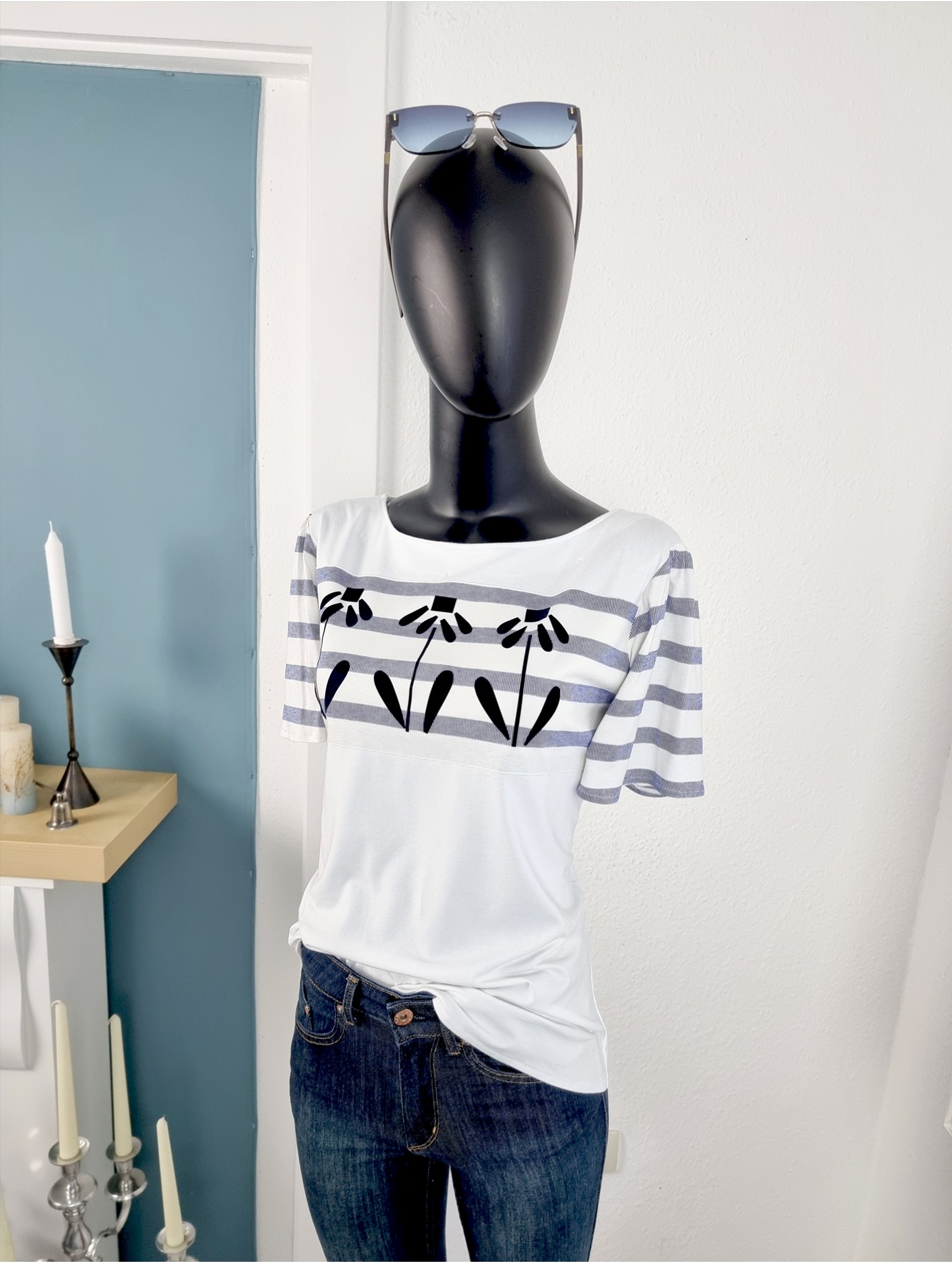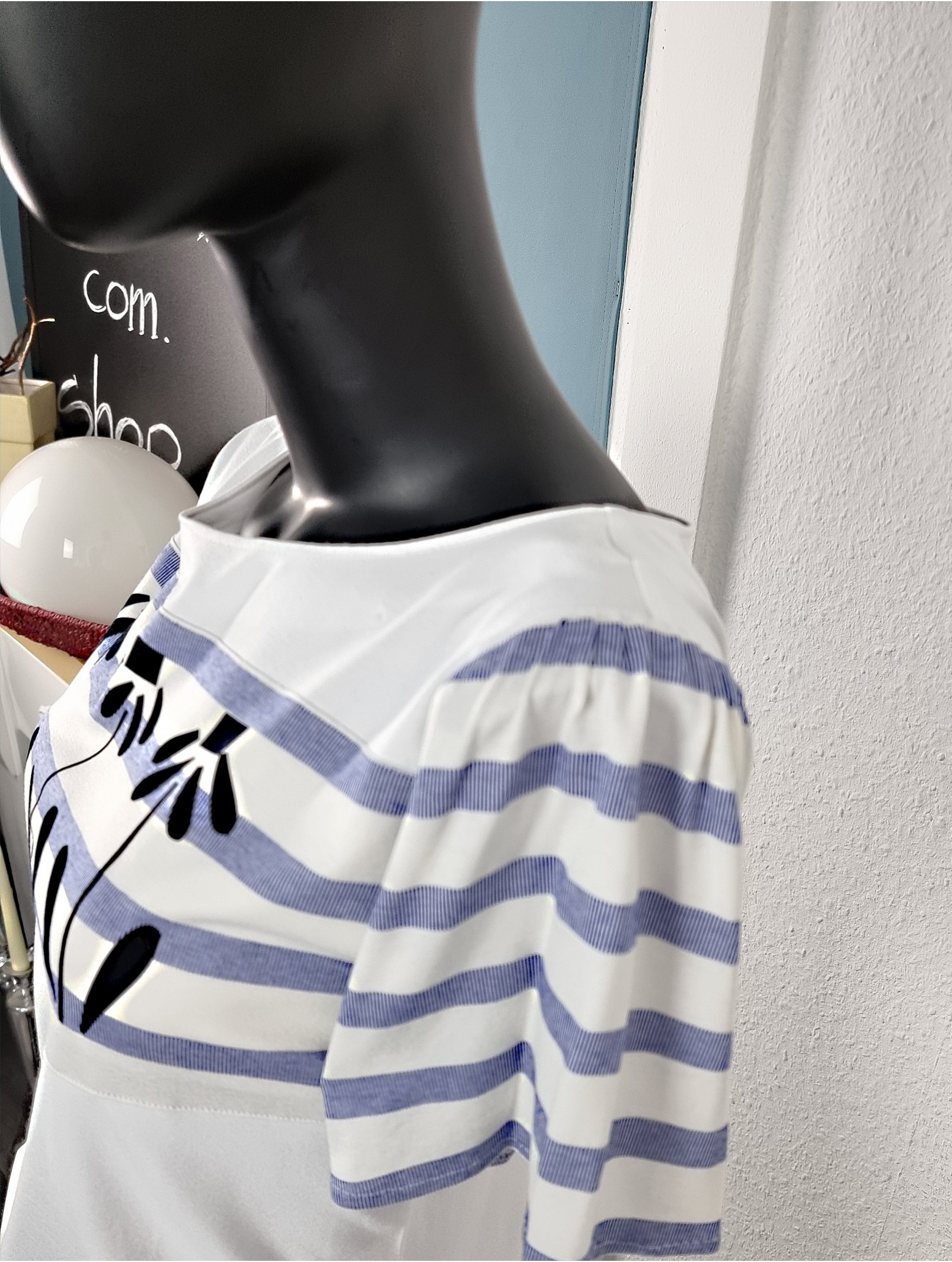 Ein elegantes, legeres Shirt mit romantischem Touch. Die blauen Querstreifen auf der Brust treffen auf ein feines Flock-Muster in Navy – ein dezentes Highlight mit Handmade-Charme.