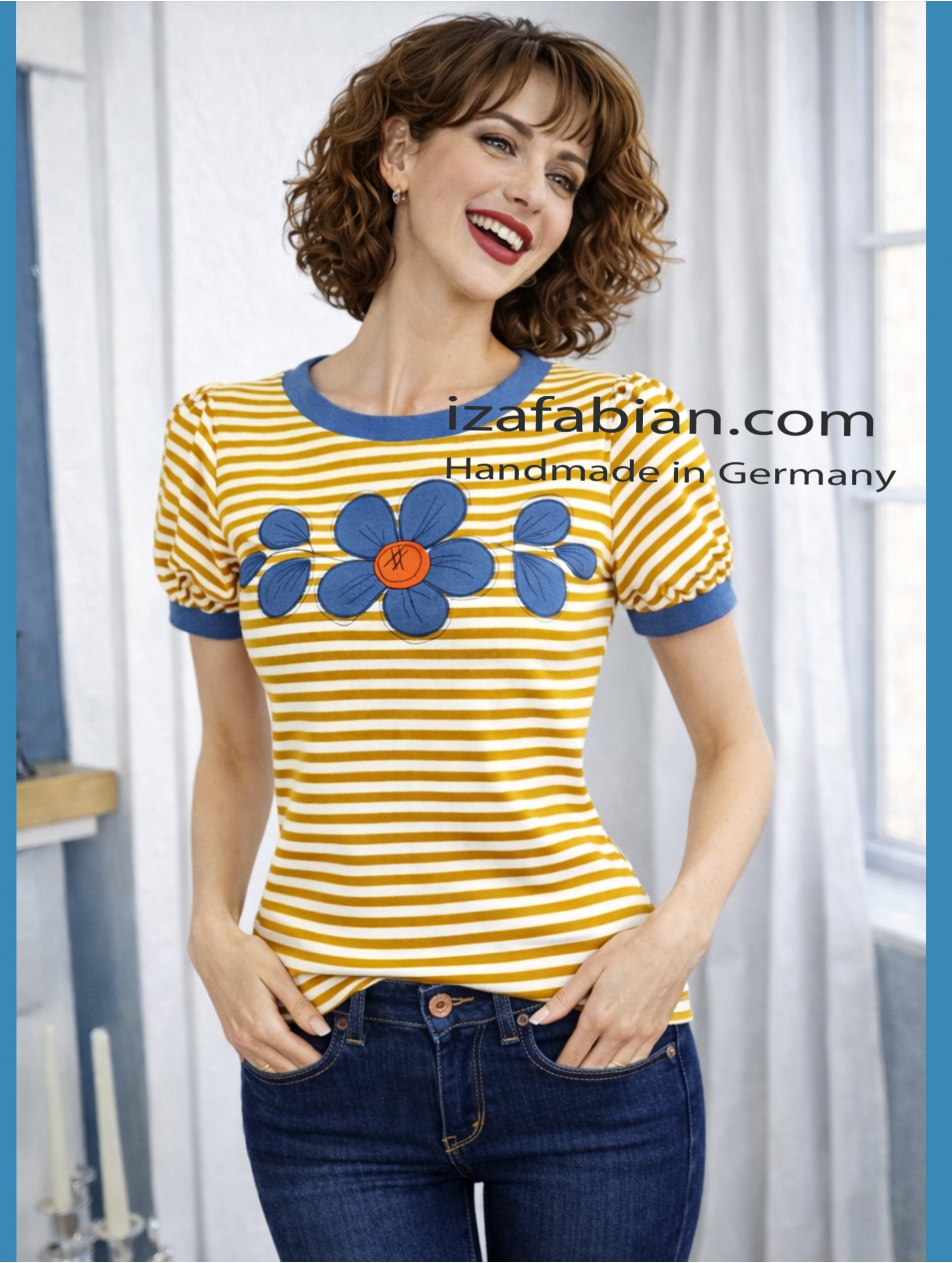 Ein feminines Shirt mit liebevollen Details – verspielt, bequem und alltagstauglich. Das senf-weiß gestreifte Design bekommt durch die jeansblauen Akzente eine moderne, urbane Note.