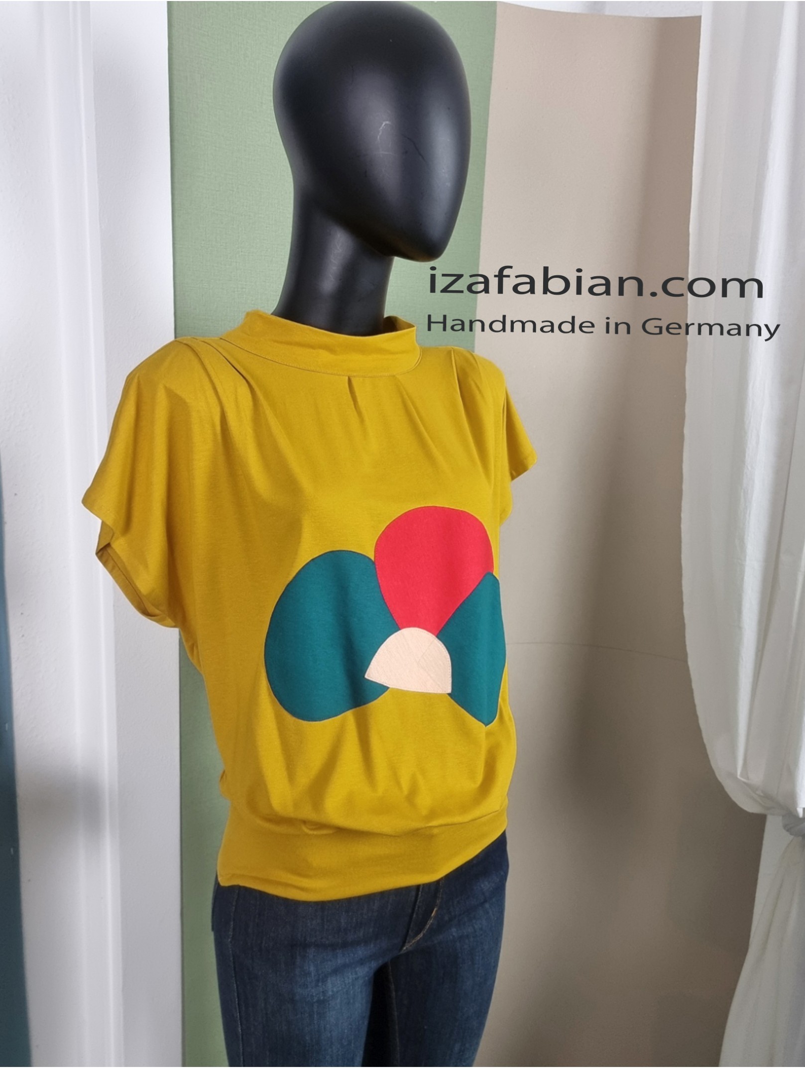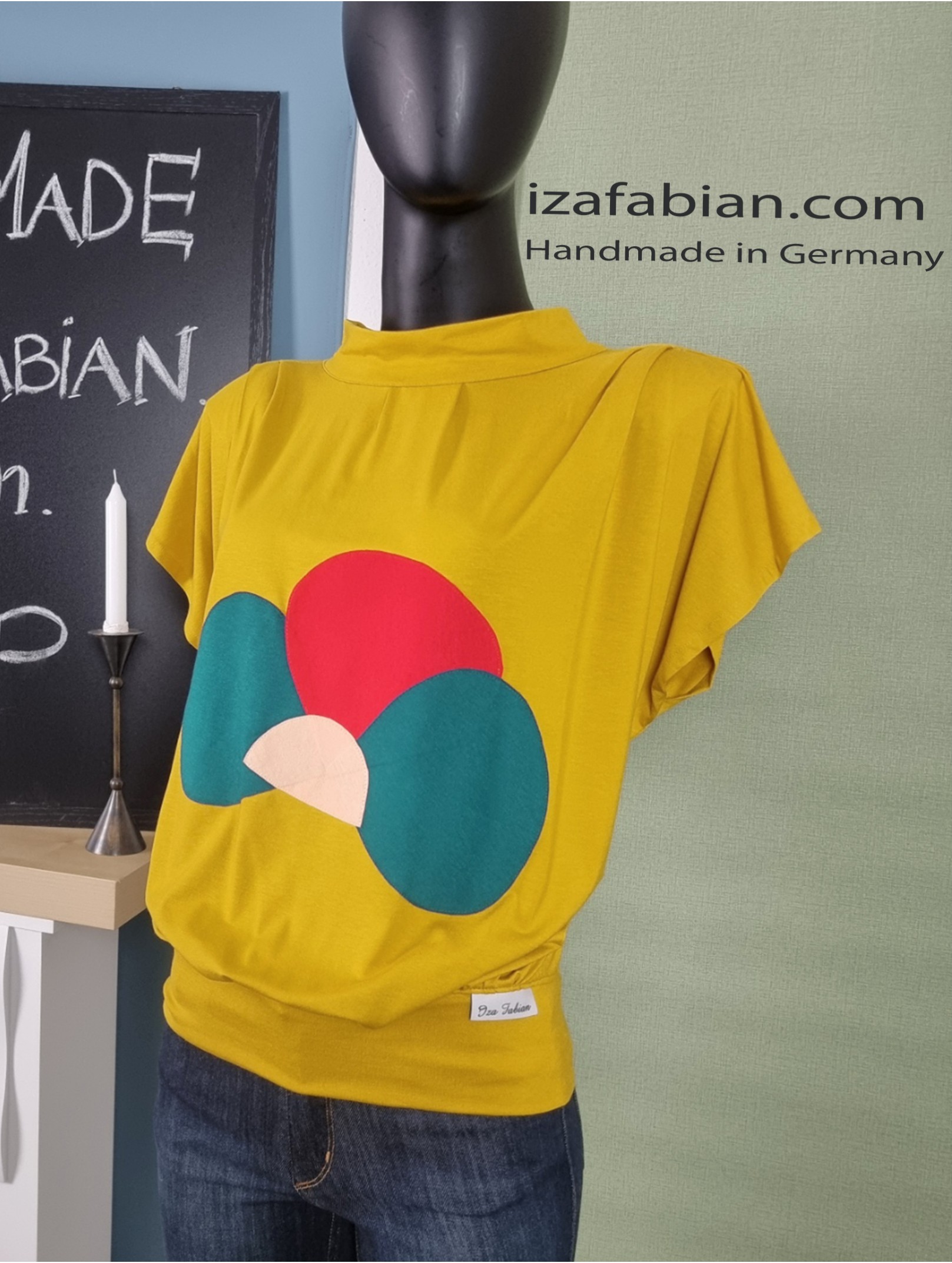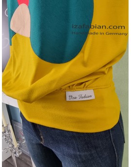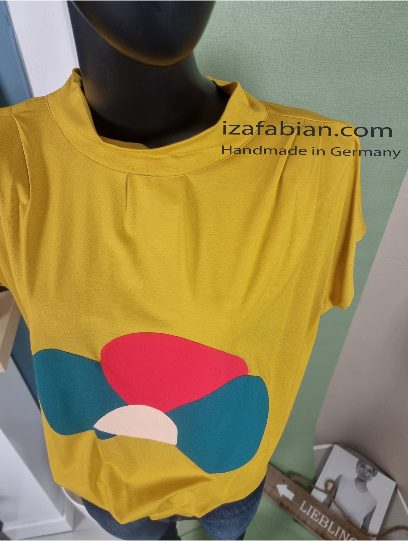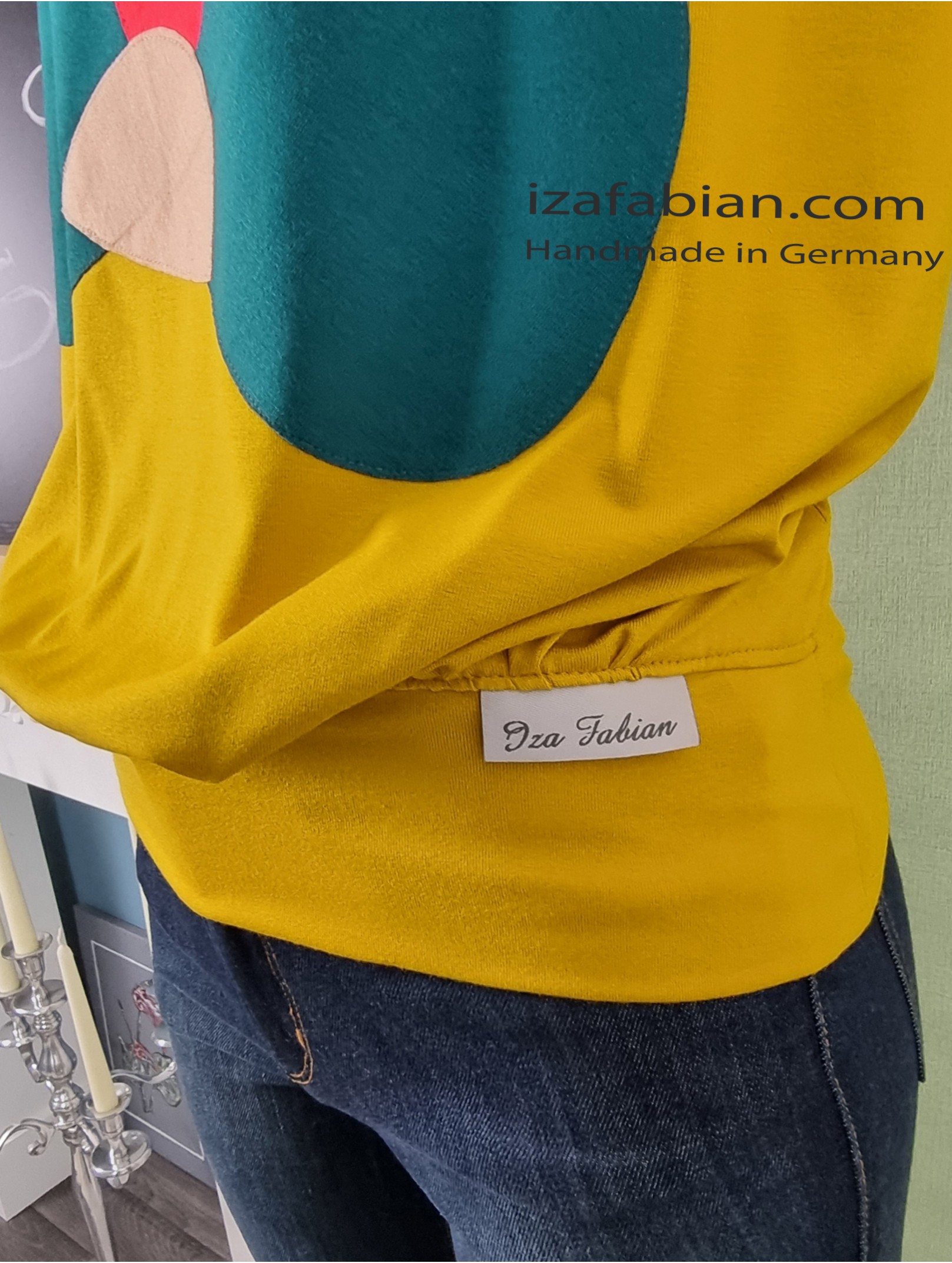 Farbe: Currygelb mit kontrastreicher Stoffapplikation auf der Front