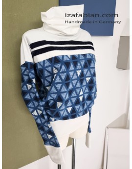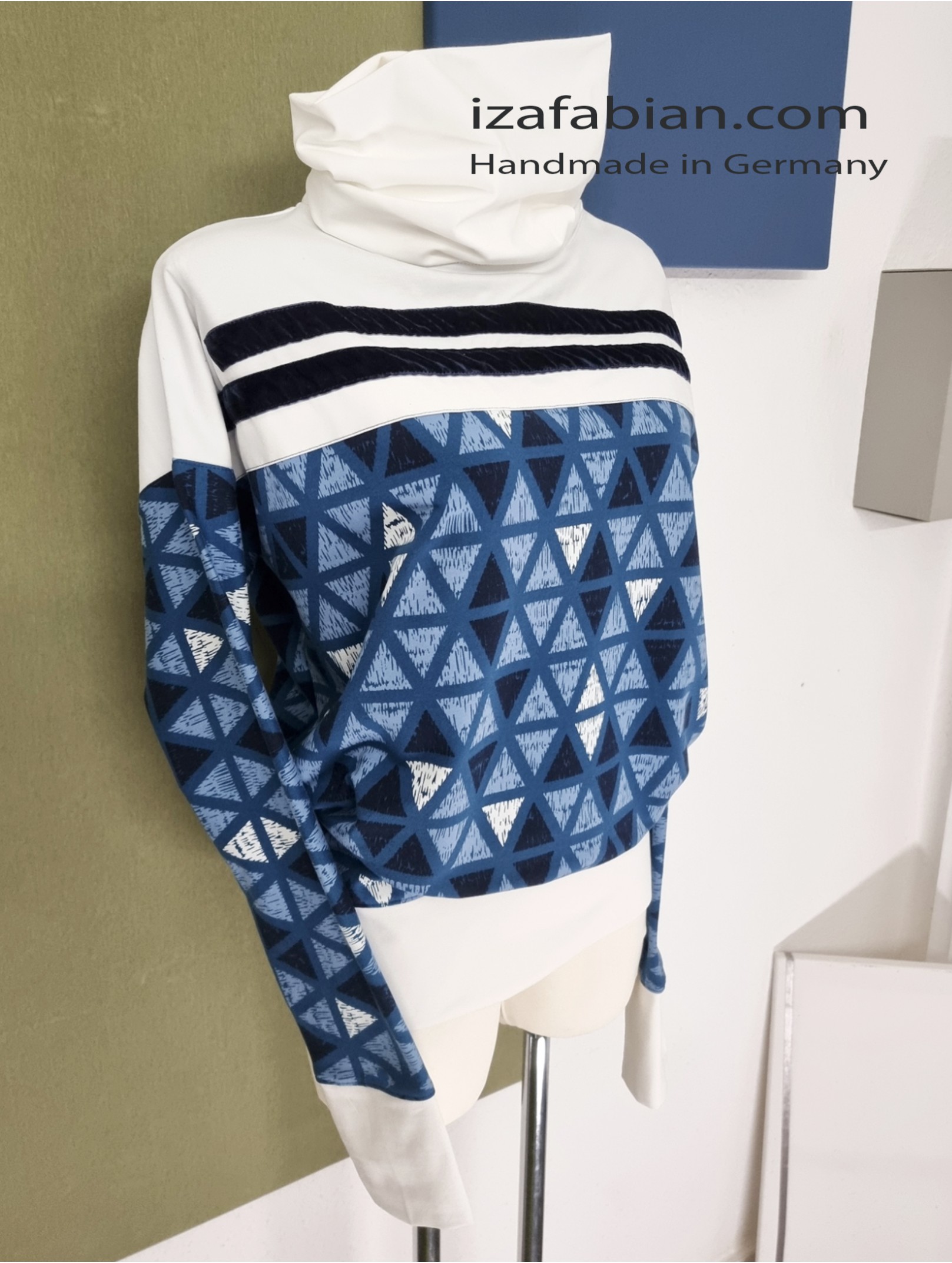 Ein gemütlicher Begleiter für kalte Tage: dieser Rollkragenpullover vereint kuschelige Stoffe, femininen Schnitt und Retro-Eleganz. Der Fleece-ähnlich beschichtete Jersey wärmt angenehm, während Samt-Details und Blaunuancen für stilvolle Kontraste sorgen.