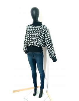 Rostrote Pullover in Stil der 70-er. Lockere Ärmeln mit Raffung am Bündchen, Blumige Rollkragen, Passe, Bund und Bündchen.