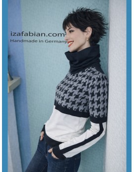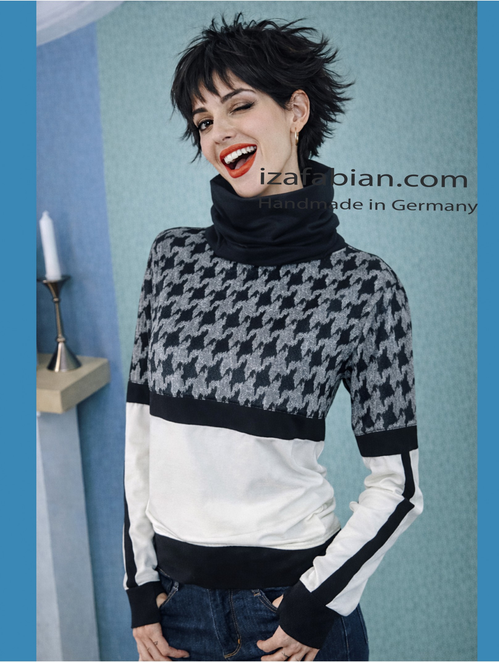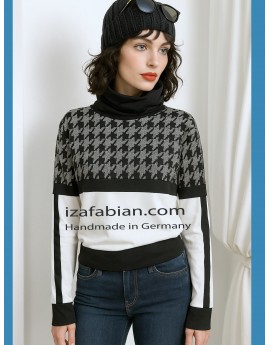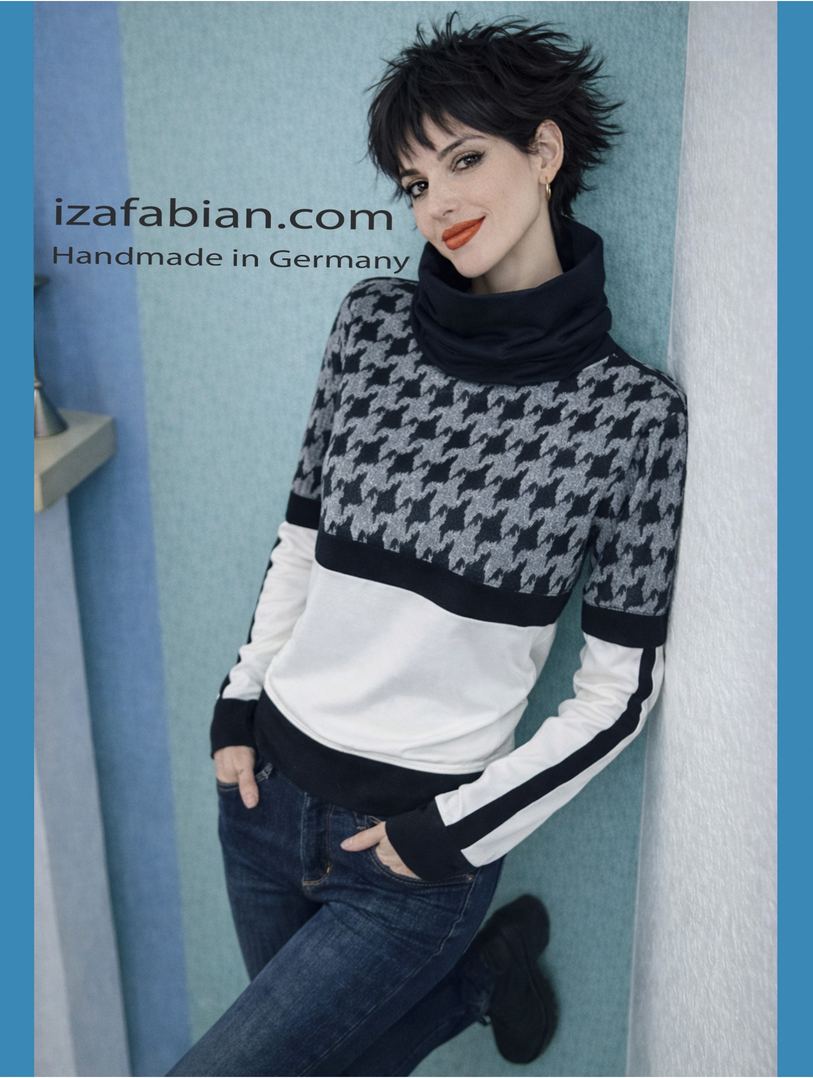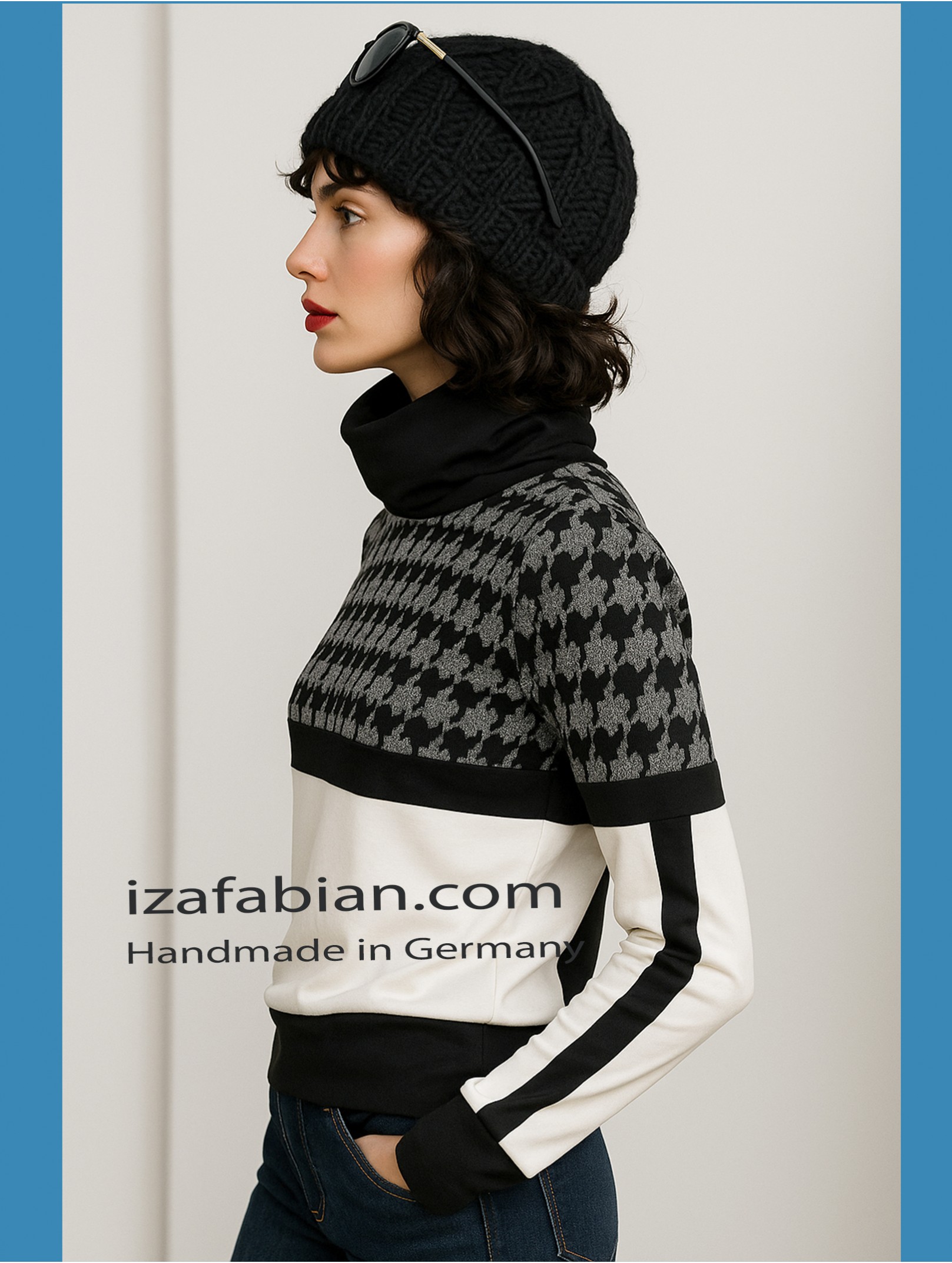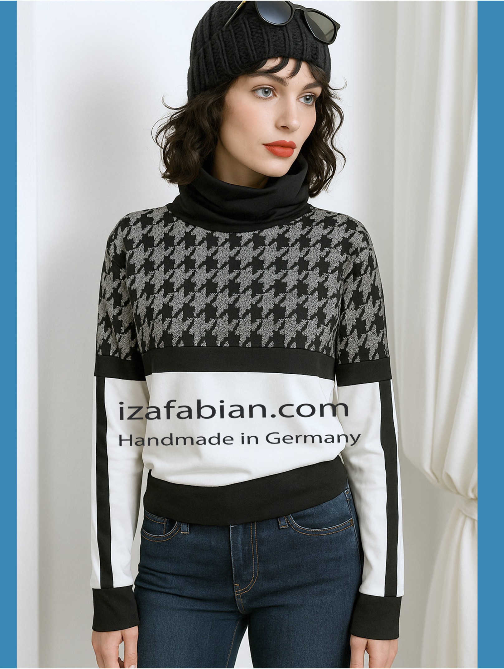 Ein moderner, grafischer Statement-Sweater: Dieses Design verbindet klassischen Hahnentritt mit klaren Colorblocking-Flächen in Schwarz und Weiß. Der Schnitt sitzt locker, wirkt urban-elegant – zeitlos, charakterstark und vielseitig kombinierbar.