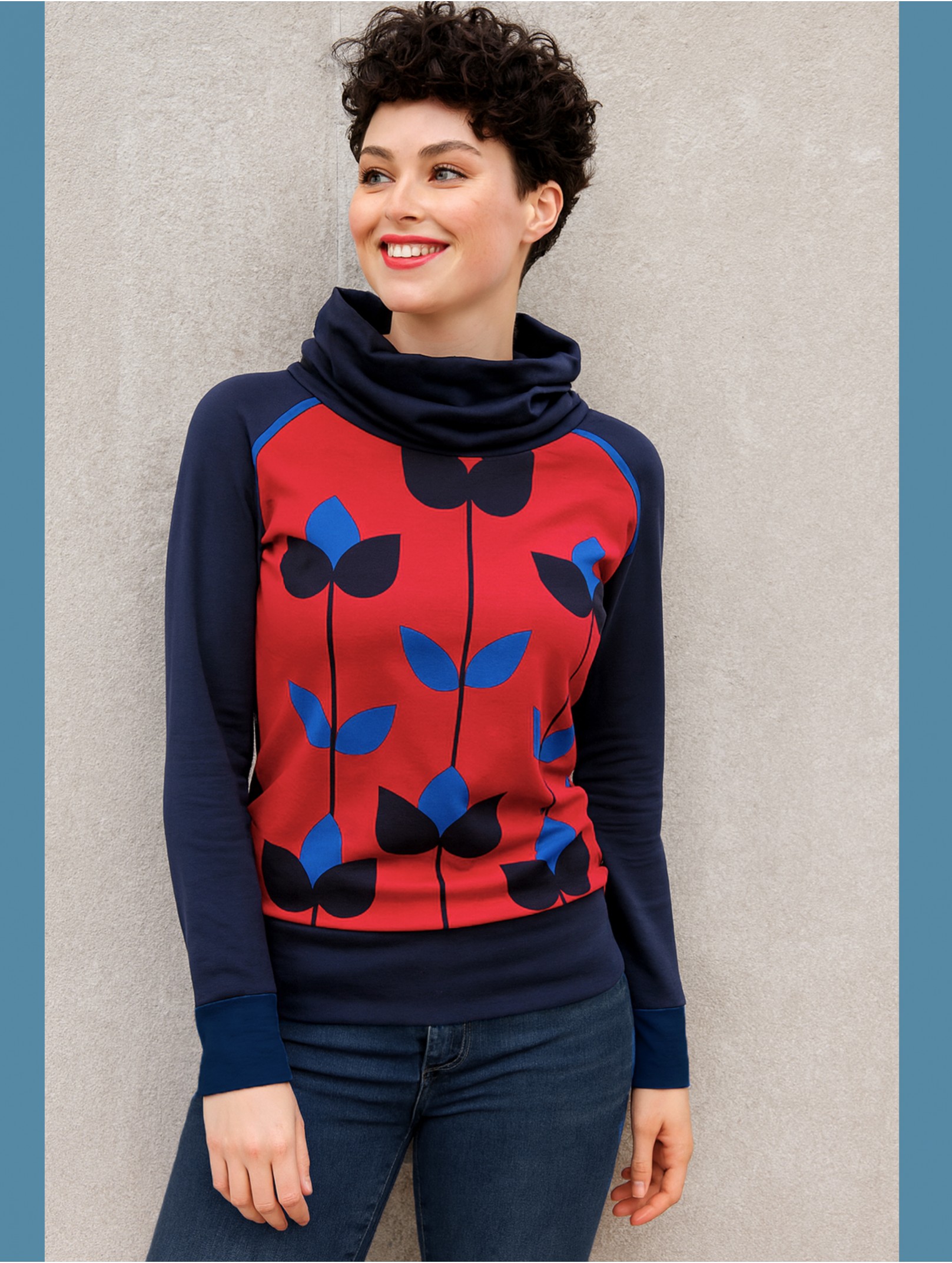 Ein Pullover im 70s-Retro-Look, der urbanen Style mit Gemütlichkeit verbindet. Die rote Front wird durch royal- und marineblaue Applikationen betont – ein Eyecatcher mit Charakter.