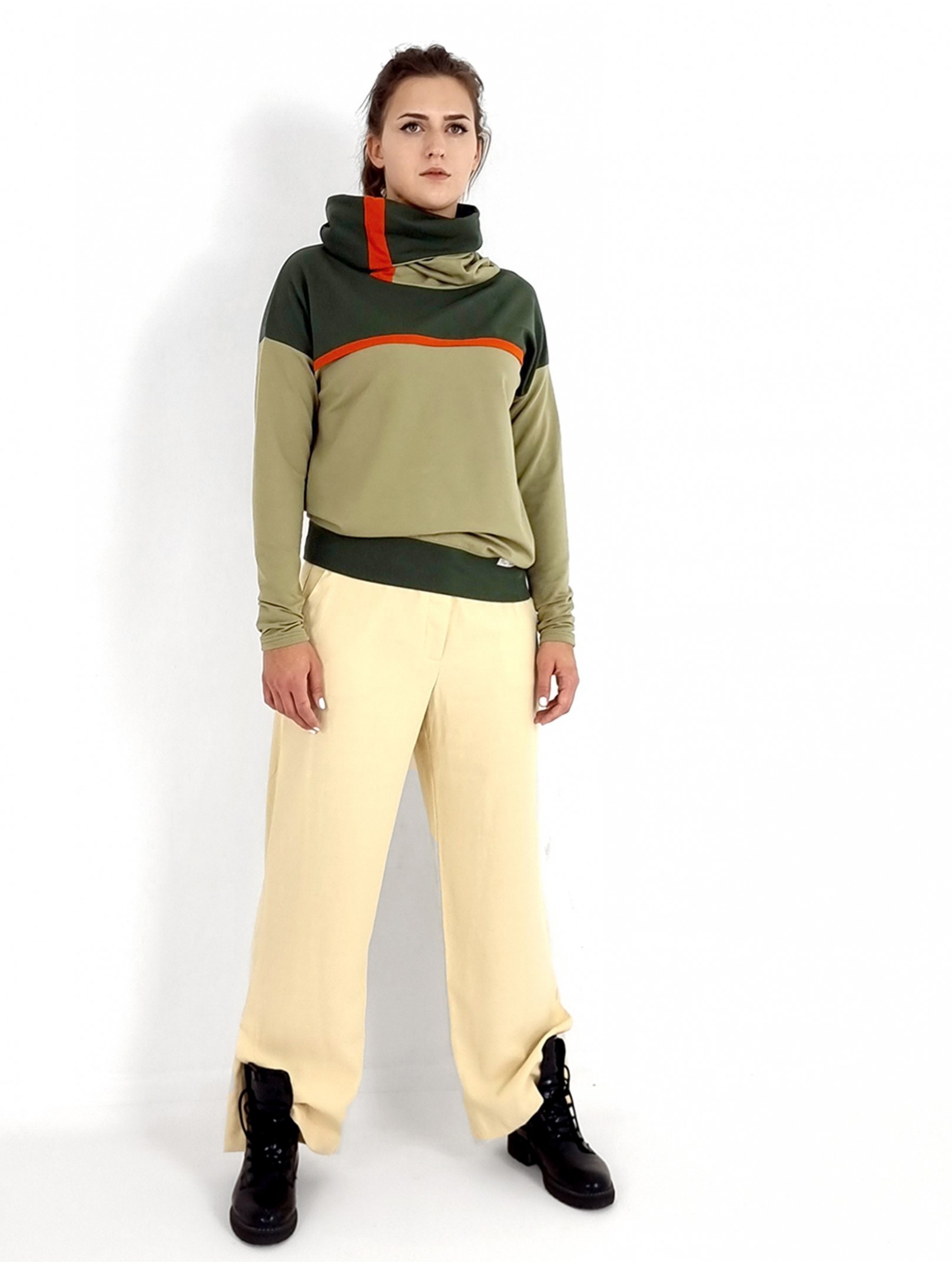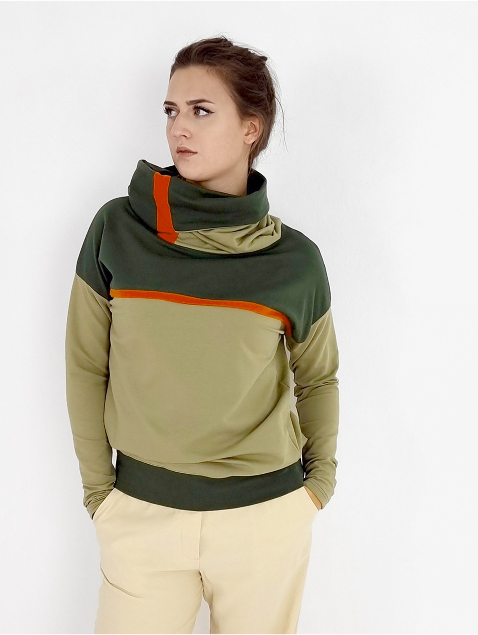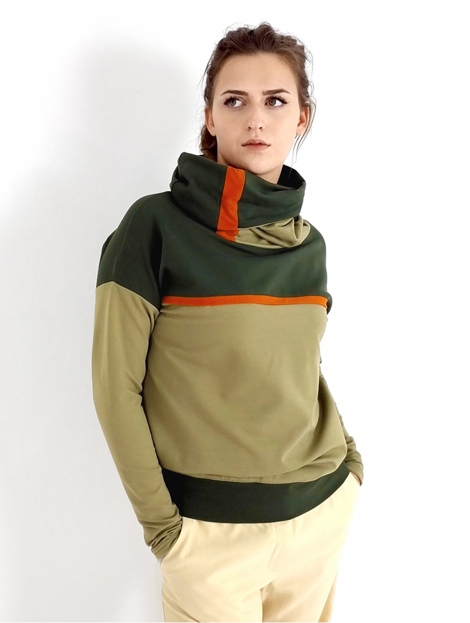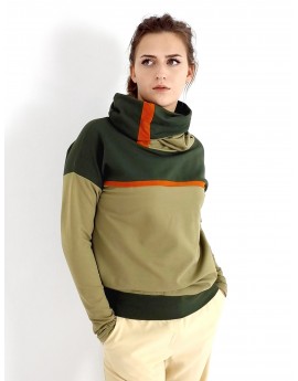 Locker sitzende Damen Hoodie in Armeegrün und Olive. Hohe Schlauch Kragen.