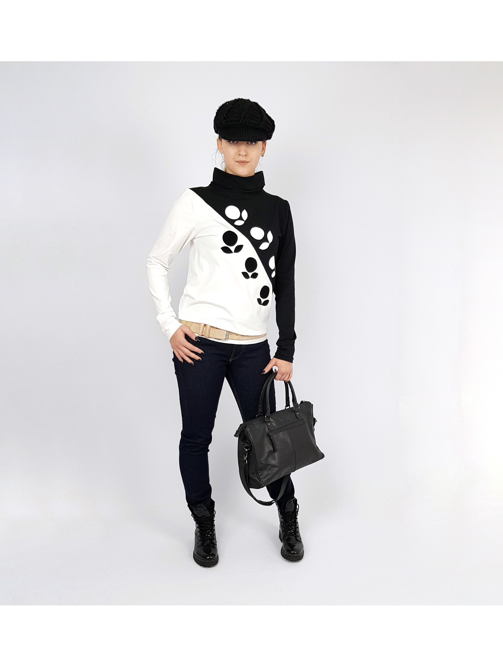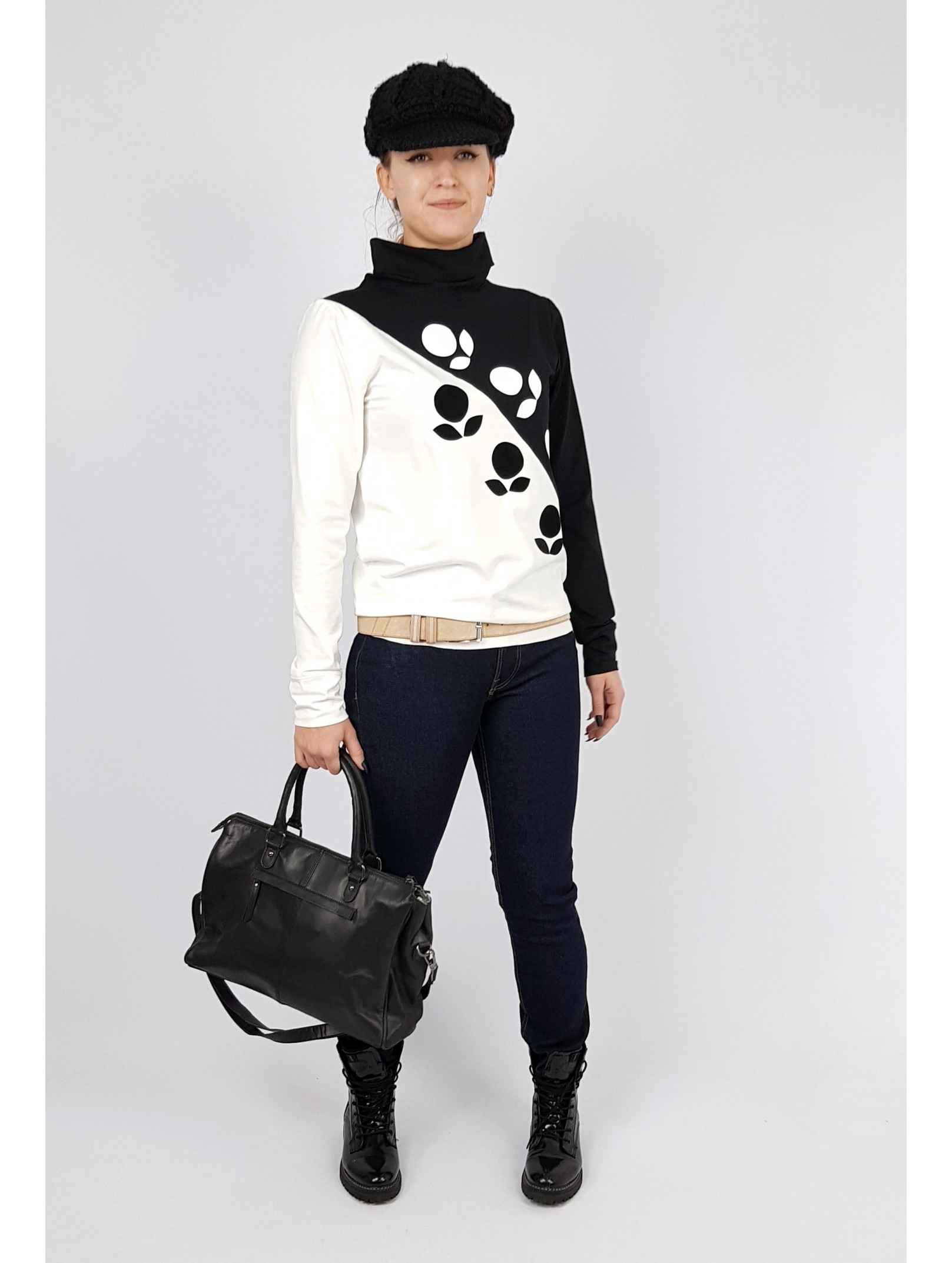 Zweifarbige Pullover mit Rollkragen. Retro Muster - Samt Applikationen.