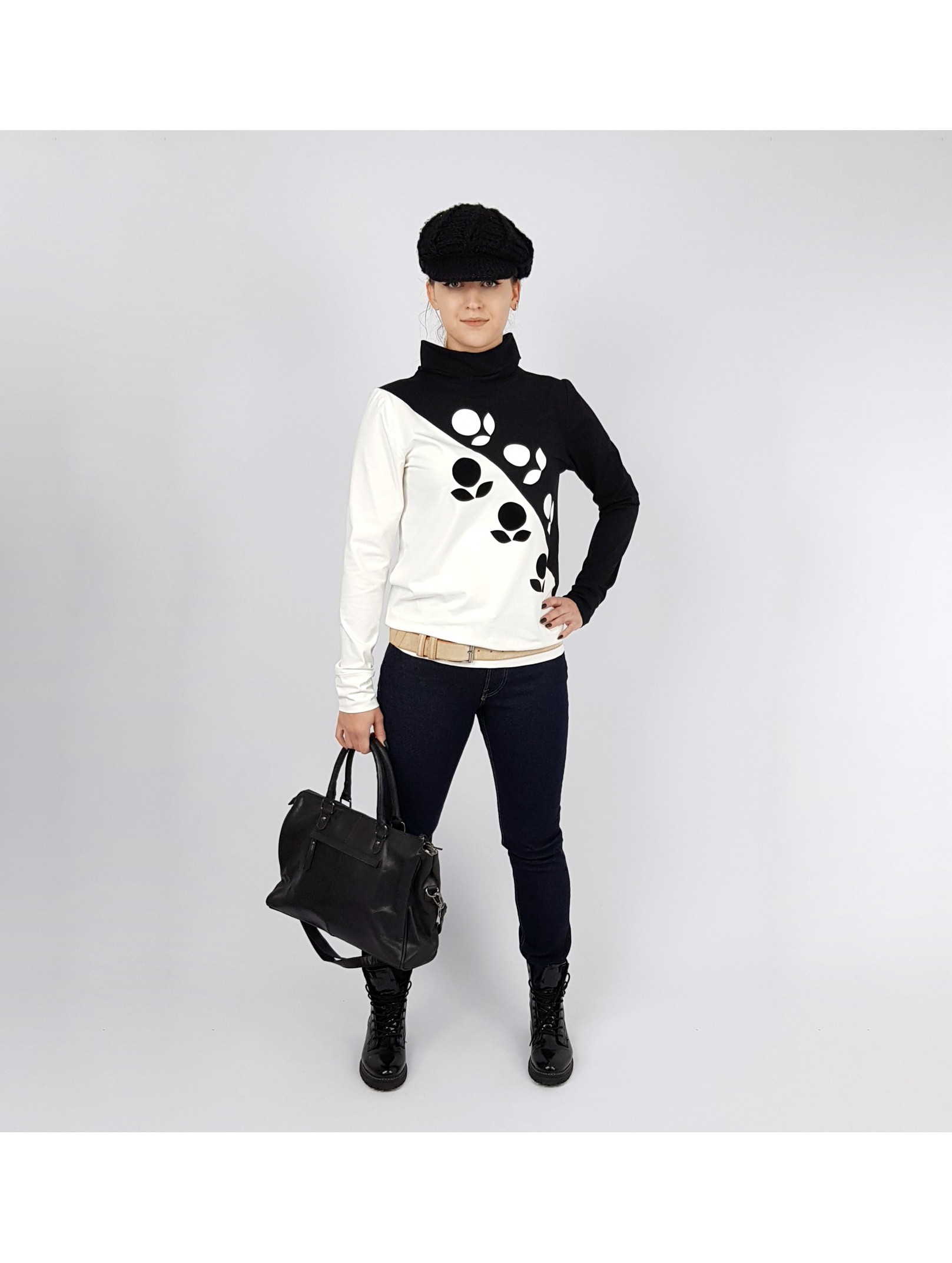 Rollkragen Pullover Retro Blumen, Schwarz-Weiss.
