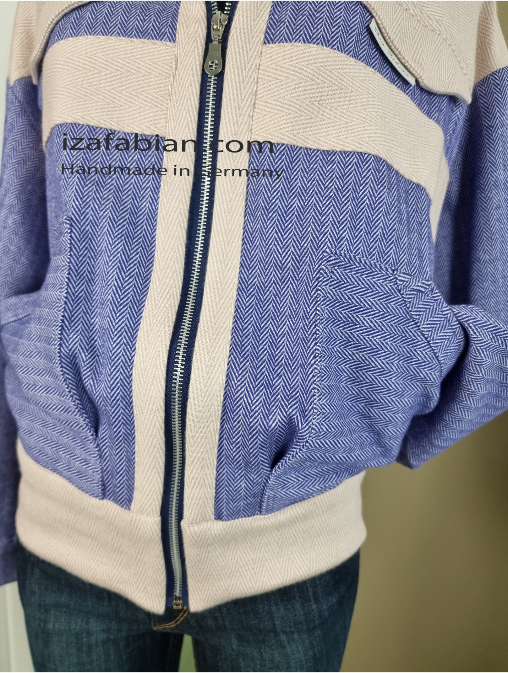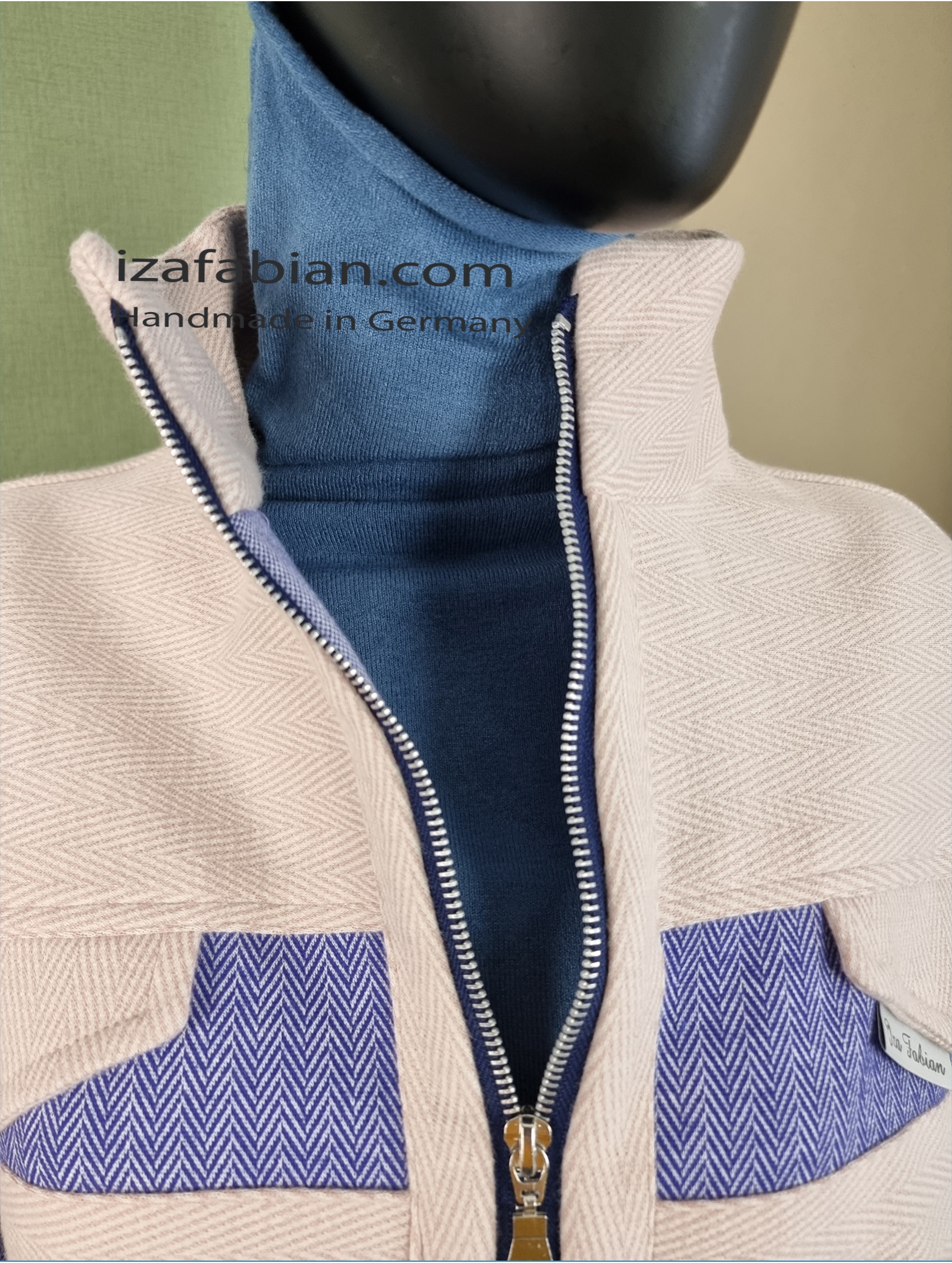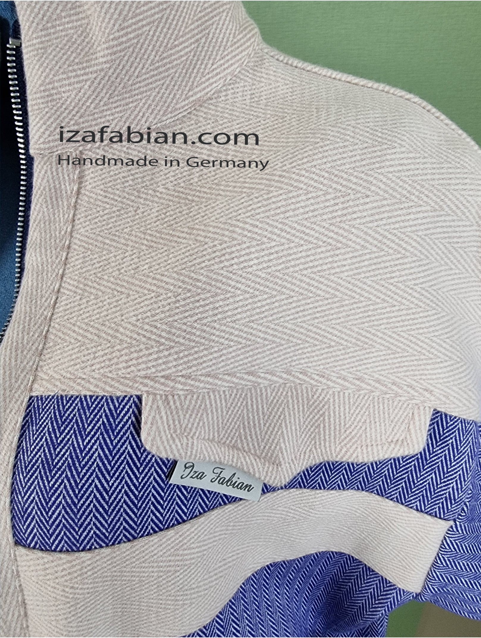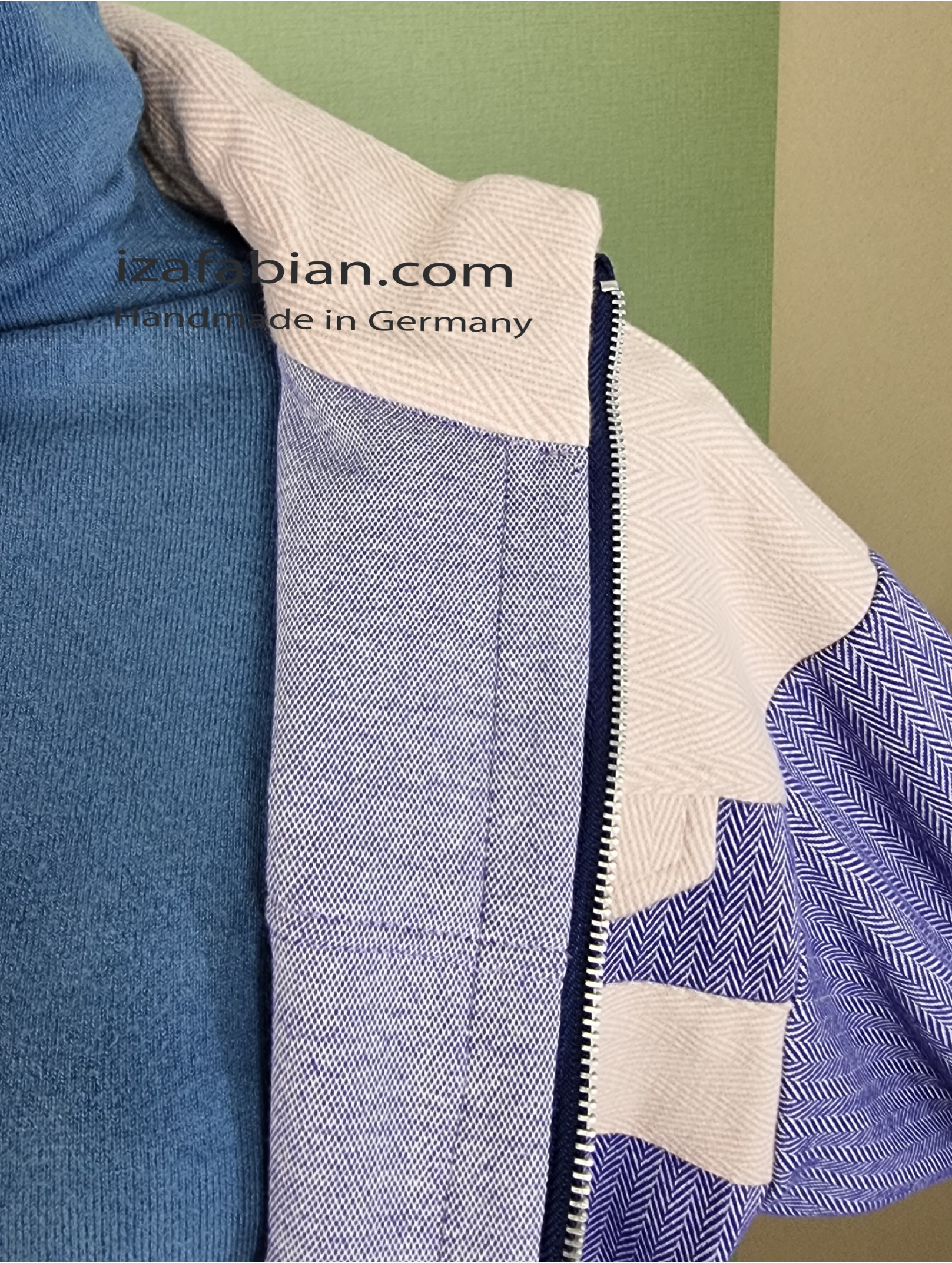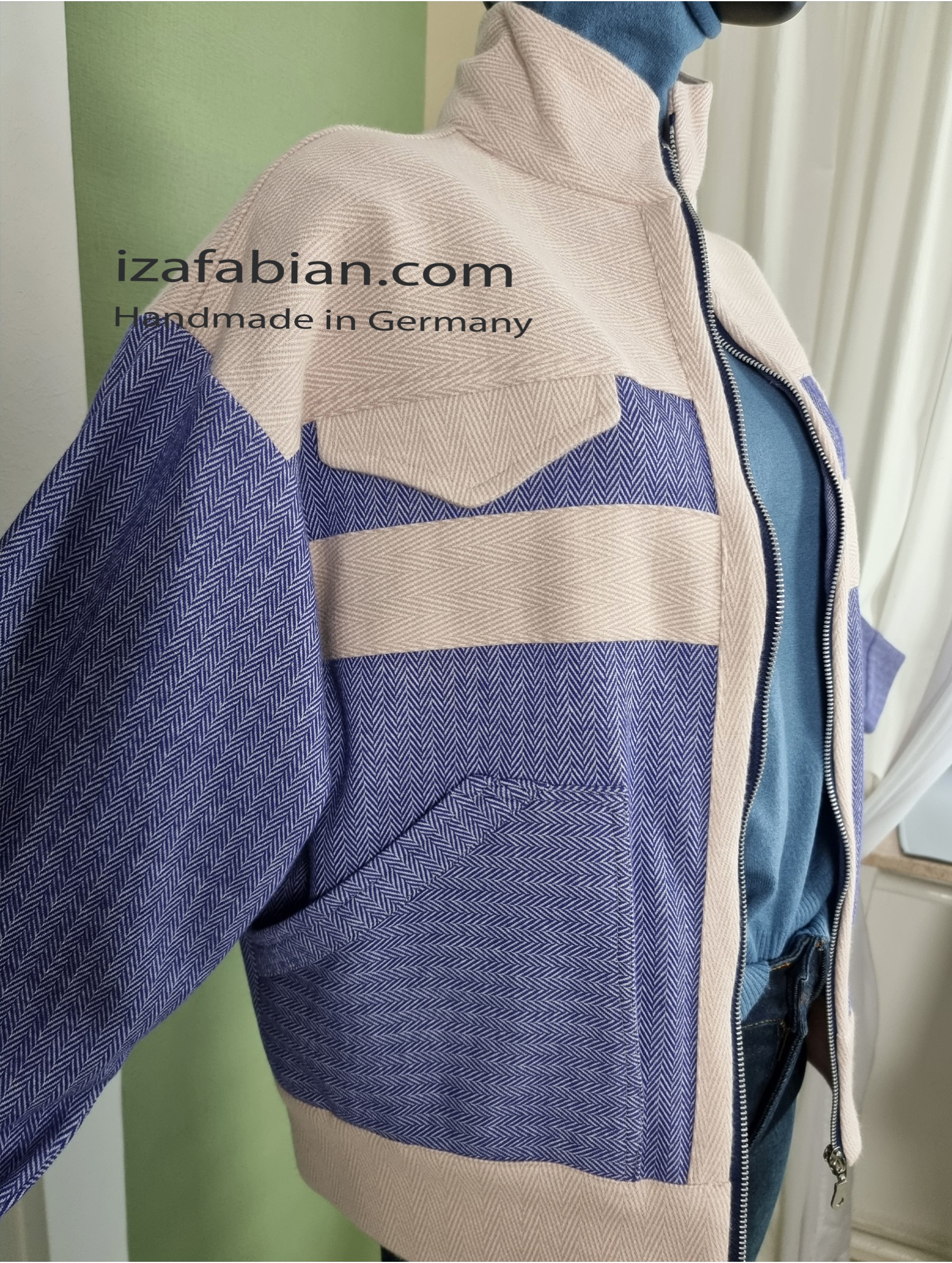 Wird im Atelier sorgfältig nach Bestellung genäht – jede Jacke ein einzigartiges Signature Piece von Iza Fabian.