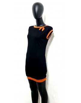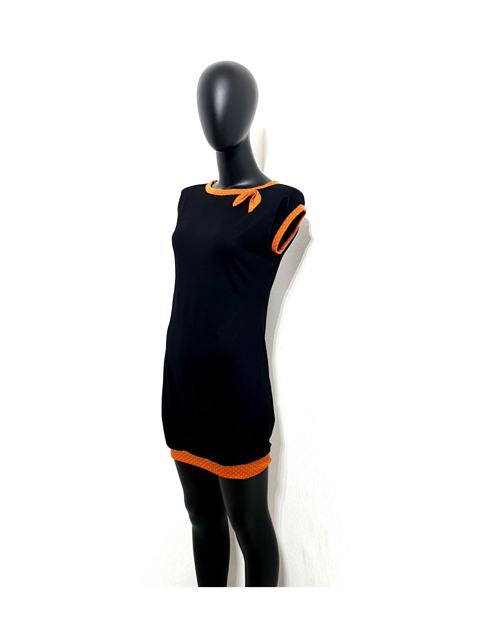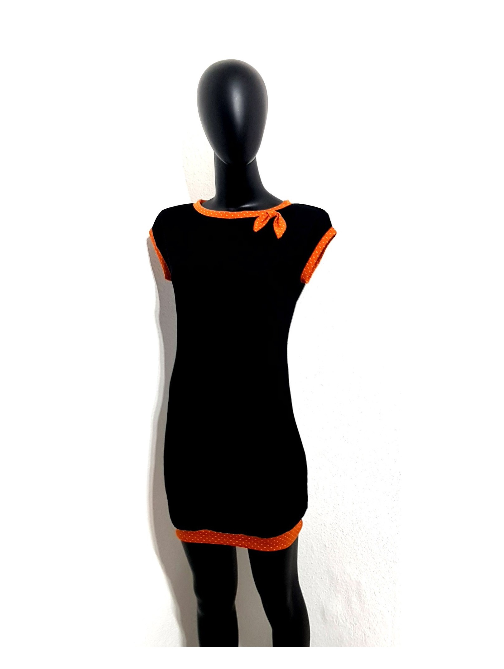 Lockeres Damen Kleid in Schwarz aus Viskosejersey in Top Qualität. Einsätze in Rost , fein gepunktet, Schleife abnehmbar.
