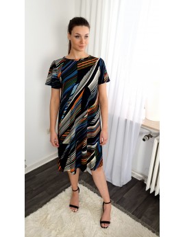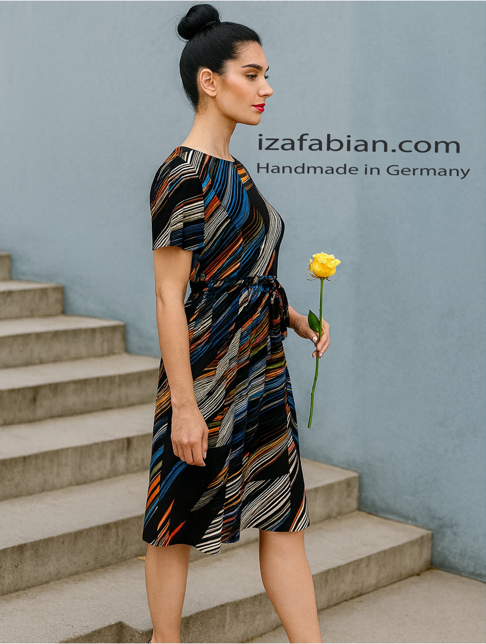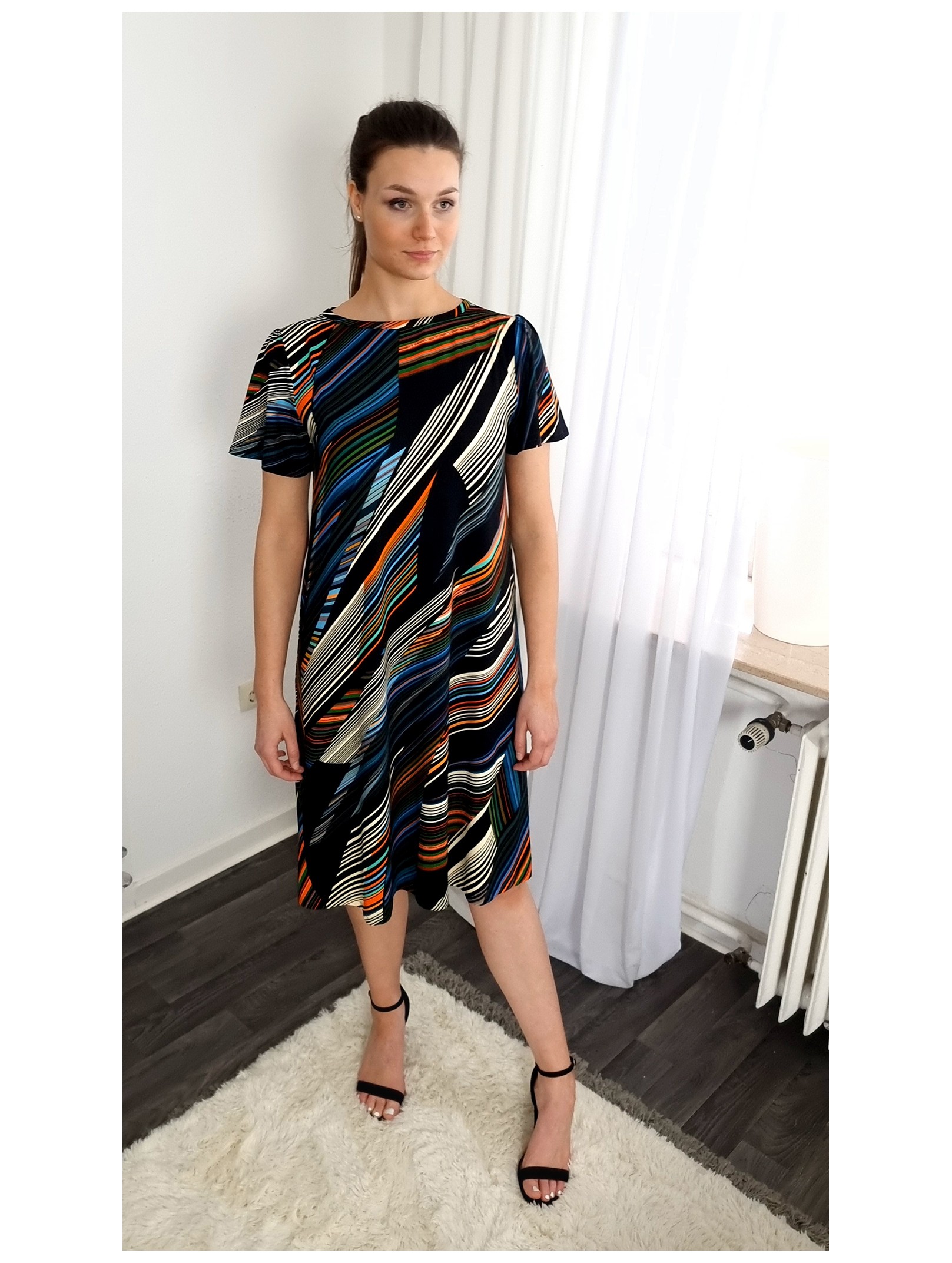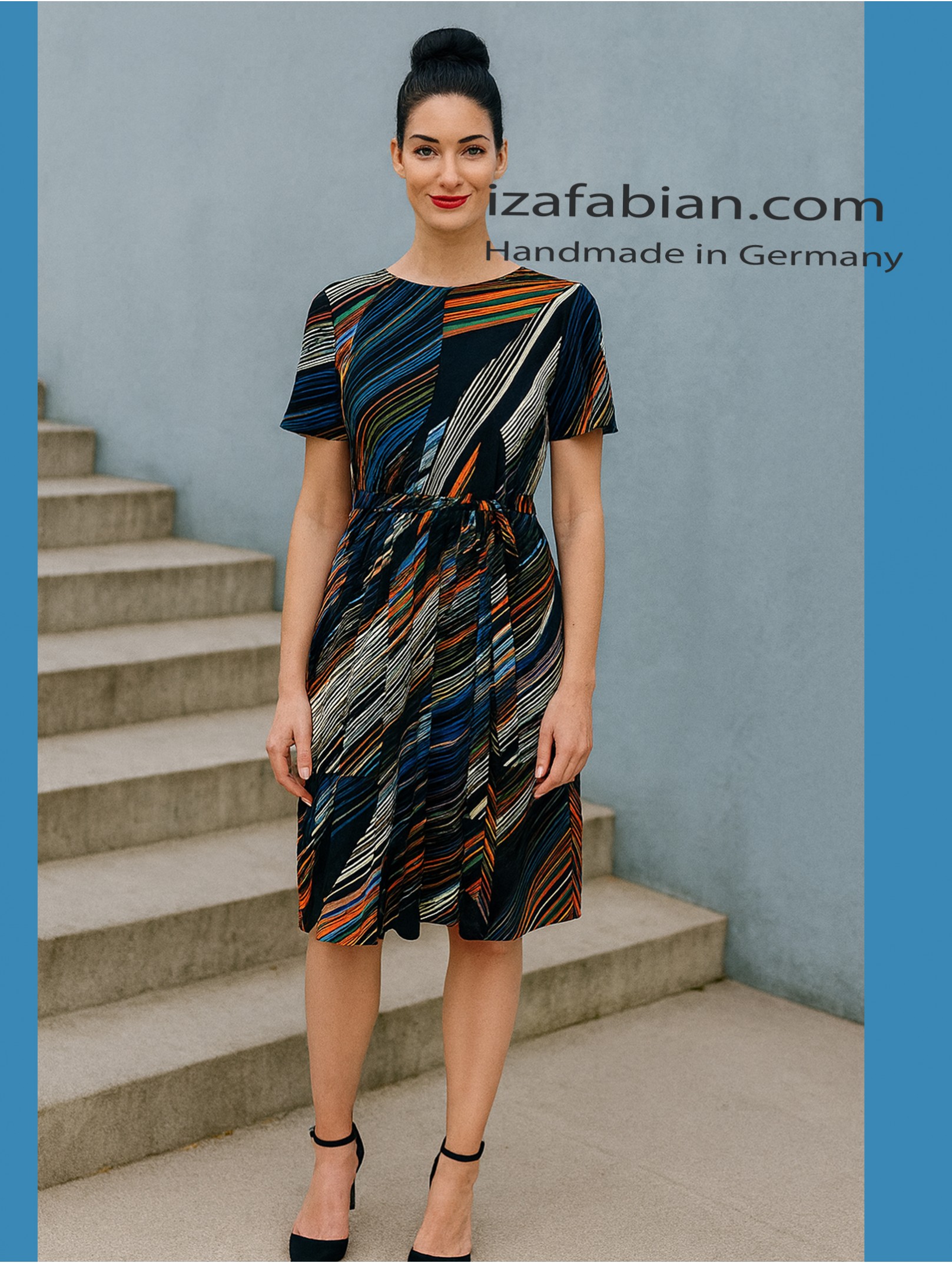 Ein elegantes A-Linien Kleid aus weich fließendem Viskosejersey: bequem, feminin und mit modernem Grafik-Print. Die bunten diagonalen Streifen geben dem Kleid Bewegung und Lebendigkeit – perfekt für Alltag, Büro oder besondere Anlässe.