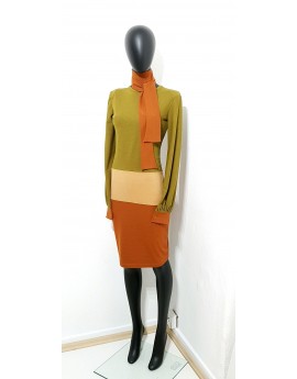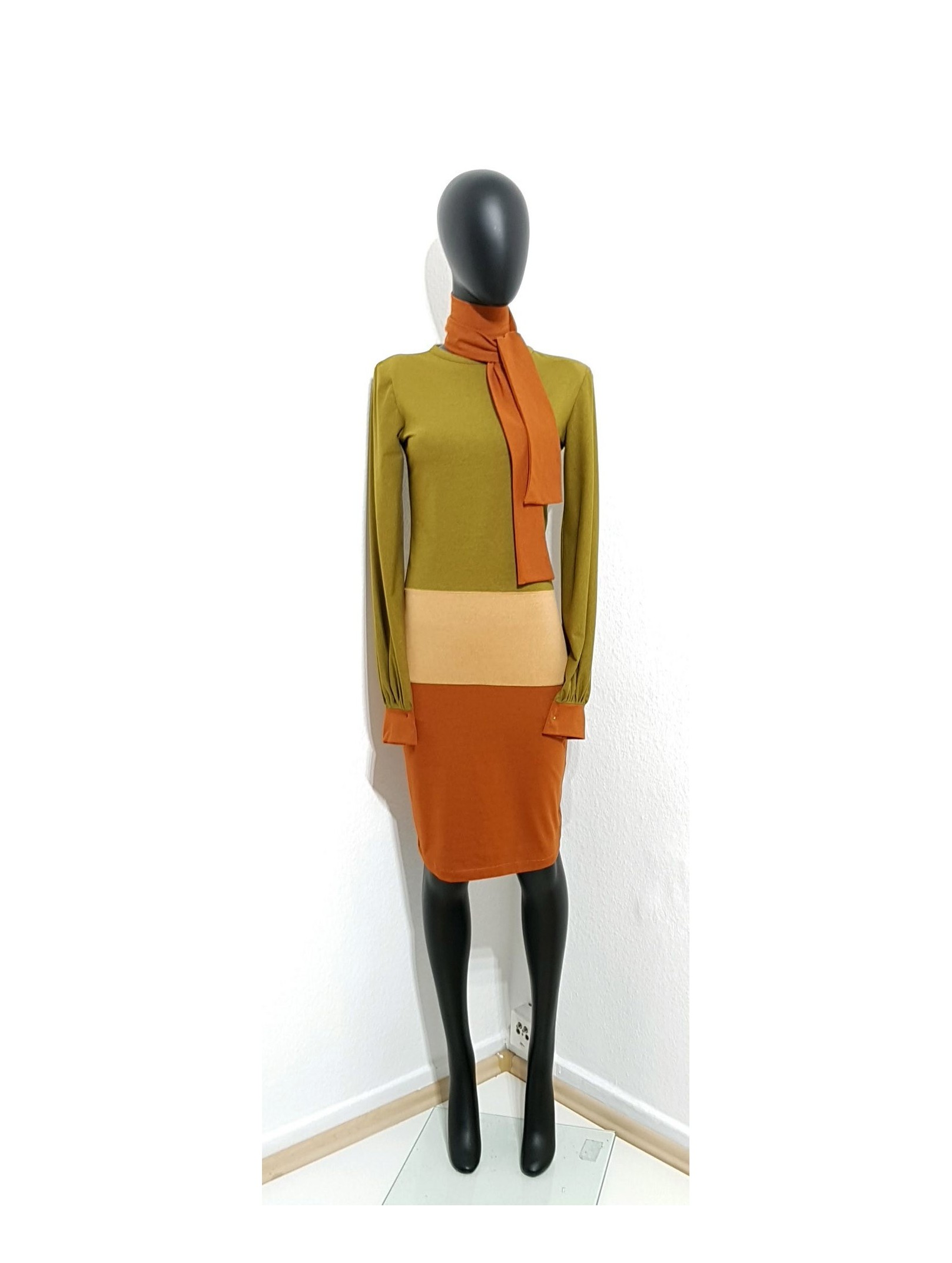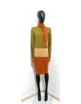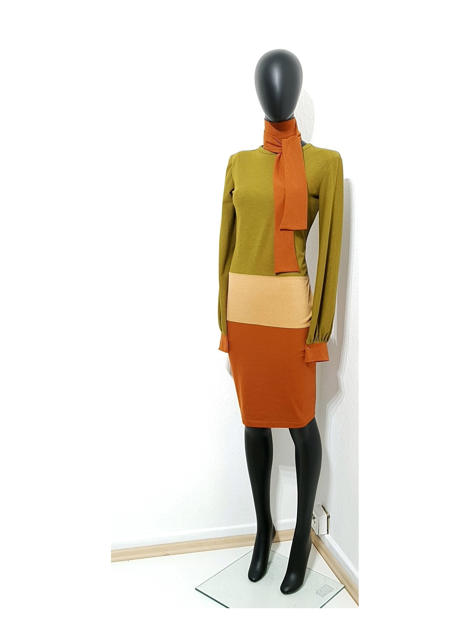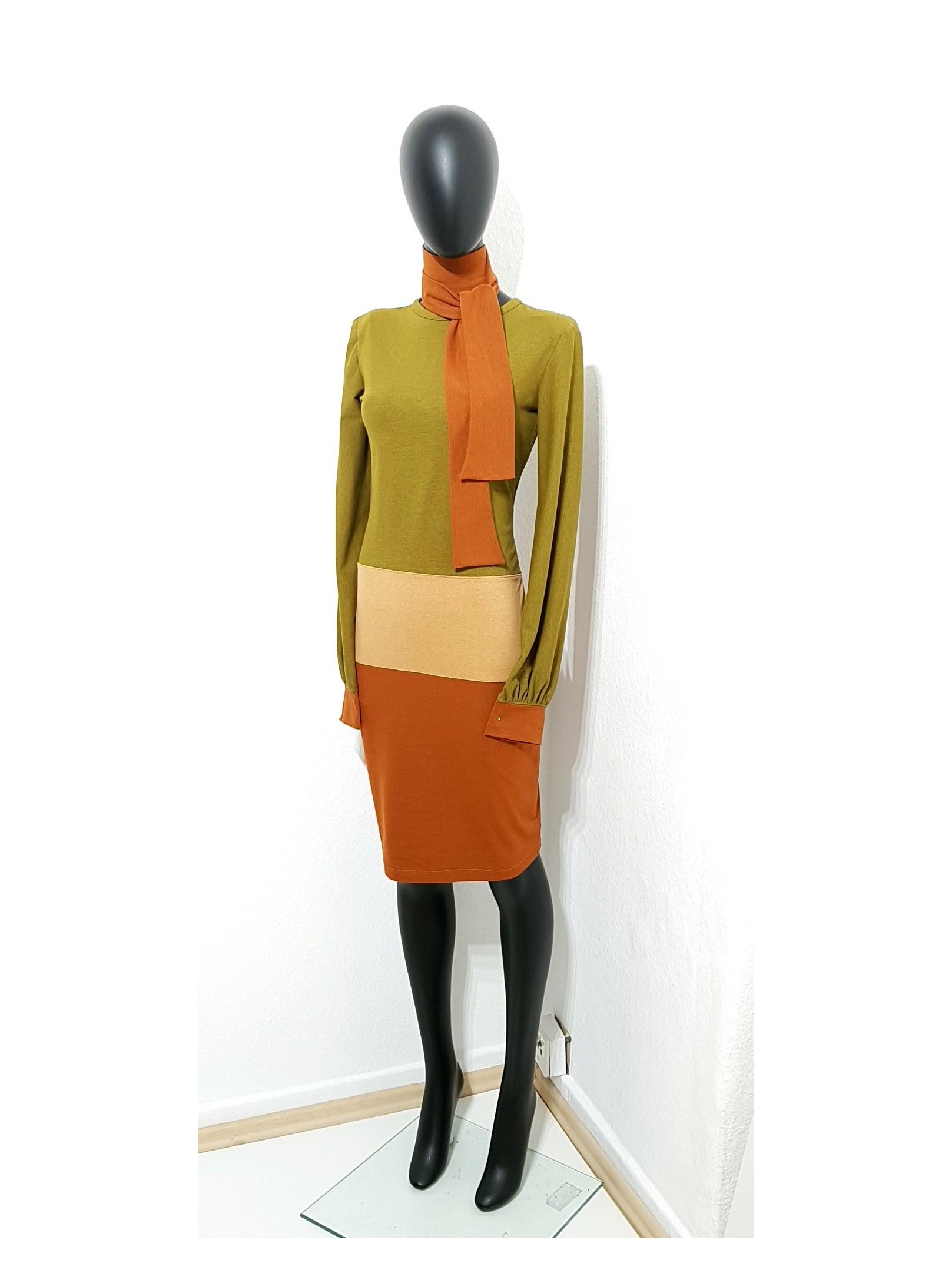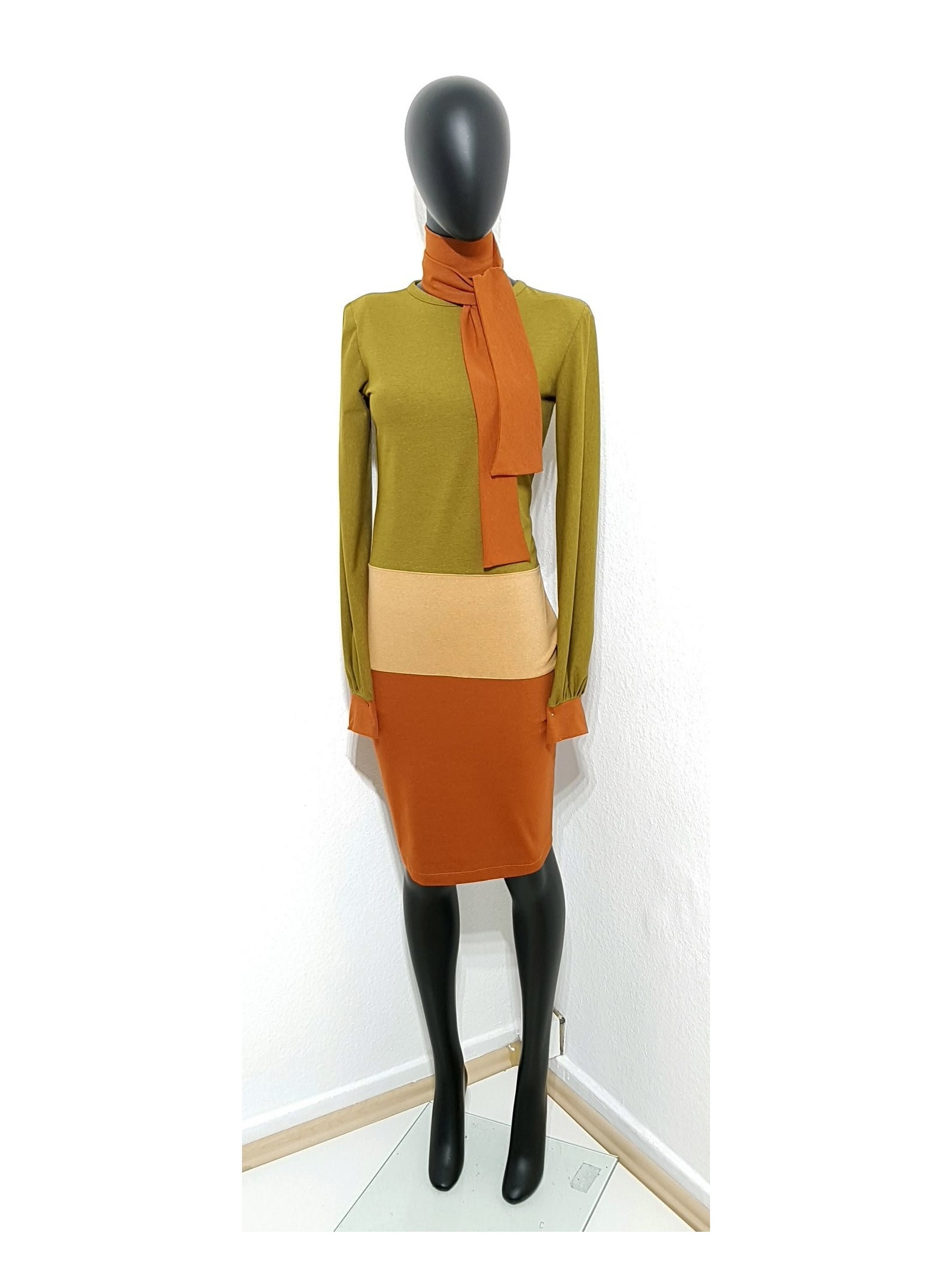 Damen Kleid in Herbst Farben : Mustard, Camel, Rost. Lange Glocken Ärmeln. Rundhals, dazu ein schmaler Schal, welcher als Schleife gebunden werden kann.