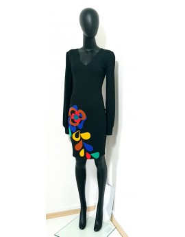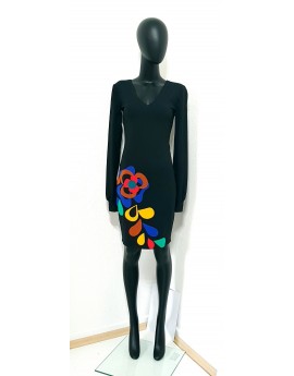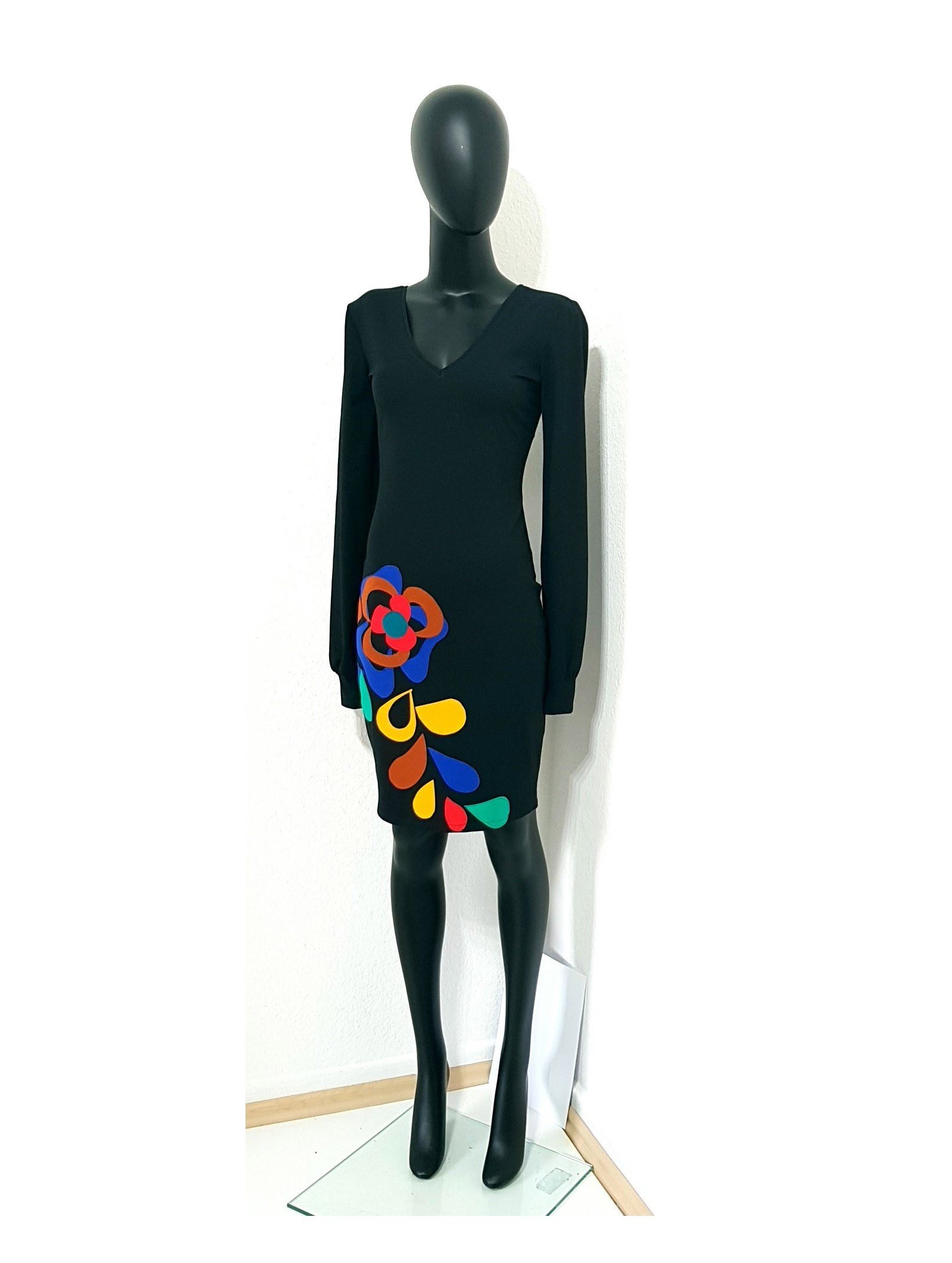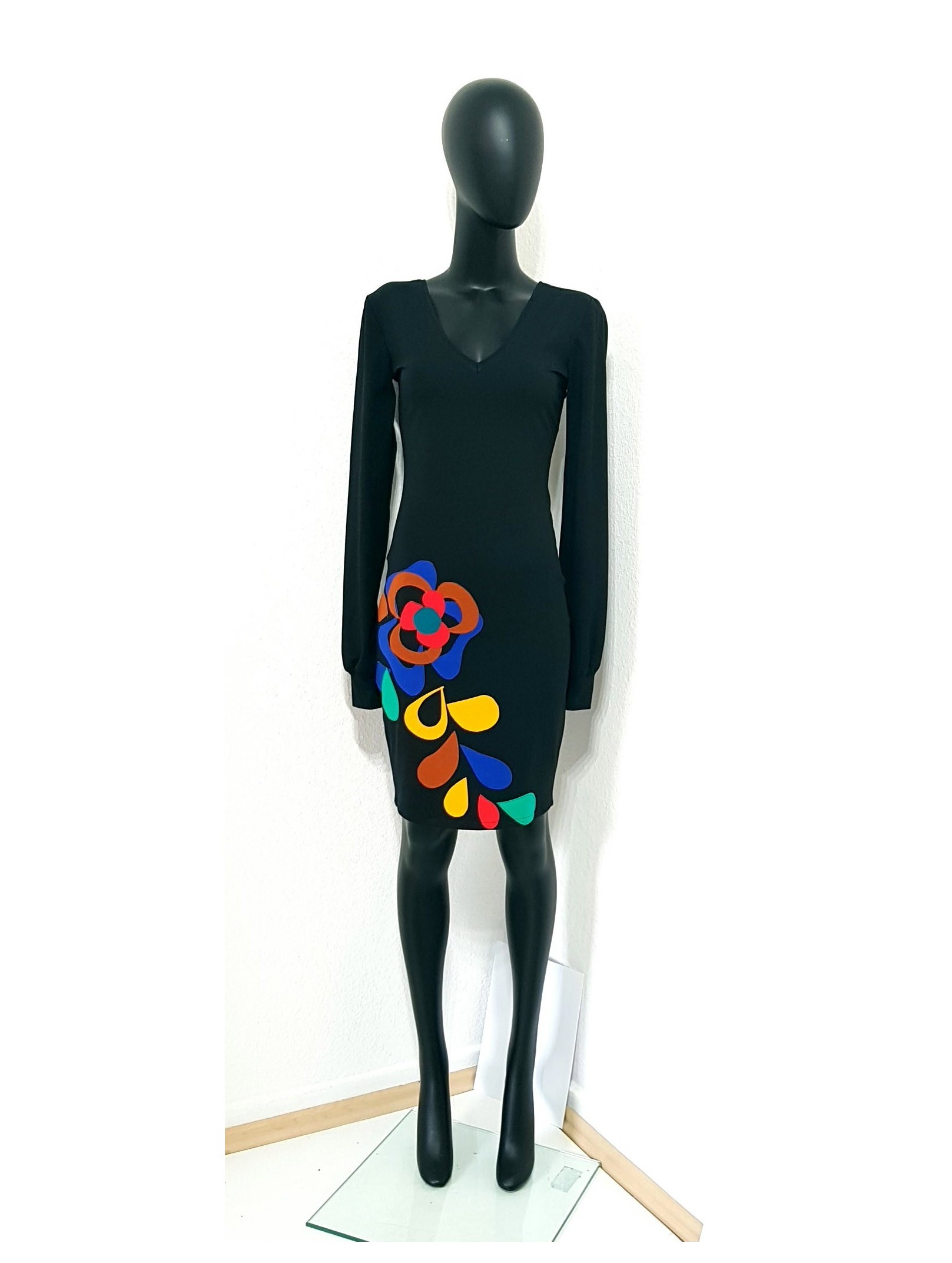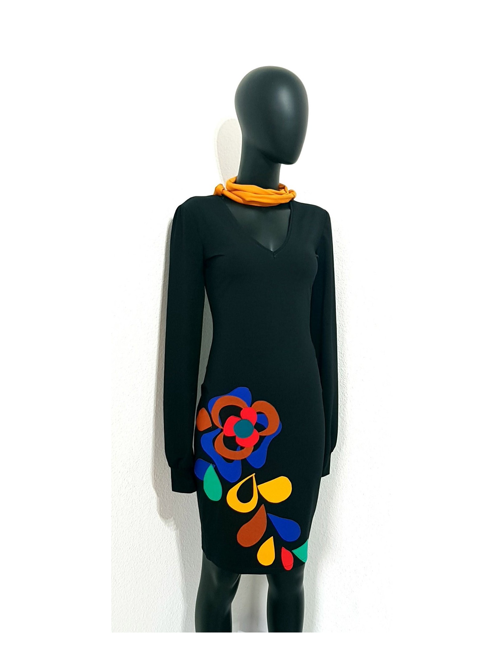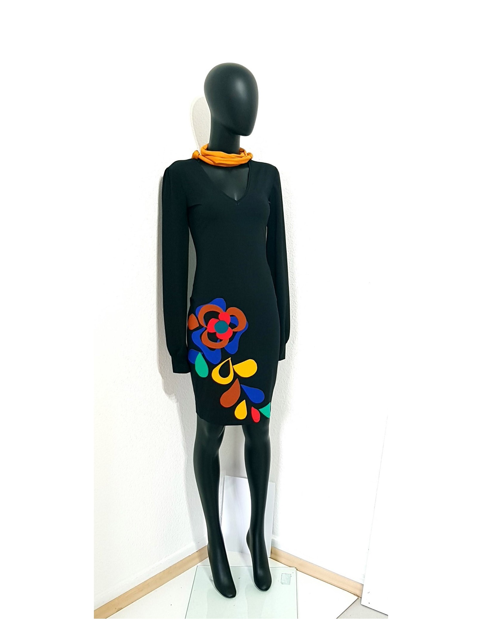 Jerseykleid in Schwarz, Bunte Blmen als Applikationen, tailliert, V-Ausschnitt, lange Glockenärmeln an Bündchen gerafft. Rücken - Uni Schwarz.