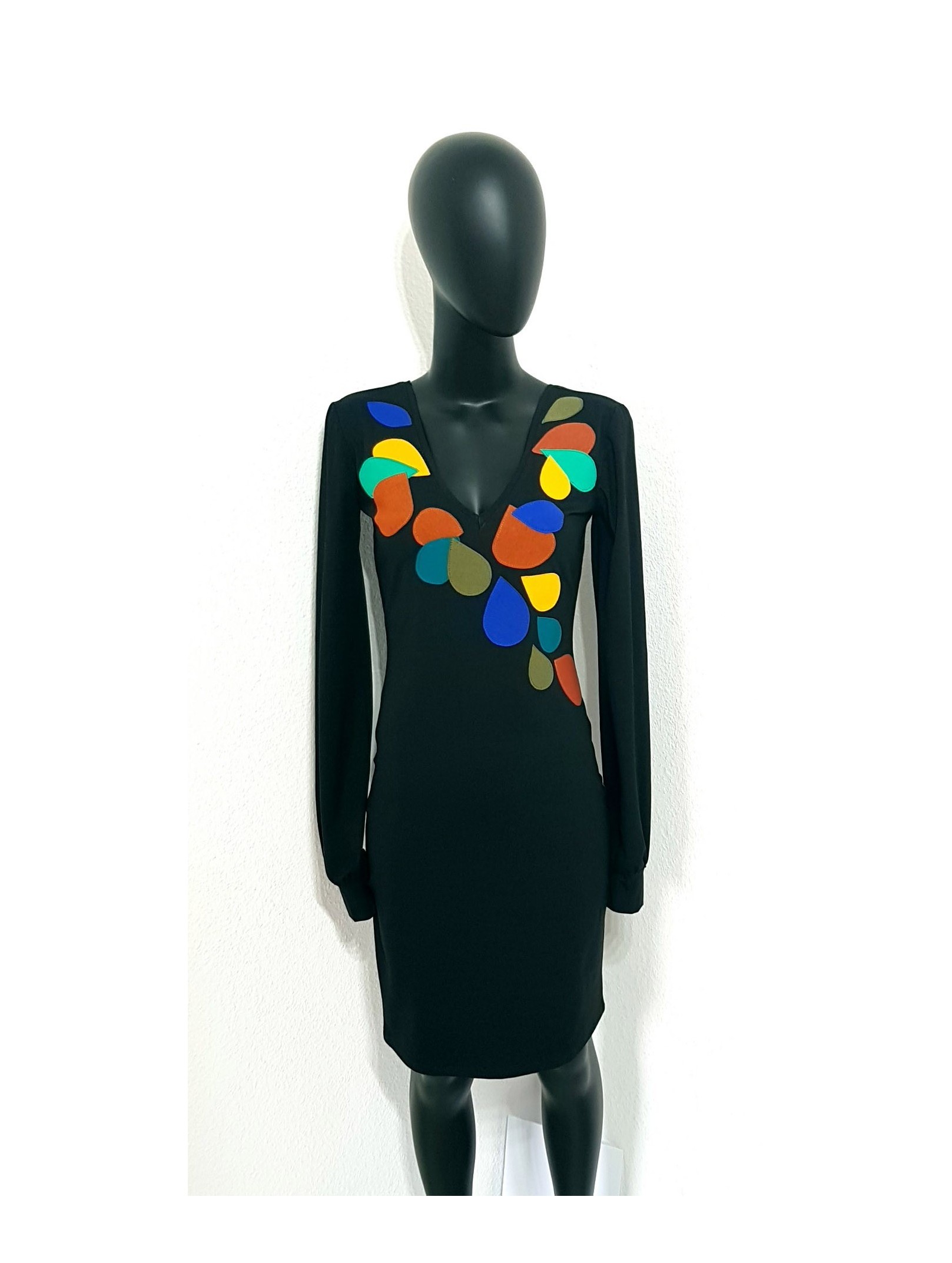 Jerseykleid in Schwarz, Bunte Blüten als Applikationen, tailliert, V-Ausschnitt, lange Glockenärmeln an Bündchen gerafft. Rücken - Uni Schwarz.