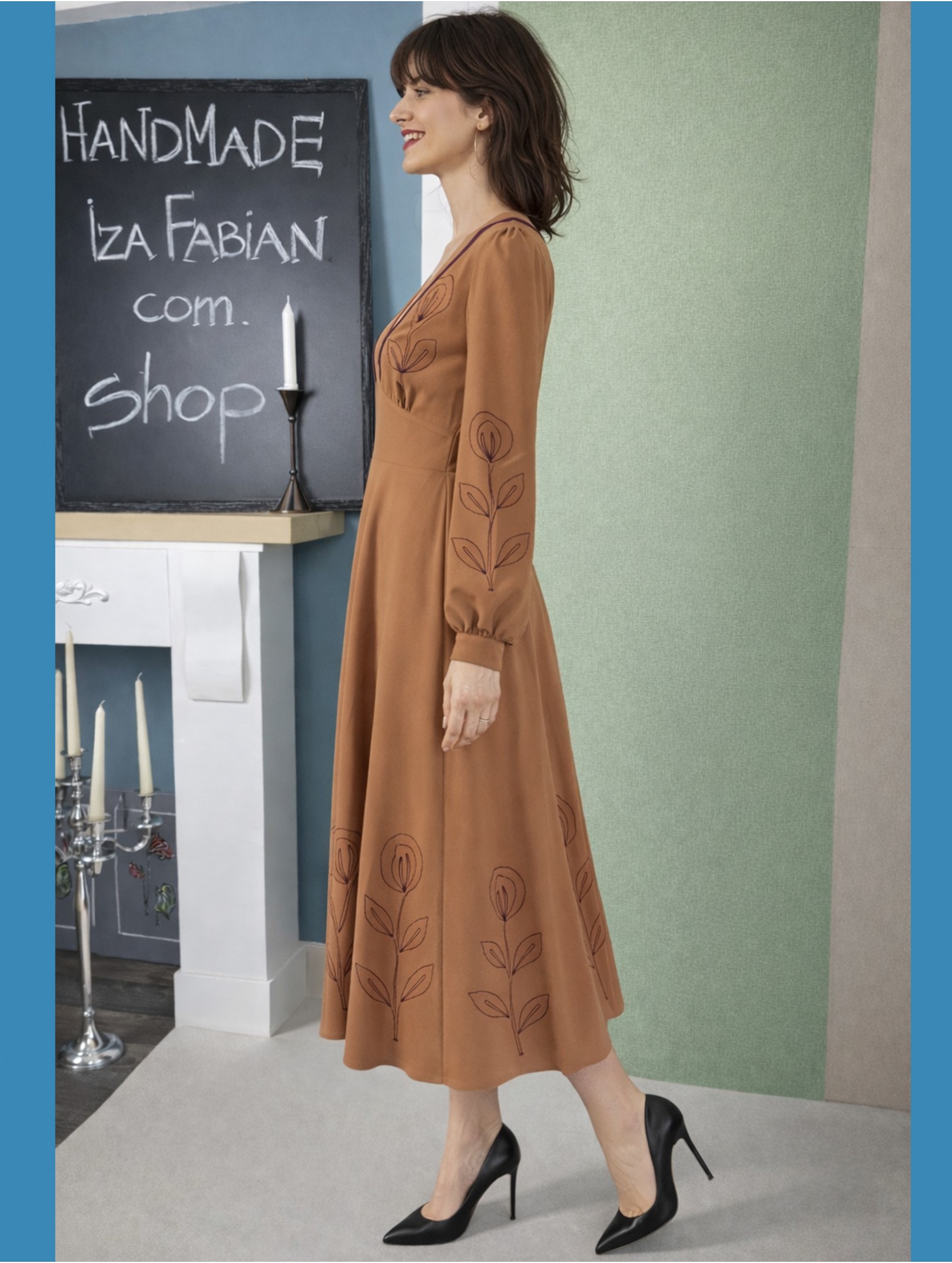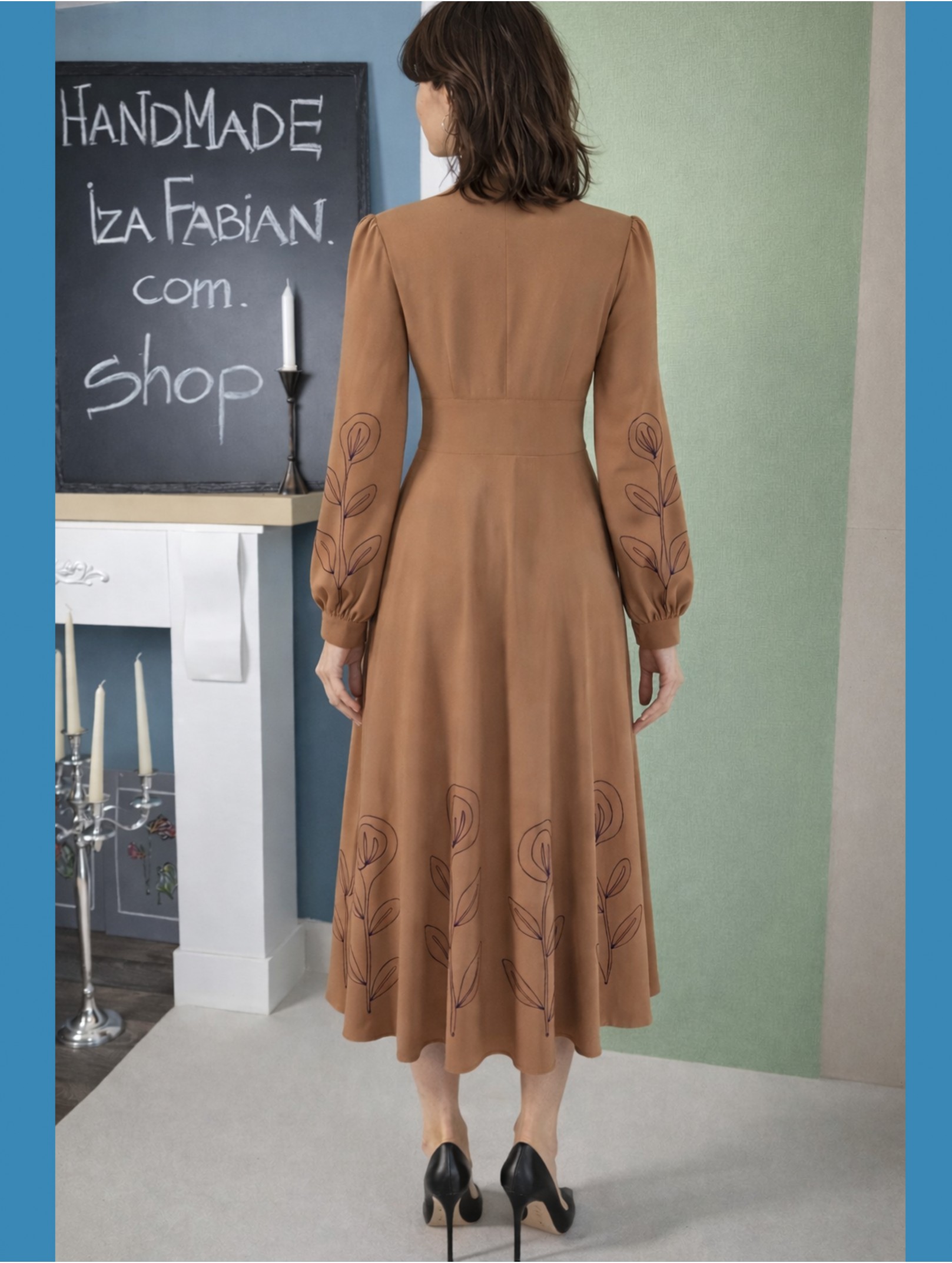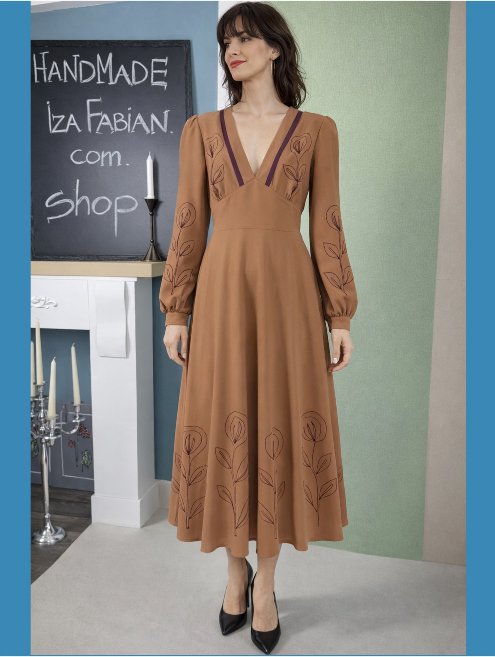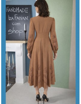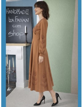 Midikleid in warmem Karamellbraun , Stickereien