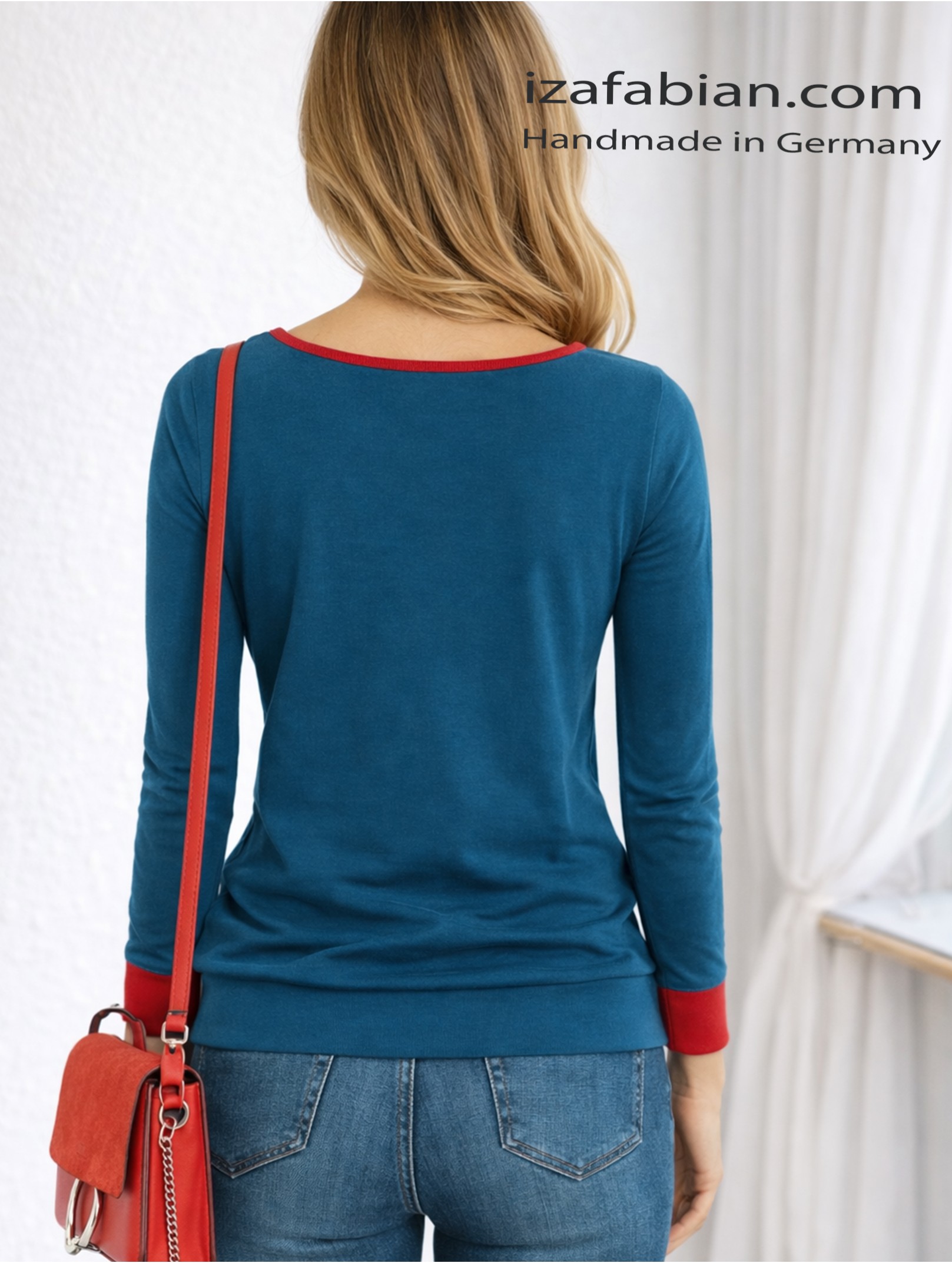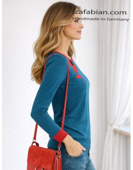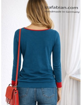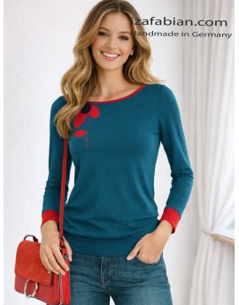 Ein ausdrucksstarkes Statement mit Retro-Flair: Dieses petrolblaue Longsleeve wird durch eine grafische Velours-Applikation in kräftigem Rot akzentuiert. Der Schnitt ist feminin und bequem zugleich – ideal für einen entspannten, urbanen Look mit besonderem Detail. Ein charakterstarkes Signature-Piece aus dem Atelier Iza Fabian.