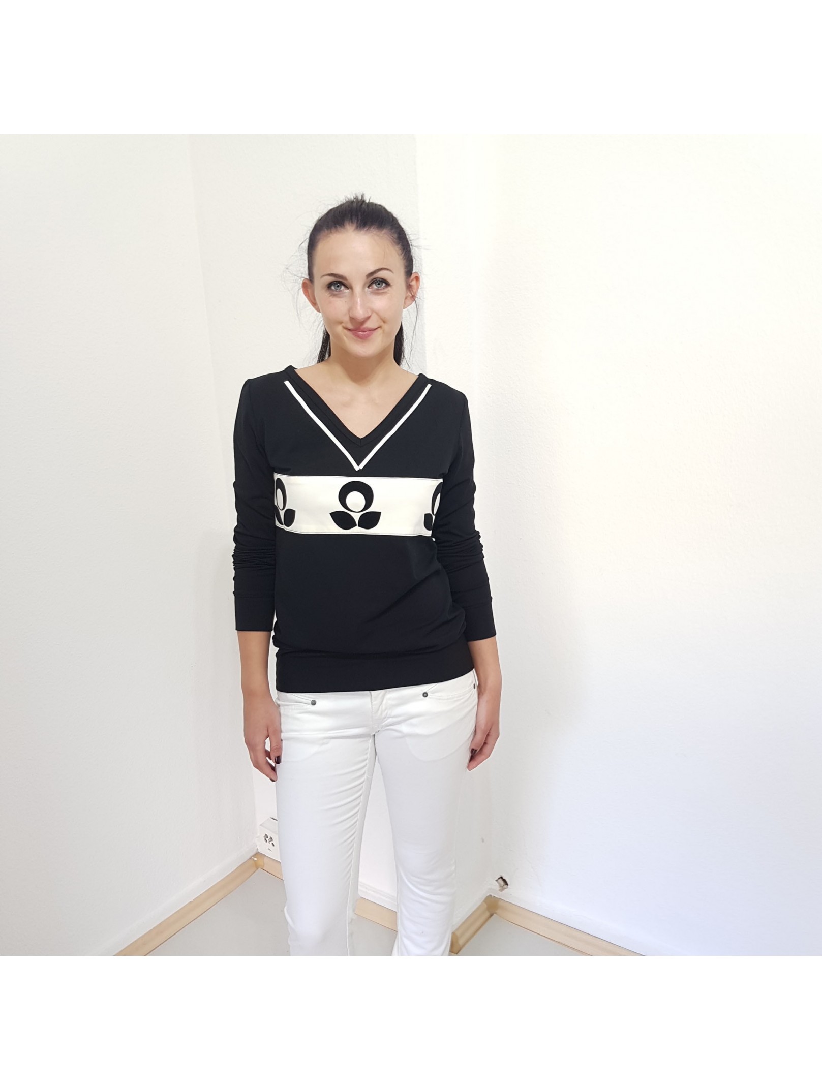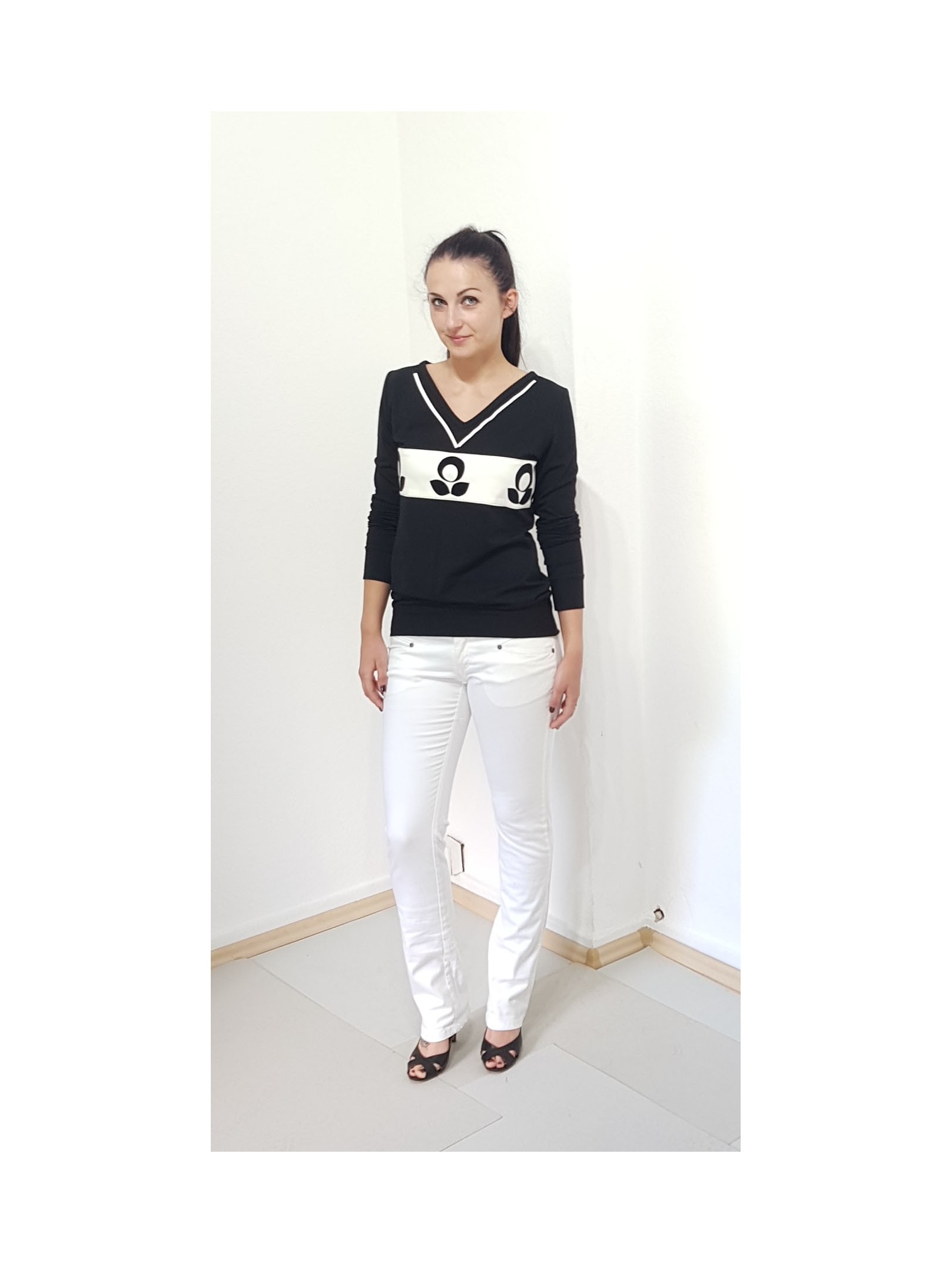 Brustpasse in Weiß mit samtigen Retro-Blumen in Schwarz als Eyecatcher