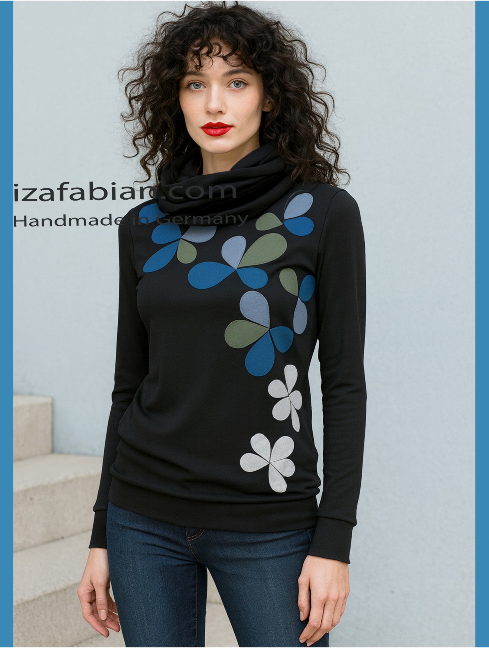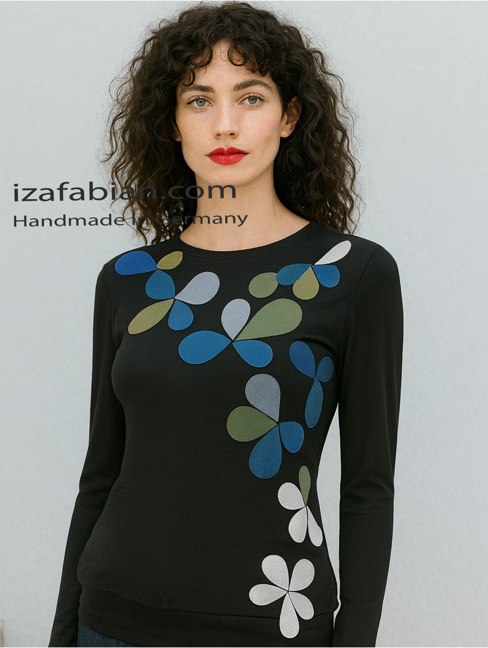 Ein moderner Blickfang mit sanfter Retro-Eleganz: Dieses Longsleeve verbindet klare Linien mit farbenfrohen Blüten-Applikationen in Blau-, Grün- und Weißtönen. Die weiche Jerseyqualität sorgt für hohen Tragekomfort – feminin, urban und stilvoll.