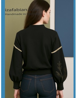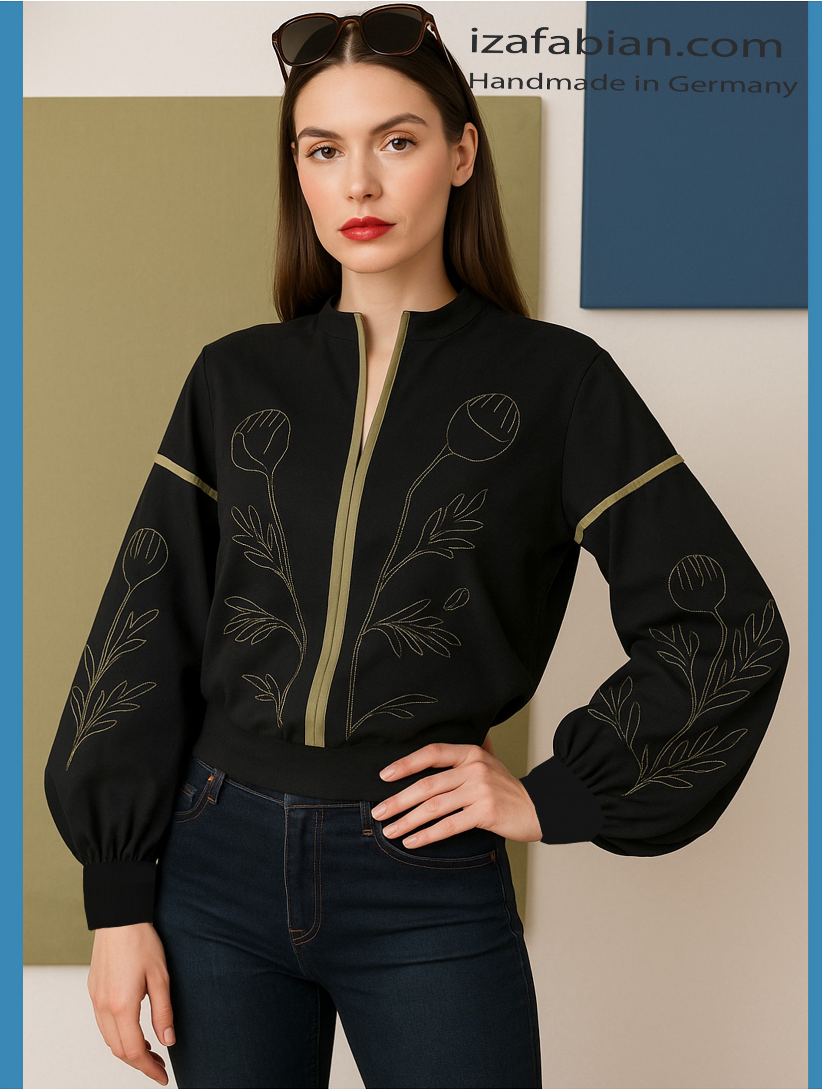 Ein außergewöhnliches Oberteil im Mix aus 70s- und 80s-Look: locker, elegant und mit verspielten Details. Der weiche Baumwolljersey sorgt für angenehmen Tragekomfort, während Stickereien in Moosgrün einen edlen Akzent setzen.