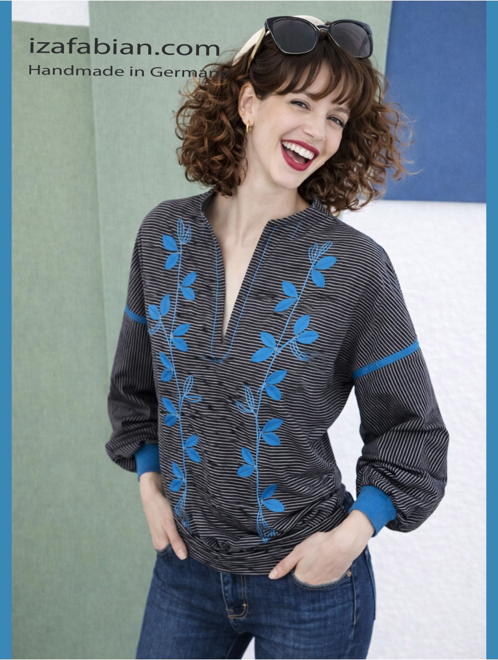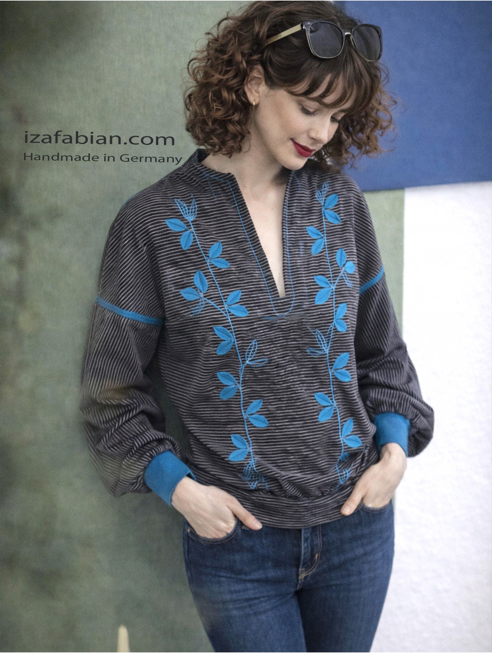 Ein außergewöhnliches Oberteil im Mix aus 70s- und 80s-Look: locker, elegant und mit verspielten Details. Der weiche, fein gestreifte Baumwolljersey sorgt für angenehmen Tragekomfort, während Stickereien in Türkisblau einen edlen Akzent setzen.