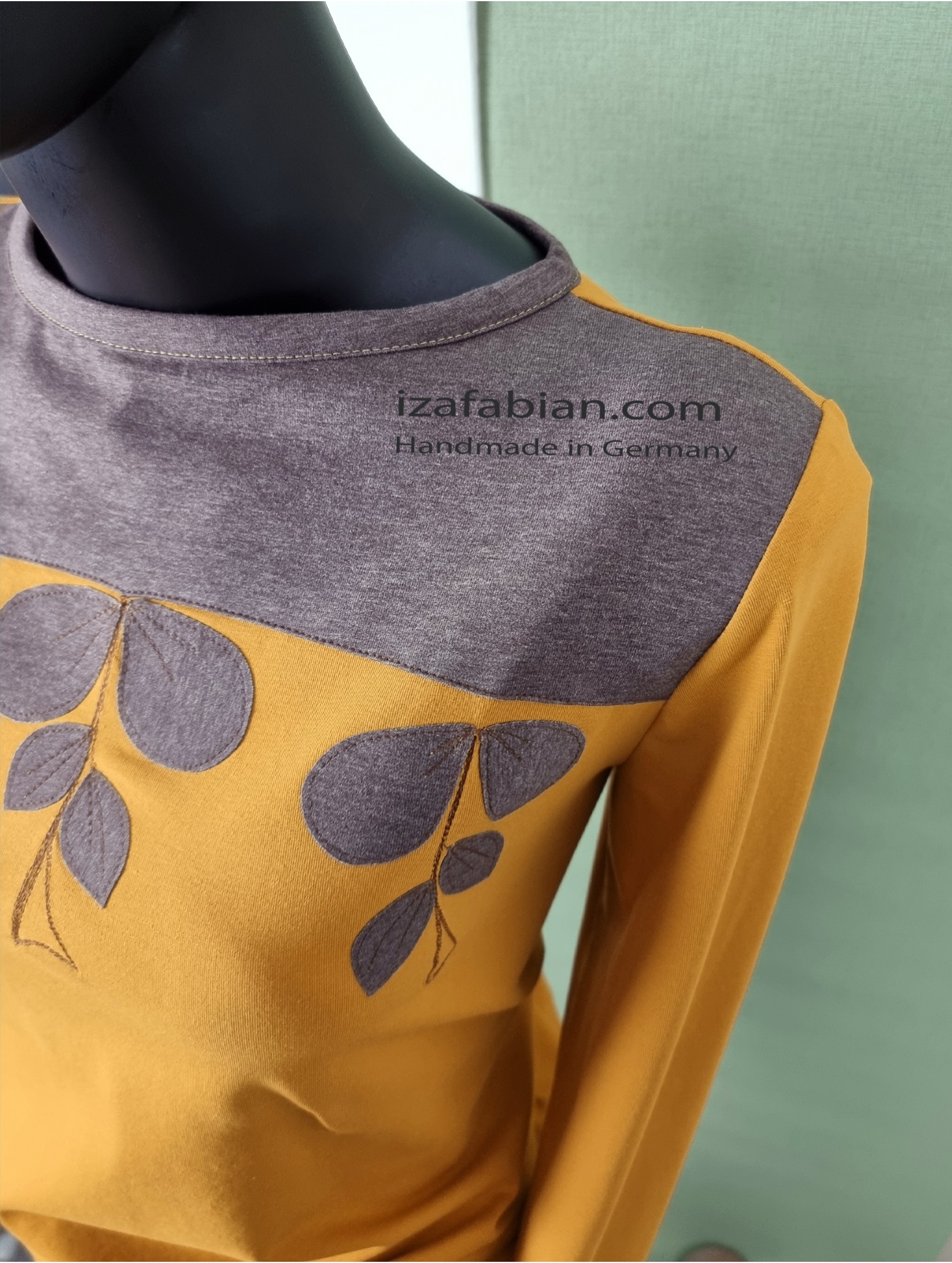 • Rundhals-Ausschnitt mit Passe und Stoffapplikationen auf der Front