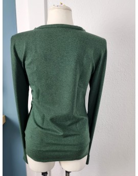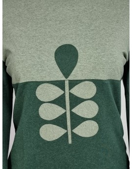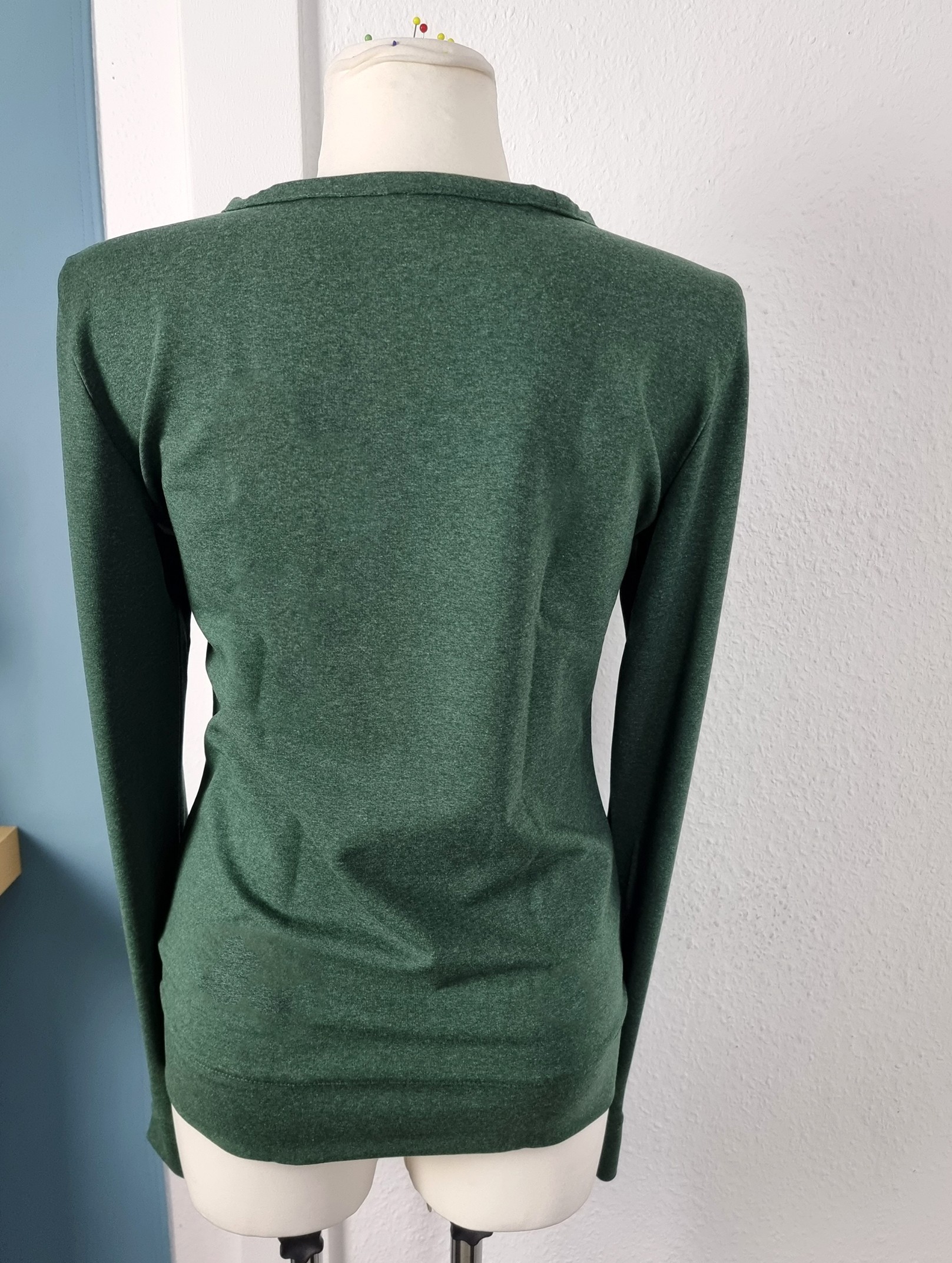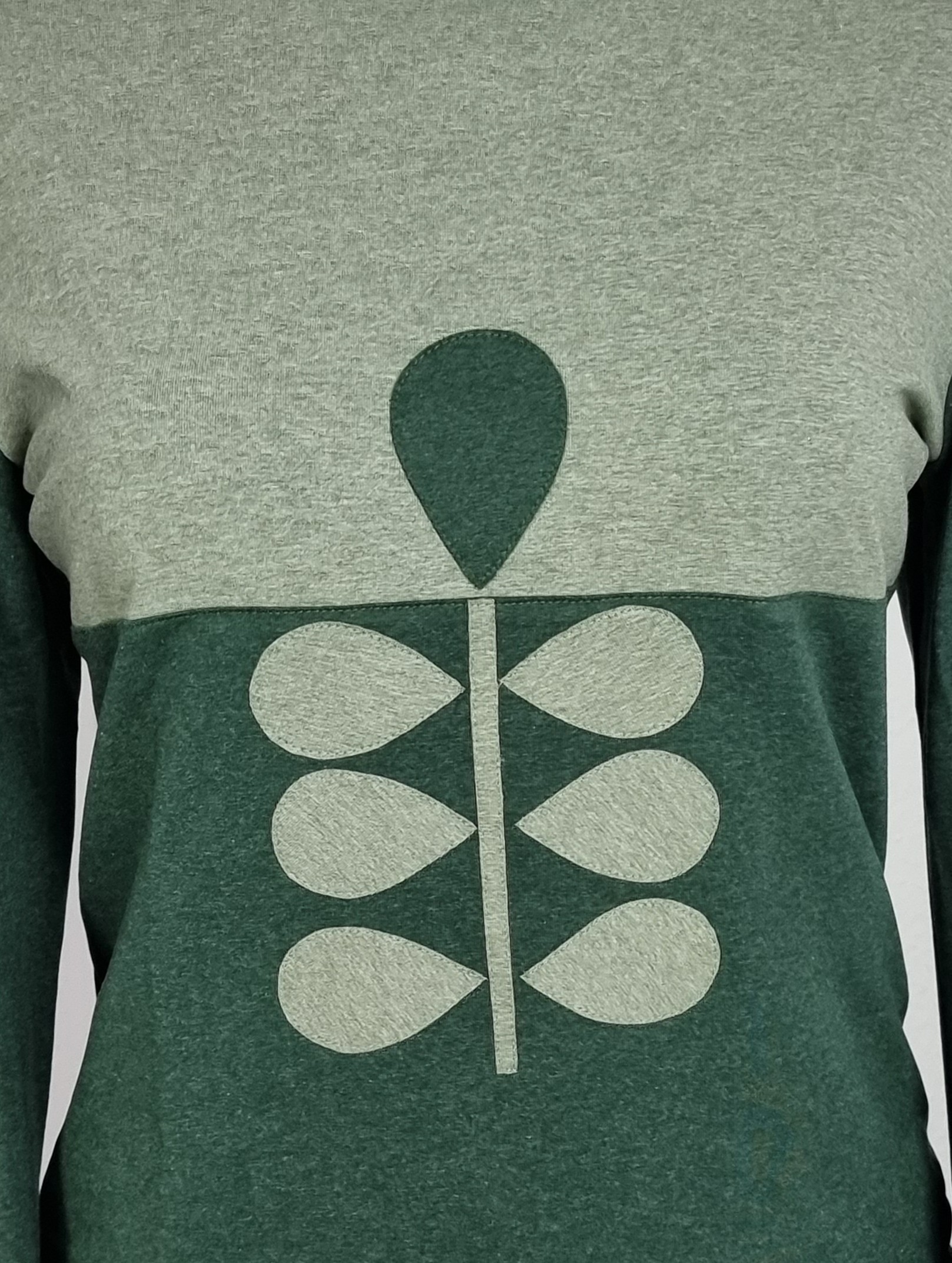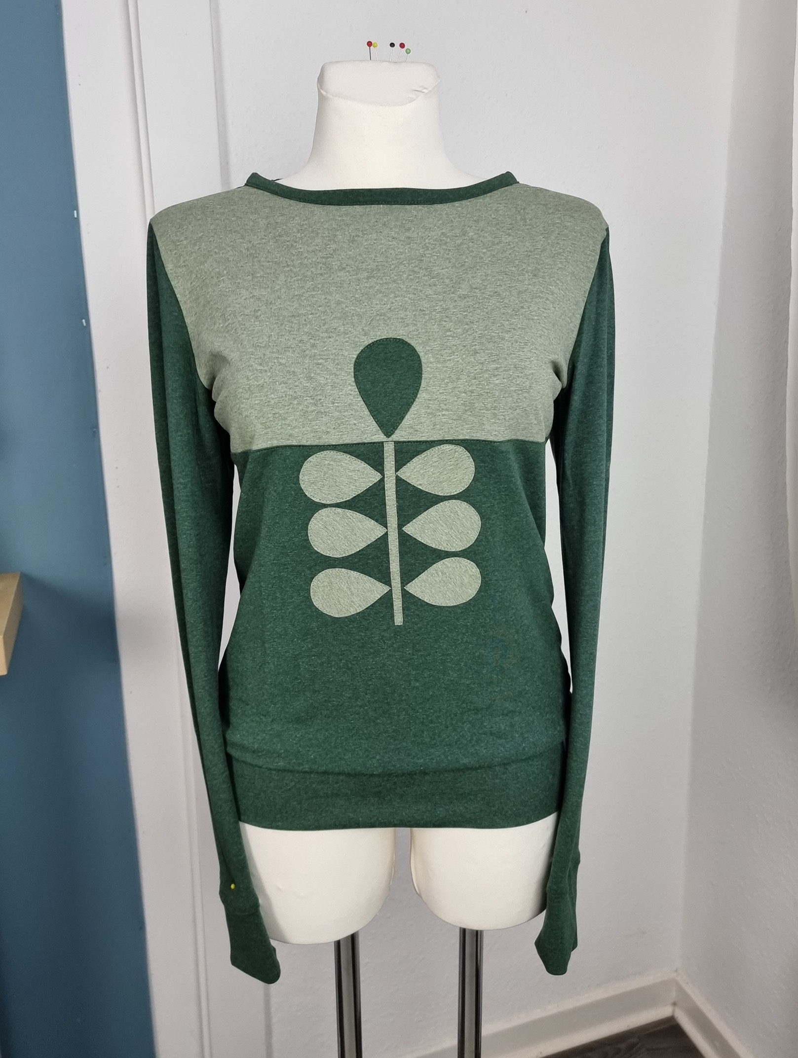 Handmade Damen Sweater – Zweifarbige Front Olive & Tannengrün, Retro Applikation