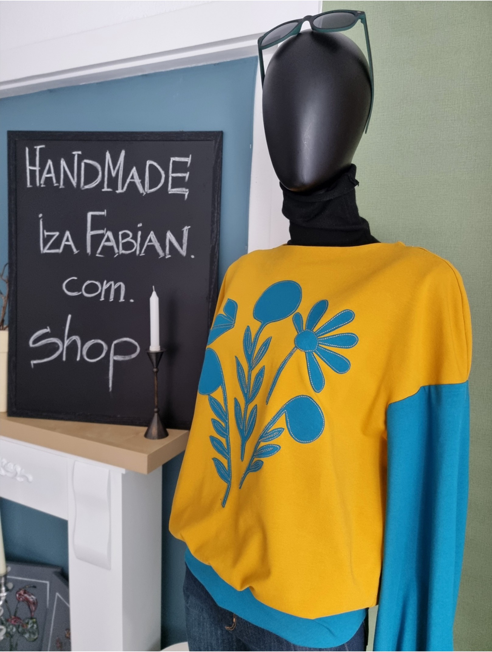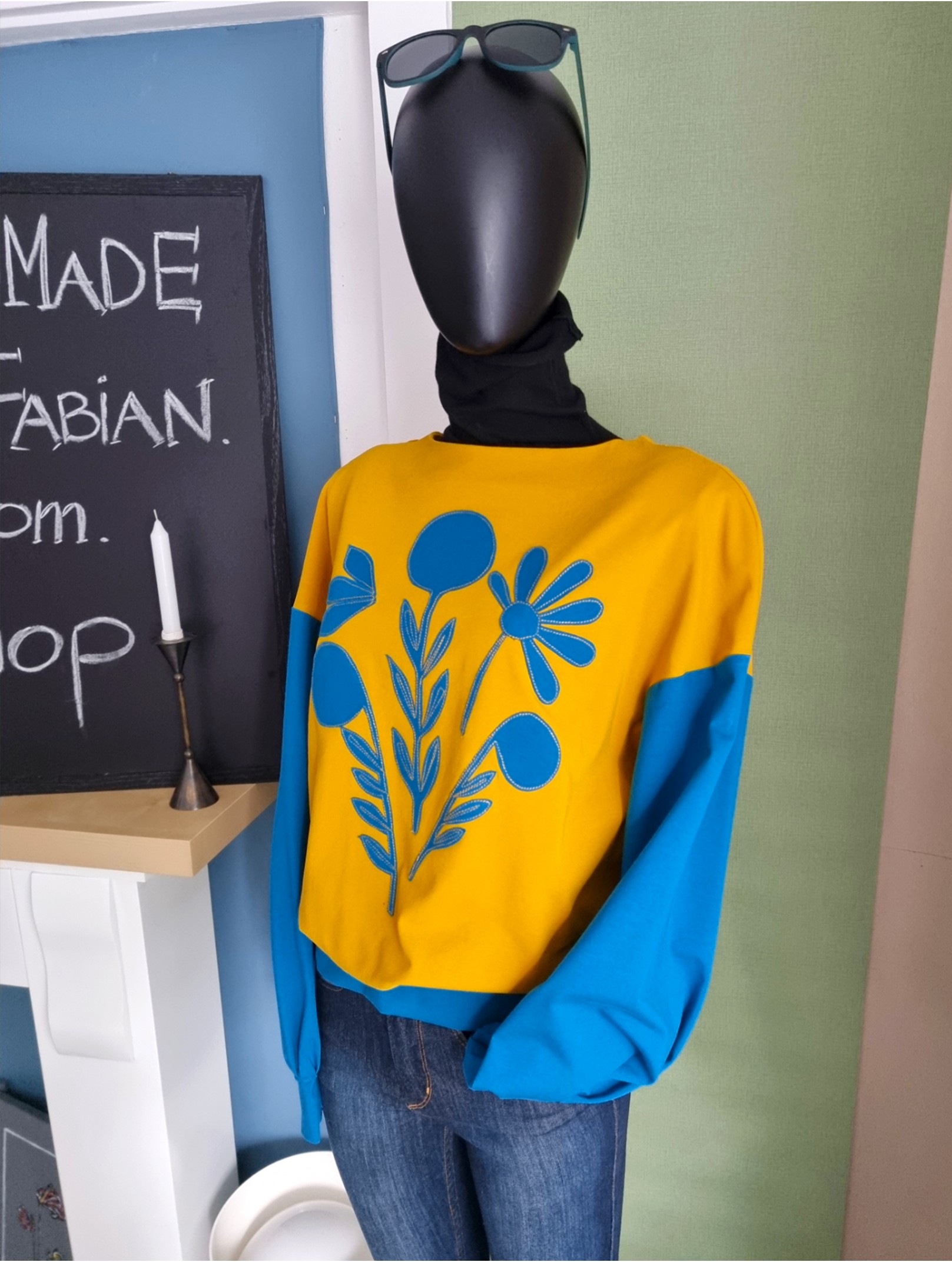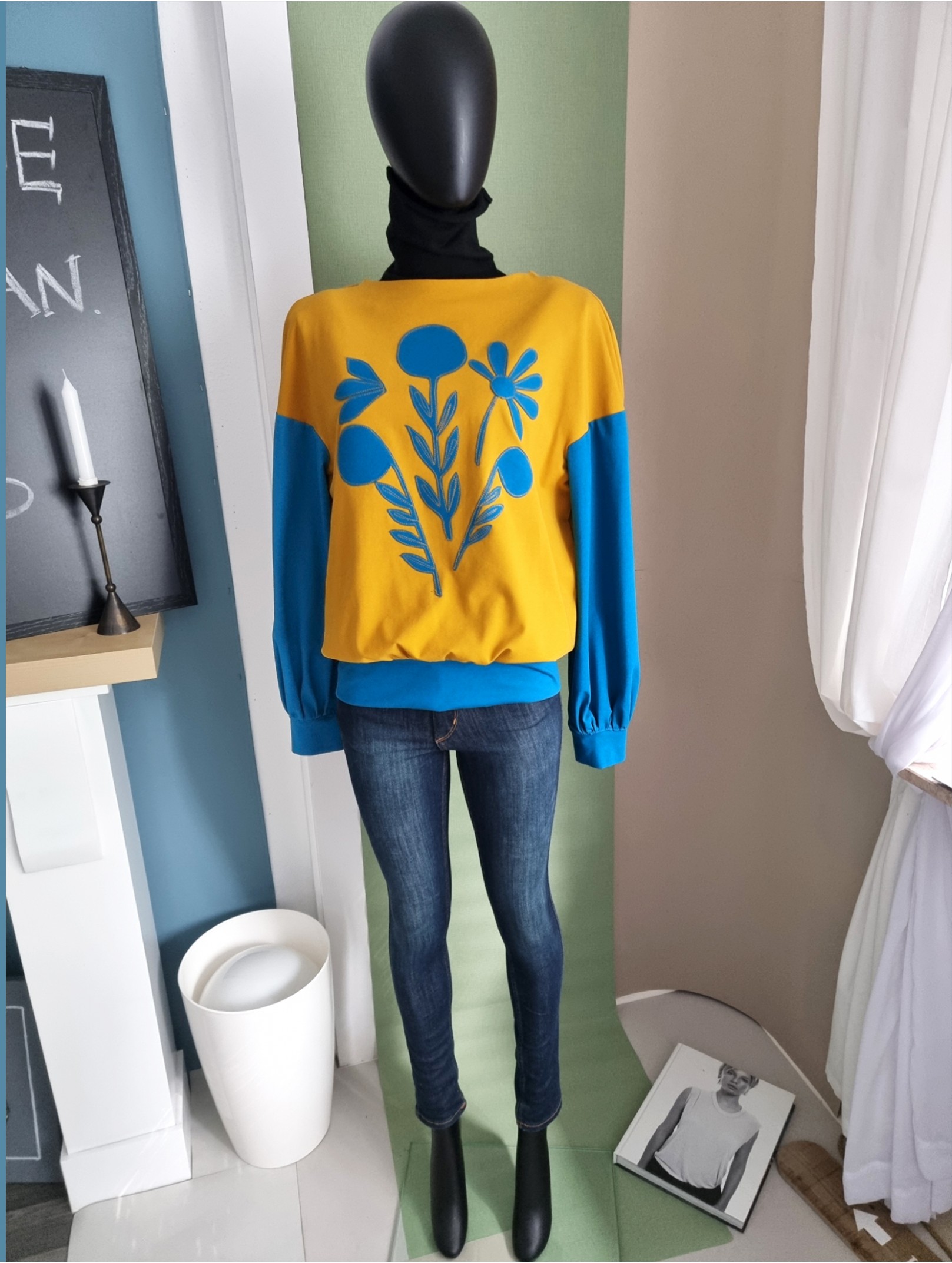 Ein Statement-Piece mit Retro-Flair: Dieses Longsleeve kombiniert kräftiges Ockergelb mit sattem Türkis und wird durch große, applizierte Blumen in der Front zum Blickfang. Die lockere Passform mit angesetzter Schulterpartie sorgt für Komfort, während die weiten Ärmel in Glockenform mit gerafftem Bündchen einen modernen Akzent setzen.