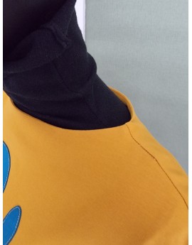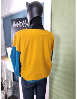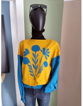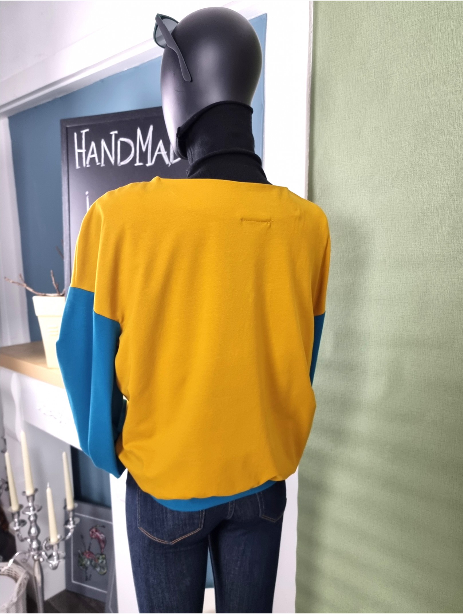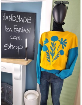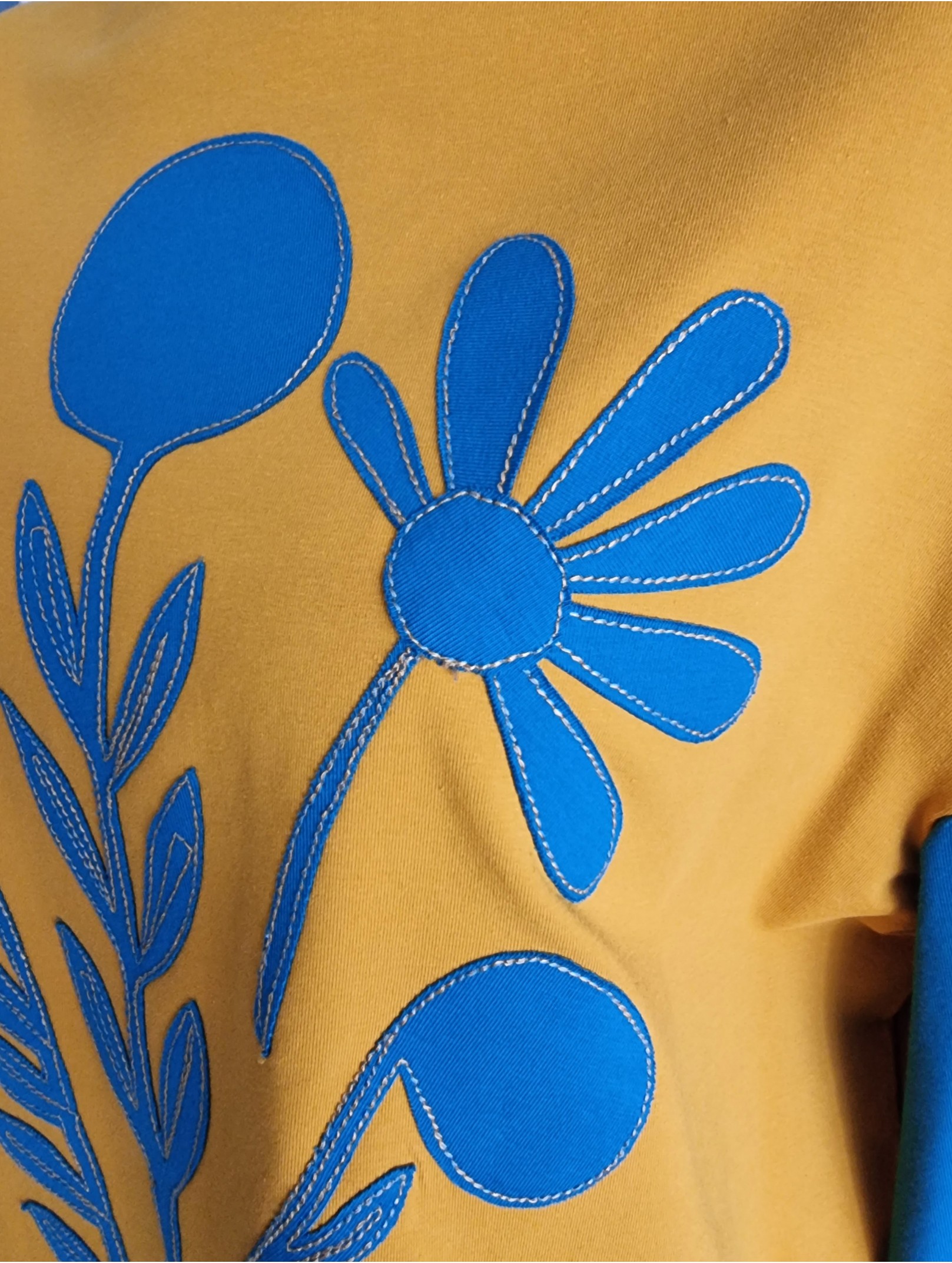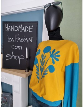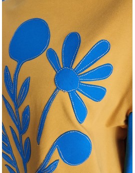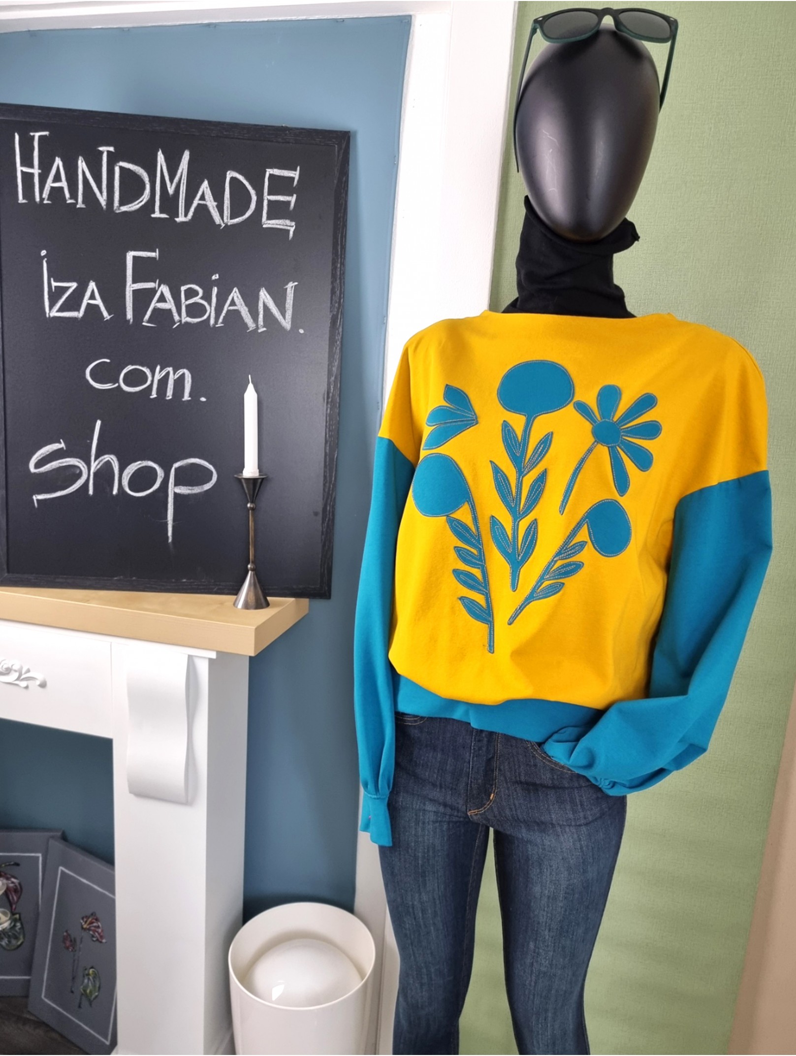 Ein Statement-Piece mit Retro-Flair: Dieses Longsleeve kombiniert kräftiges Ockergelb mit sattem Türkis und wird durch große, applizierte Blumen in der Front zum Blickfang. Die lockere Passform mit angesetzter Schulterpartie sorgt für Komfort, während die weiten Ärmel in Glockenform mit gerafftem Bündchen einen modernen Akzent setzen.